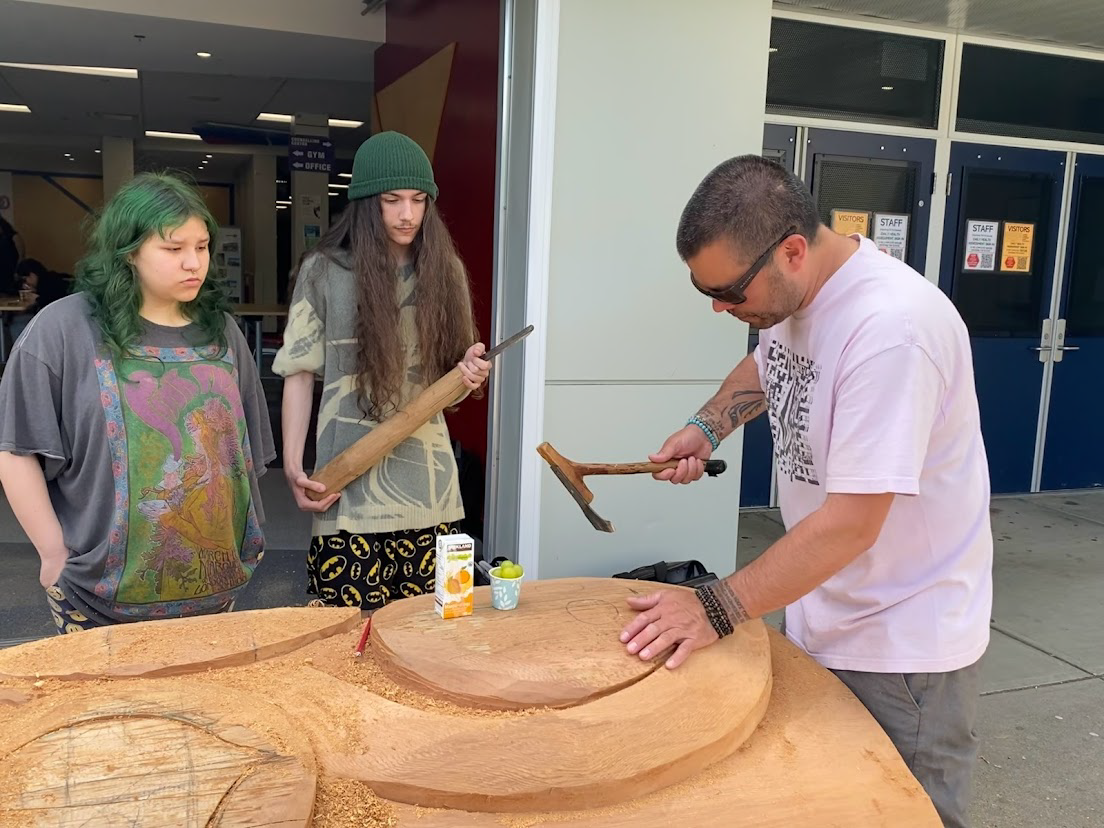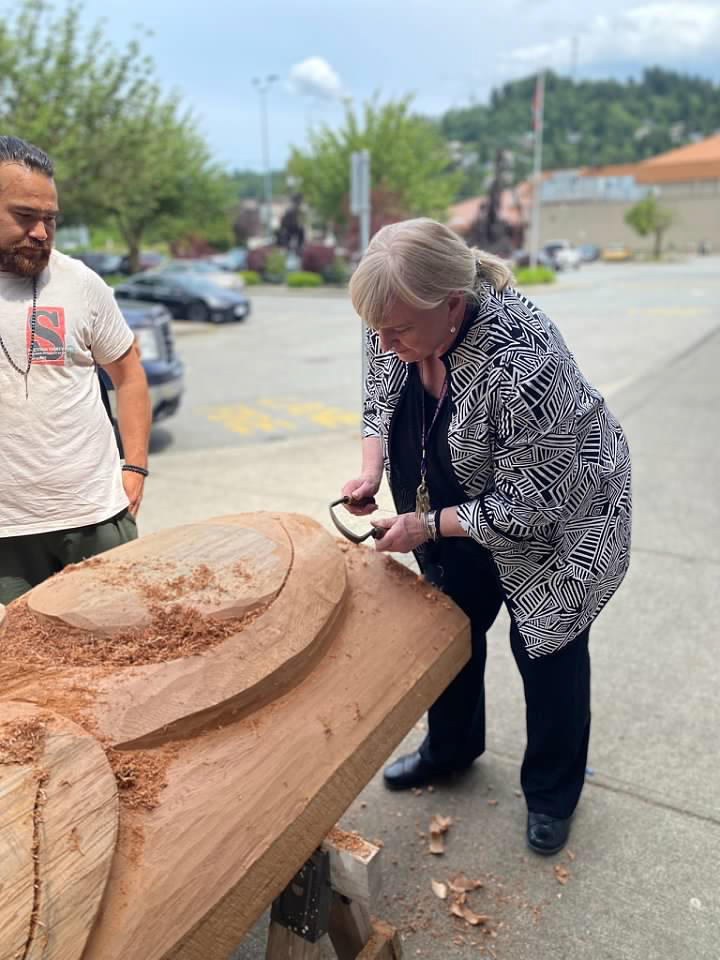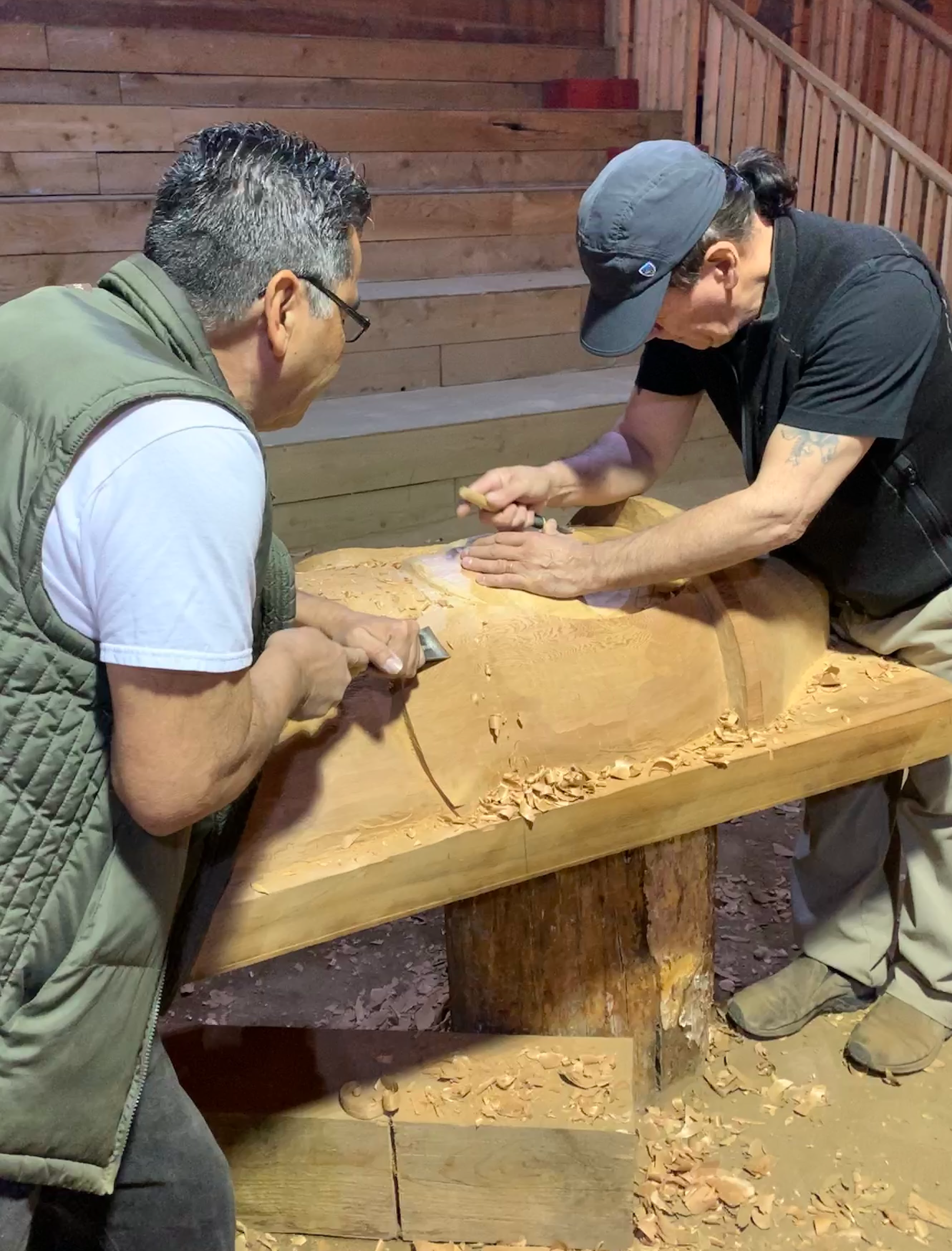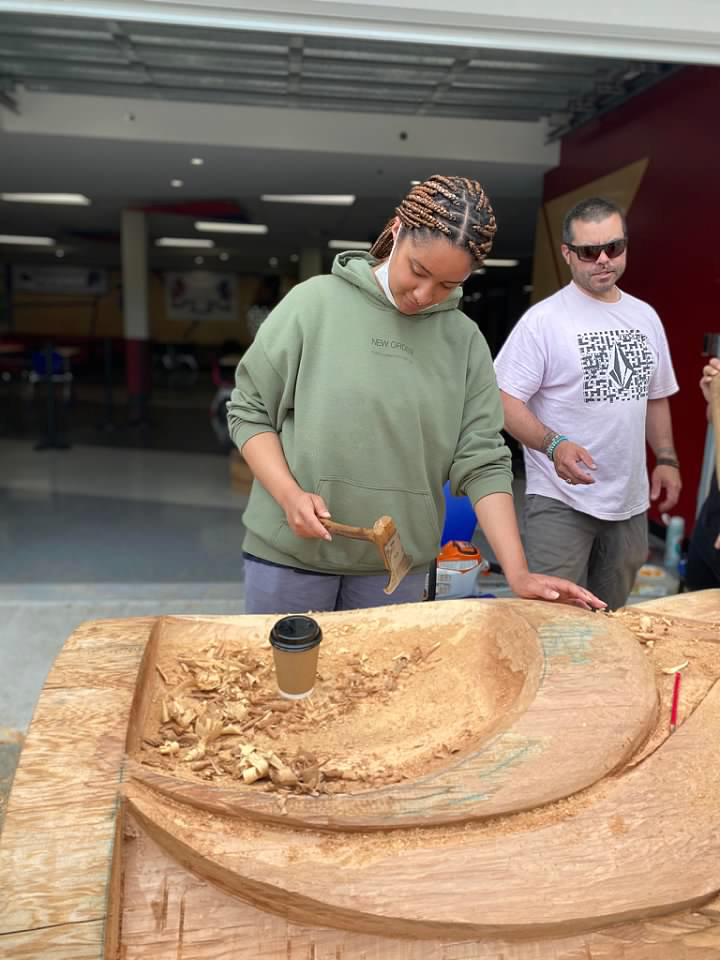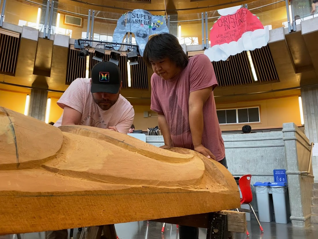 Raphael Silver and Kelsey Ned engaged the public and the schools with the Education Welcome Figure: Semá:th First Nation Longhouse, Havard Deeper Learning Dozen, Wa;cipi C'ante Was'te Yuhapi Powwow, Bakerview Centre for Learning, Yale Secondary, Abby Senior Secondary, and Mouat Secondary. In doing so, they engaged with, inspired, connected to, and shared knowledge and carving experiences with many youths and adults.