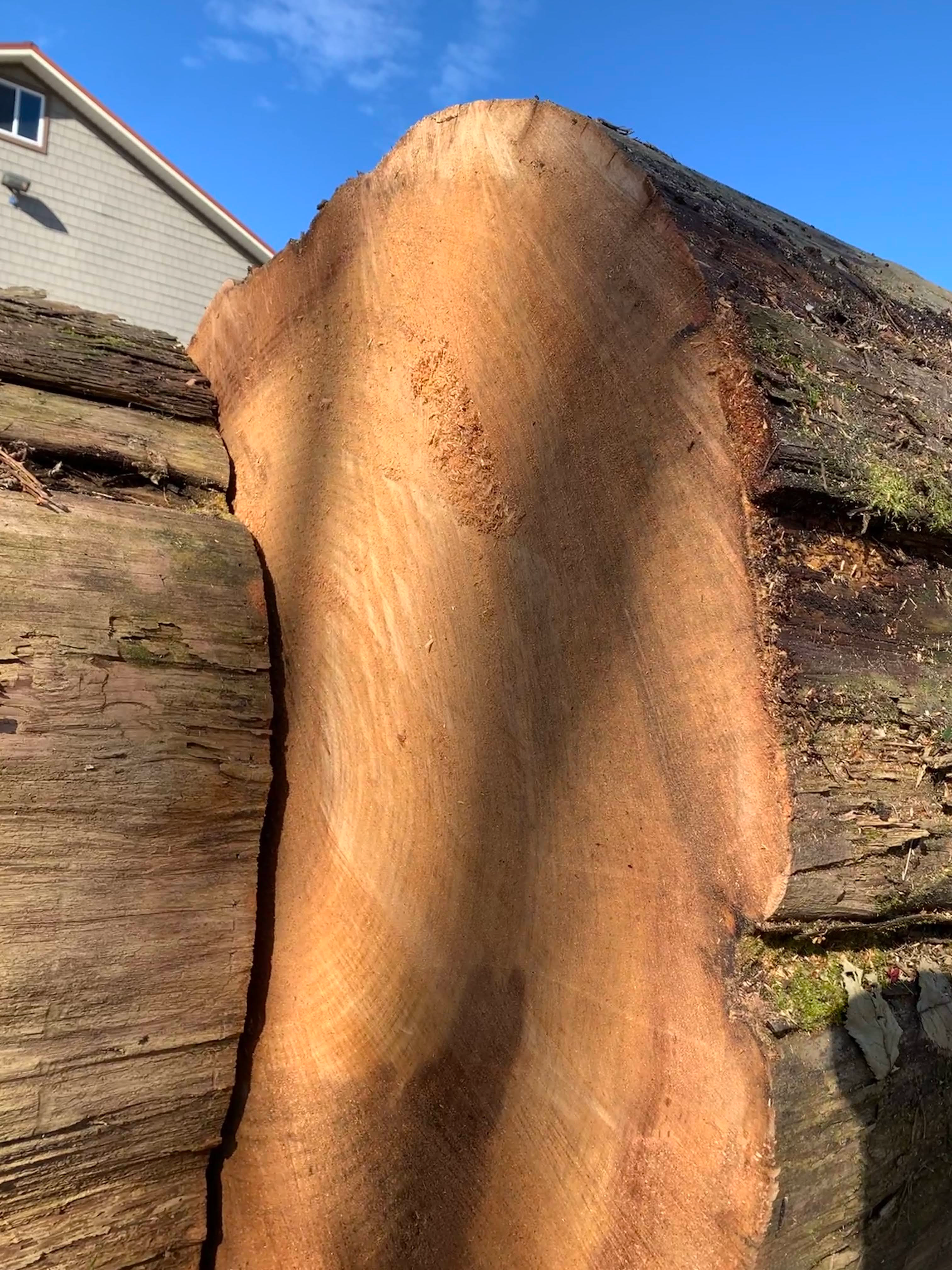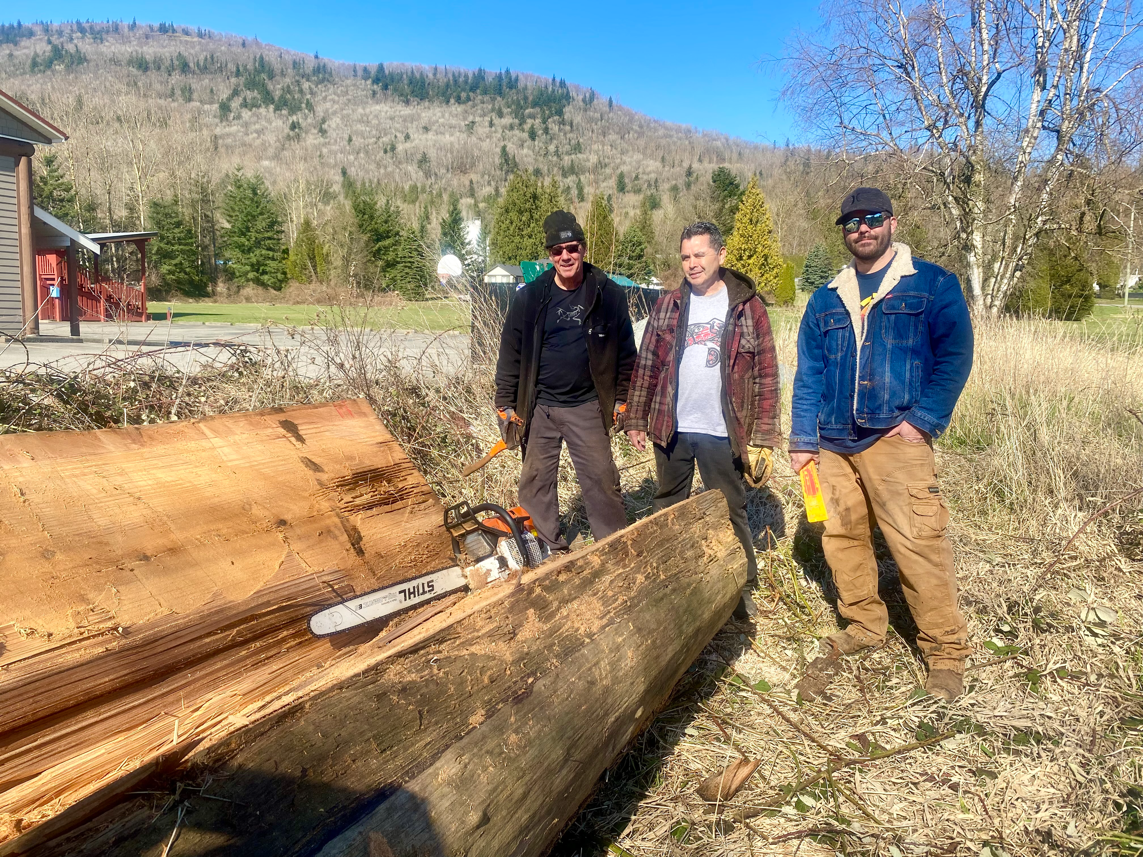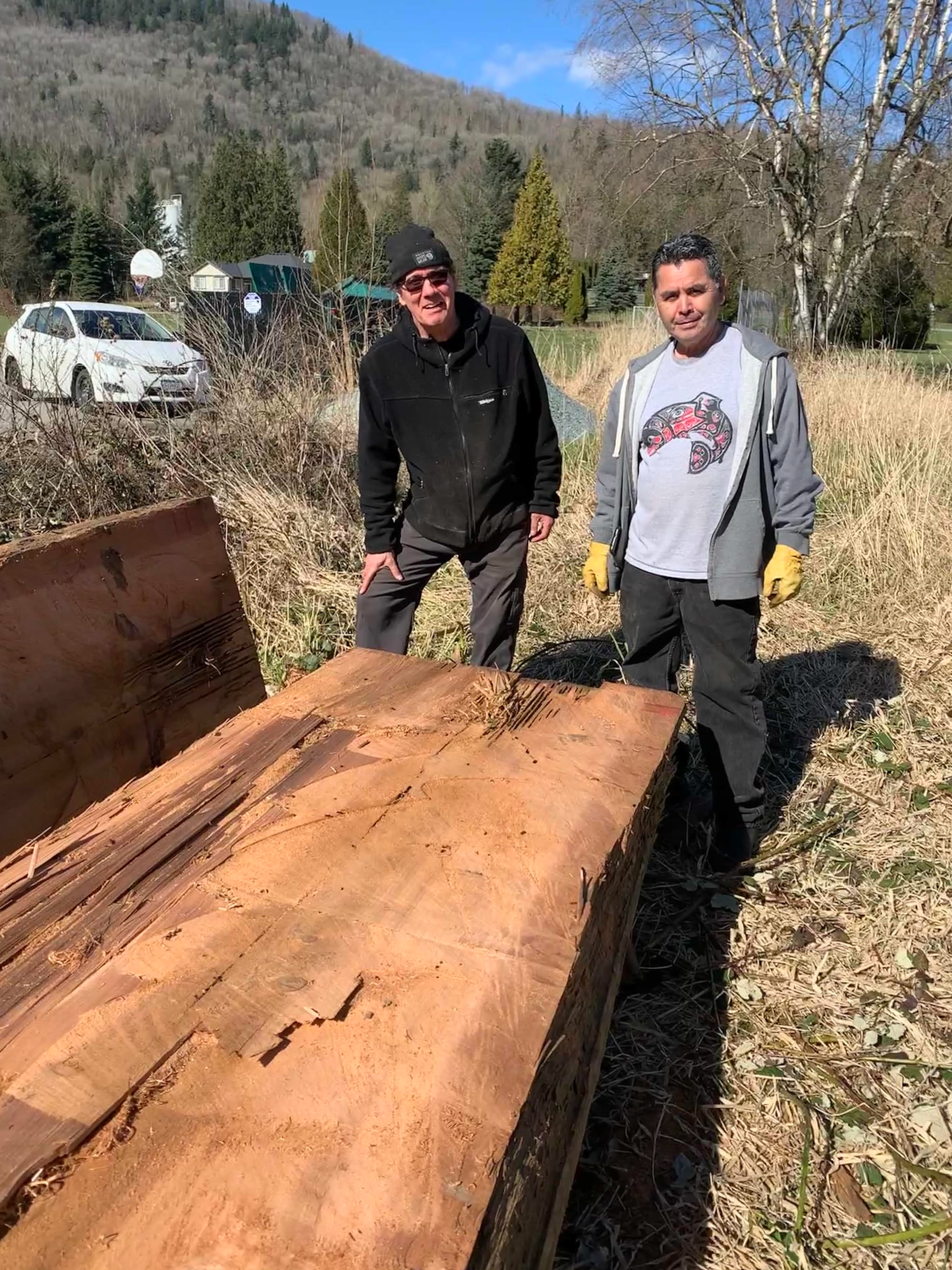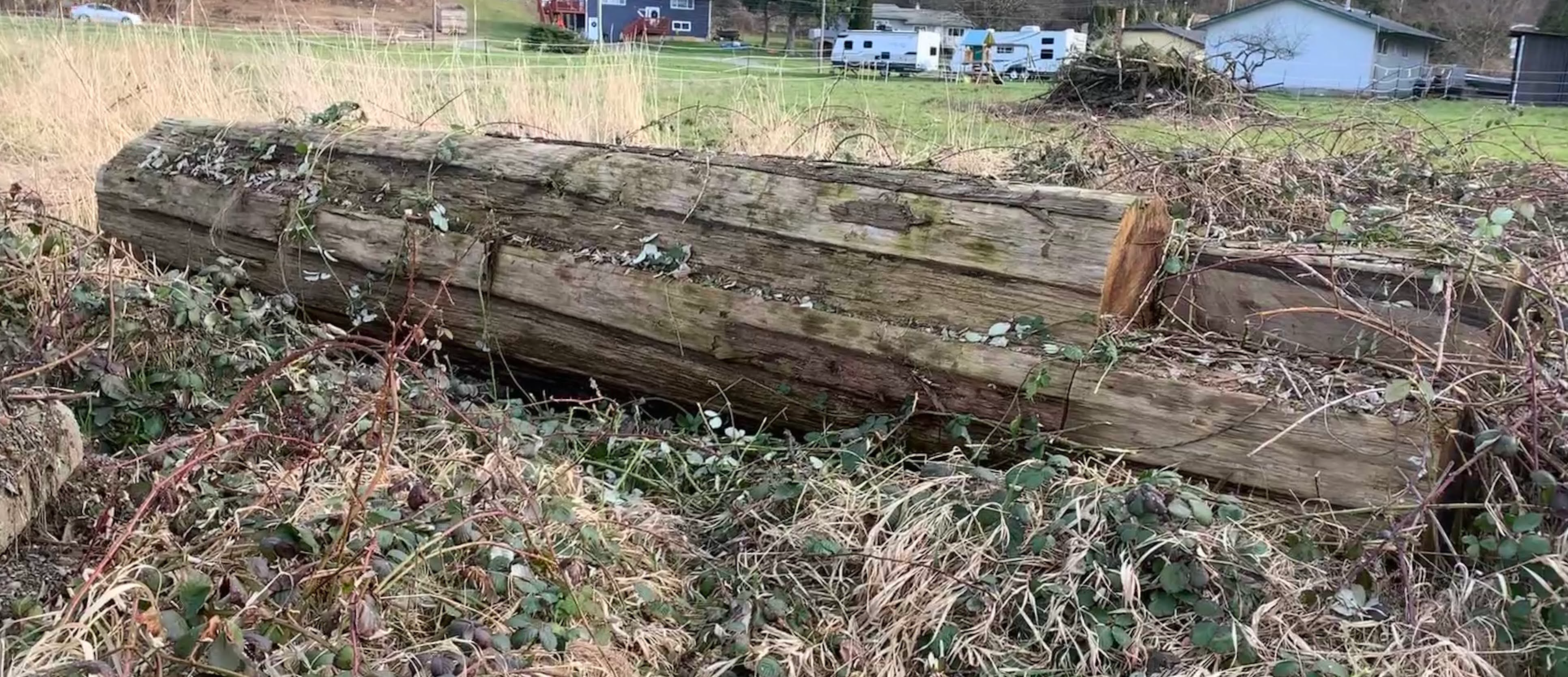 This Cedar Tree will be carved into two House Posts and a Welcome Figure that will then live at the Abbotsford School District Board Office. The Cedar Tree comes from Powell River and has been resting at Semá:th First Nation for about 10 years. The Blackberry bushes have protected it over the years. The Cedar Tree is so resilient that it can be carved 60 years after it has been unrooted.