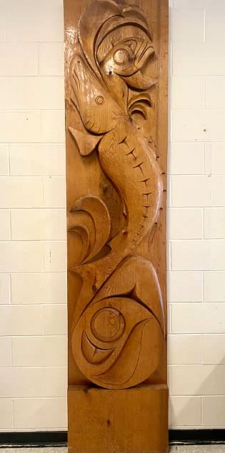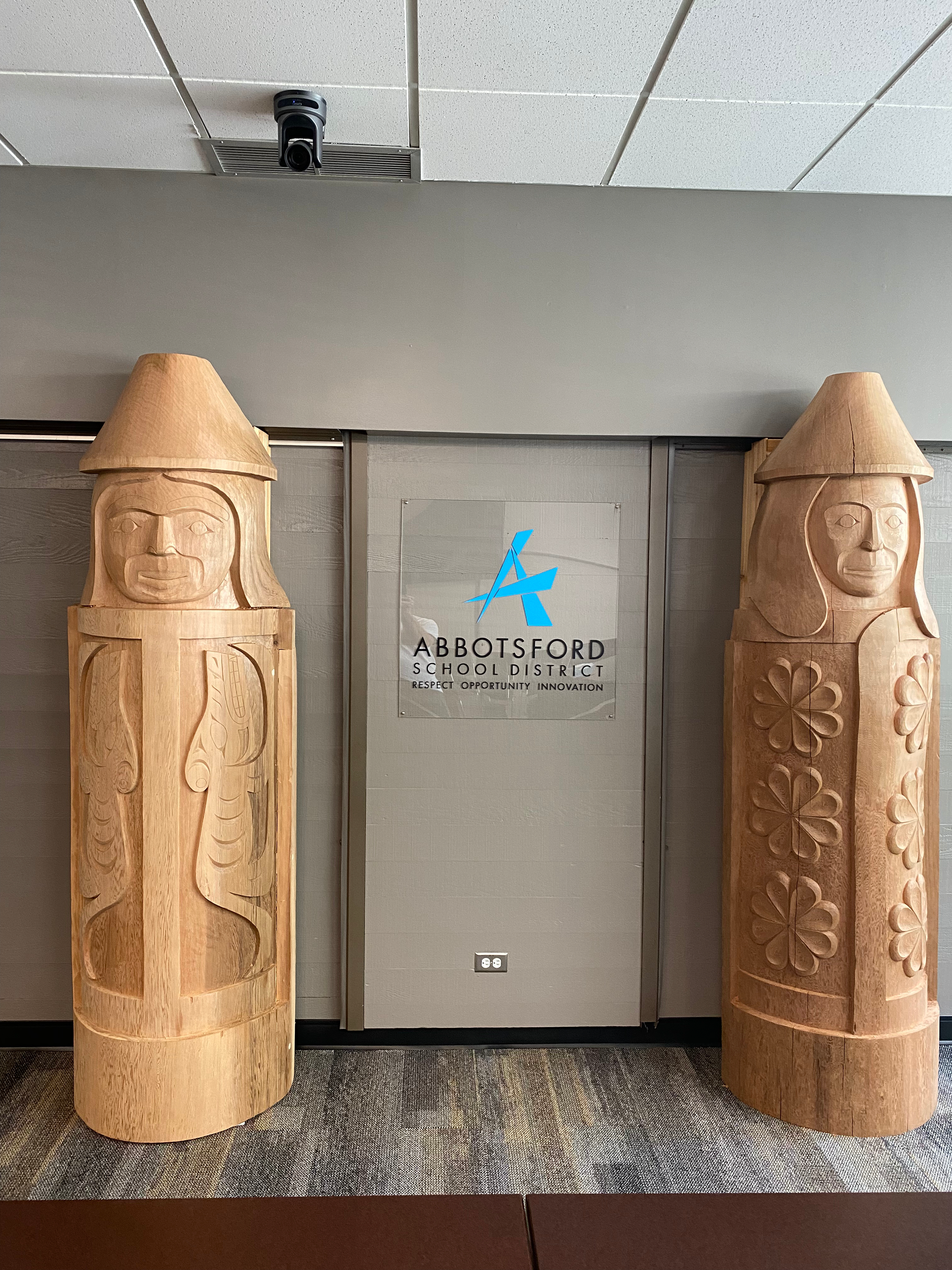 On National Indigenous Peoples Day, June 21, 2022, the School Trustees held a ceremony to honour the carvers and to brush off the posts- filling our hearts and minds. Chris Silver opened for us, Perry Smith was the Speaker, Raphael Silver and Ray Silver were the honourees. Witnesses spoke to the work and then we filled our bodies up with wonderfully cooked salmon, rice, salad, and bannock.