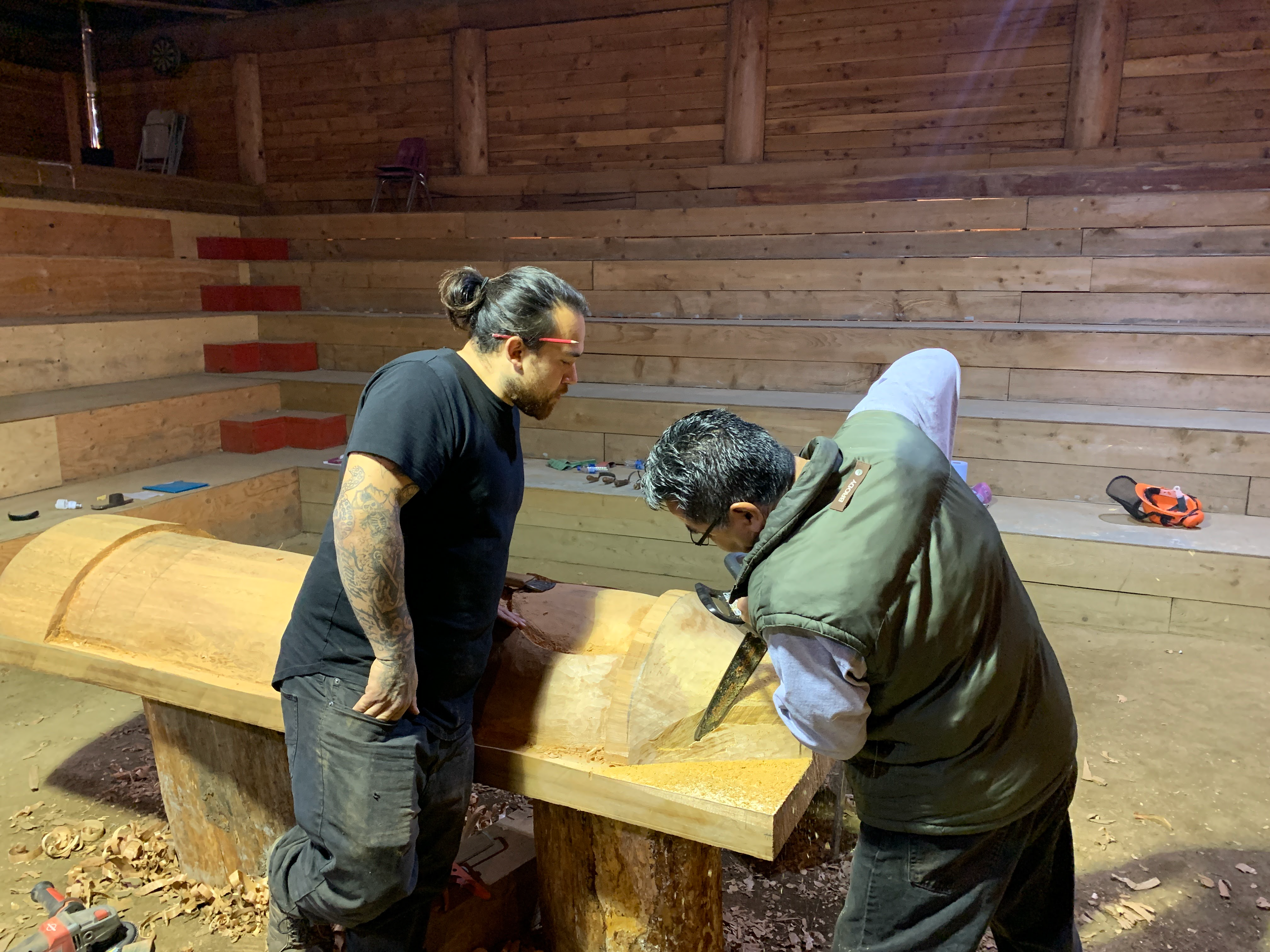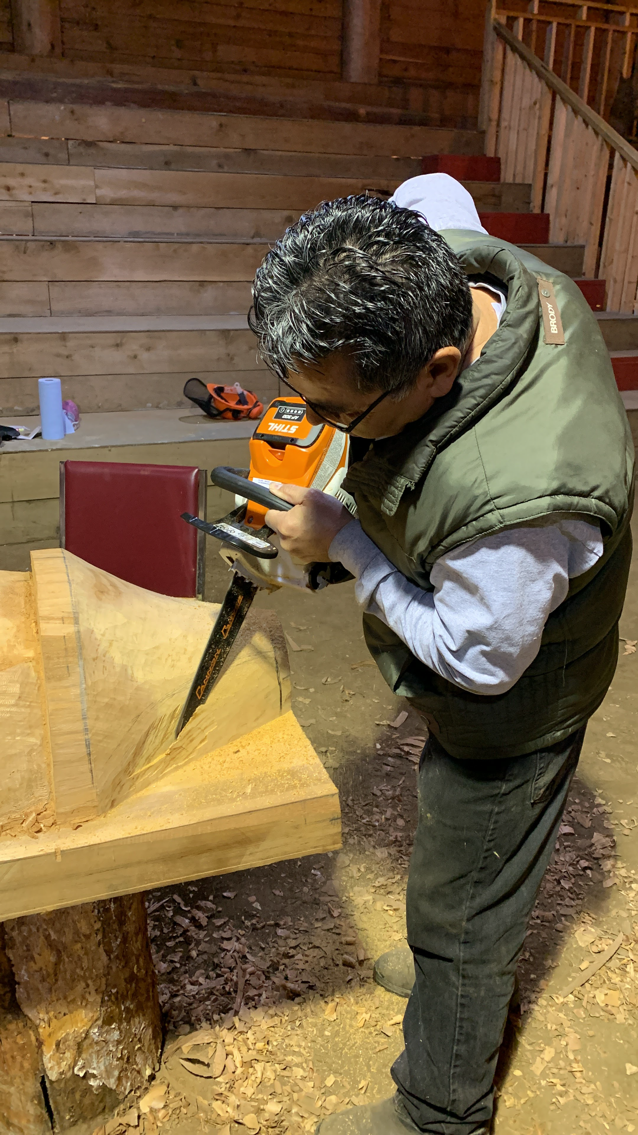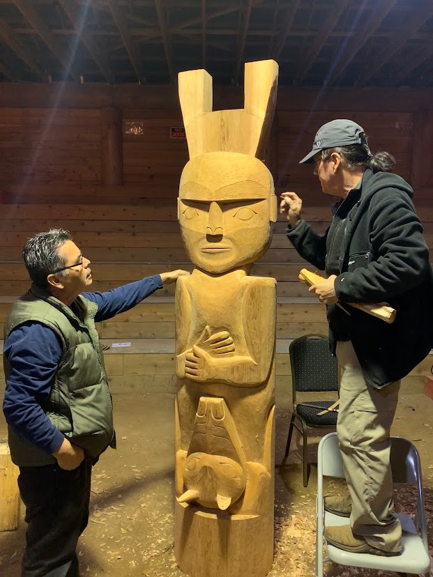 Today carved house posts may not necessarily be a part of the structure of the building, but may instead show respect to the tradition of carving and of house posts. The house posts that are being carved for this project will be of this nature. Respecting and honoring the tradition, art, and family, but will not be supporting the physical structure of the Board Office.