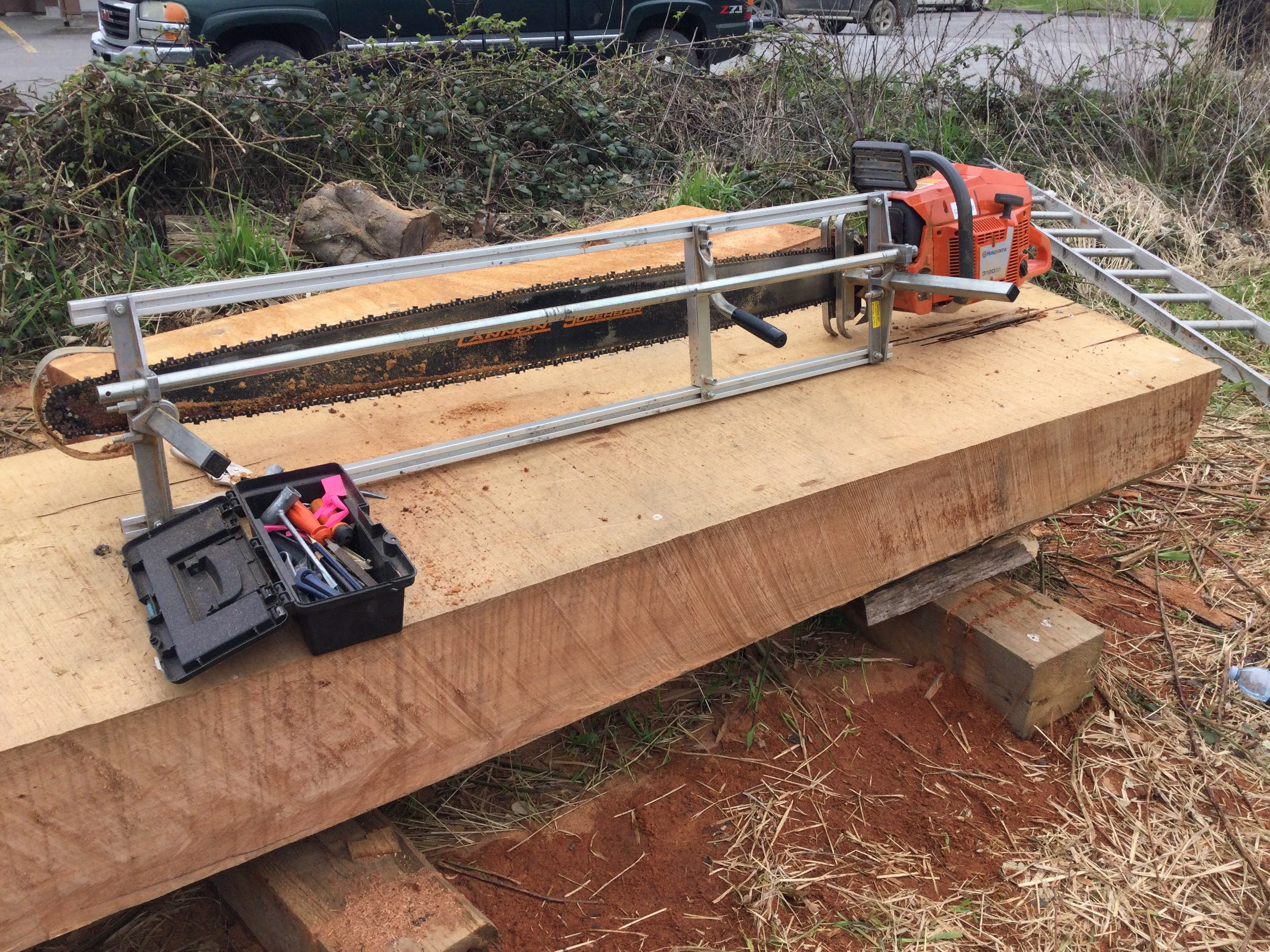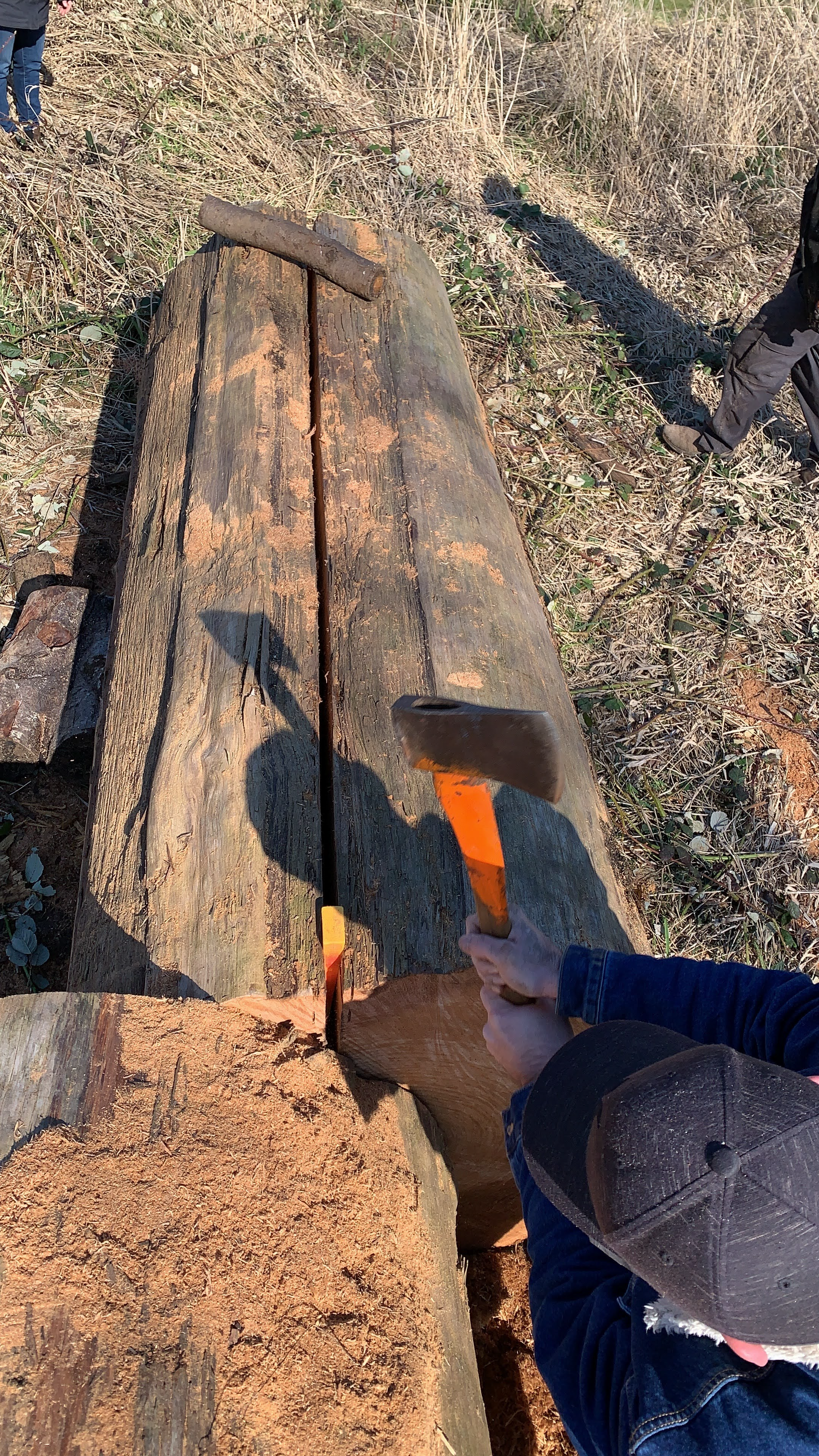 Here you see Mike Epp using a chainsaw to cut the Cedar into an 8-foot piece (Why do you think it might be cut to that length?). You can see at the top that there are wedges to hold some space as he cuts down through the tree.