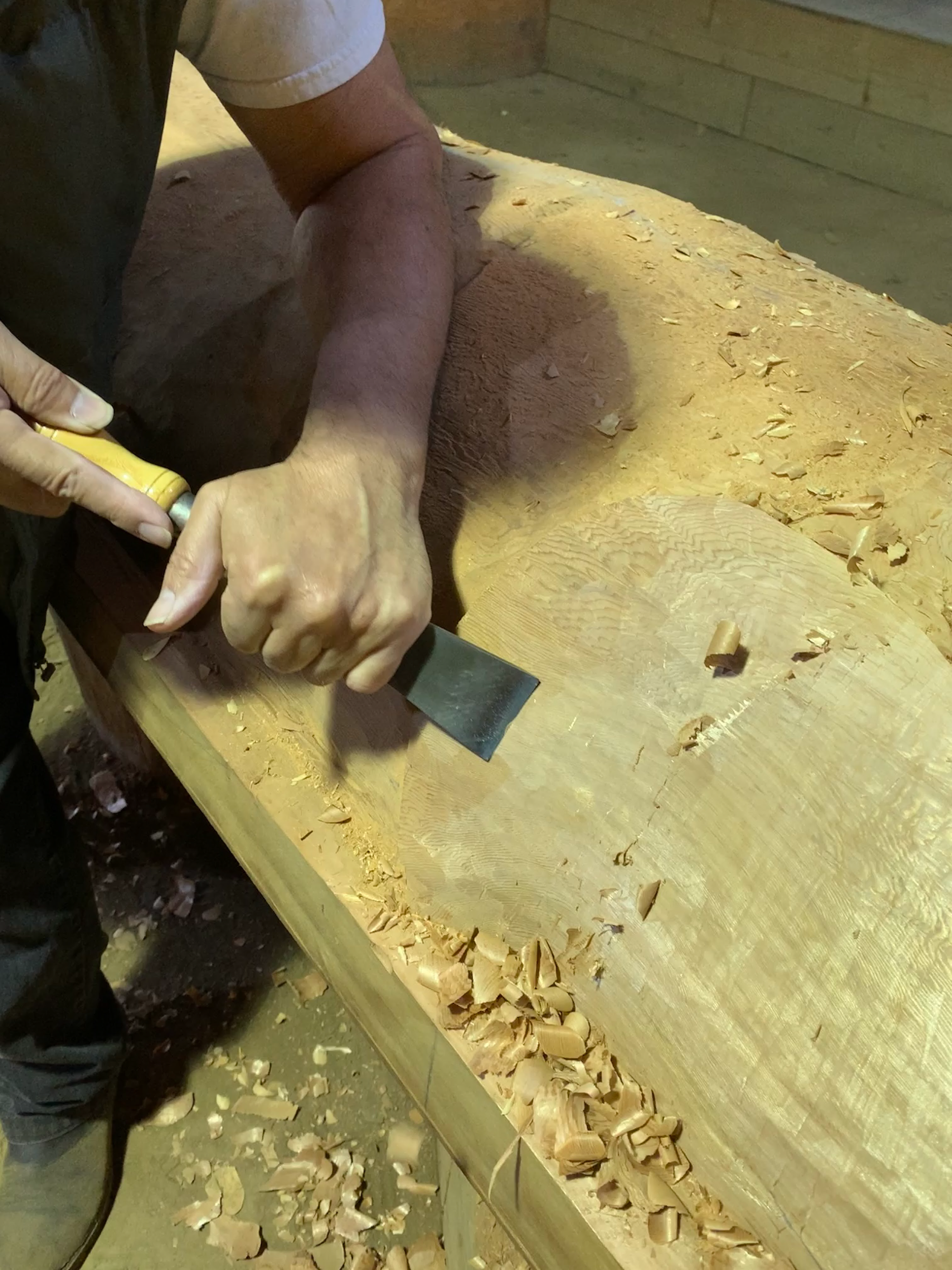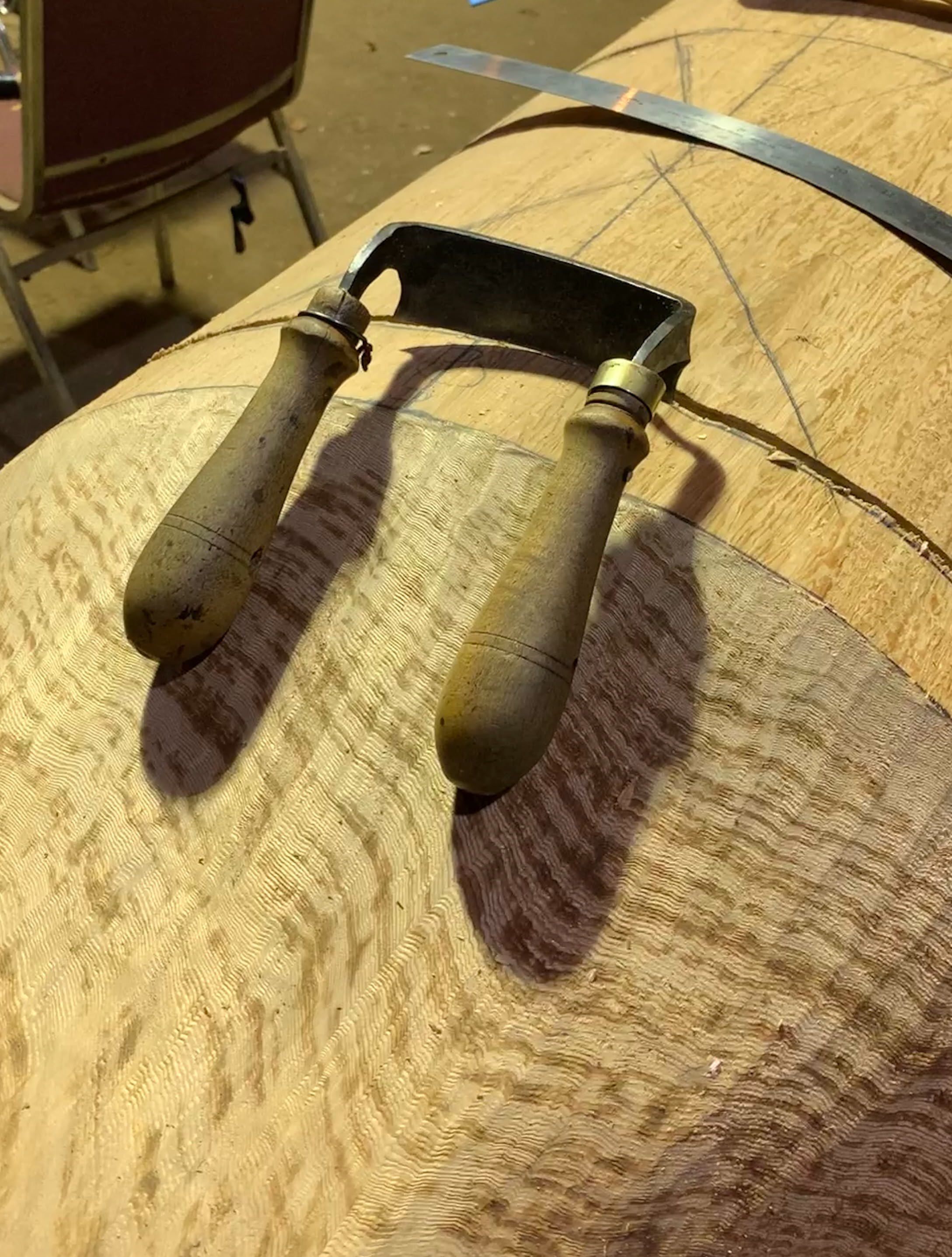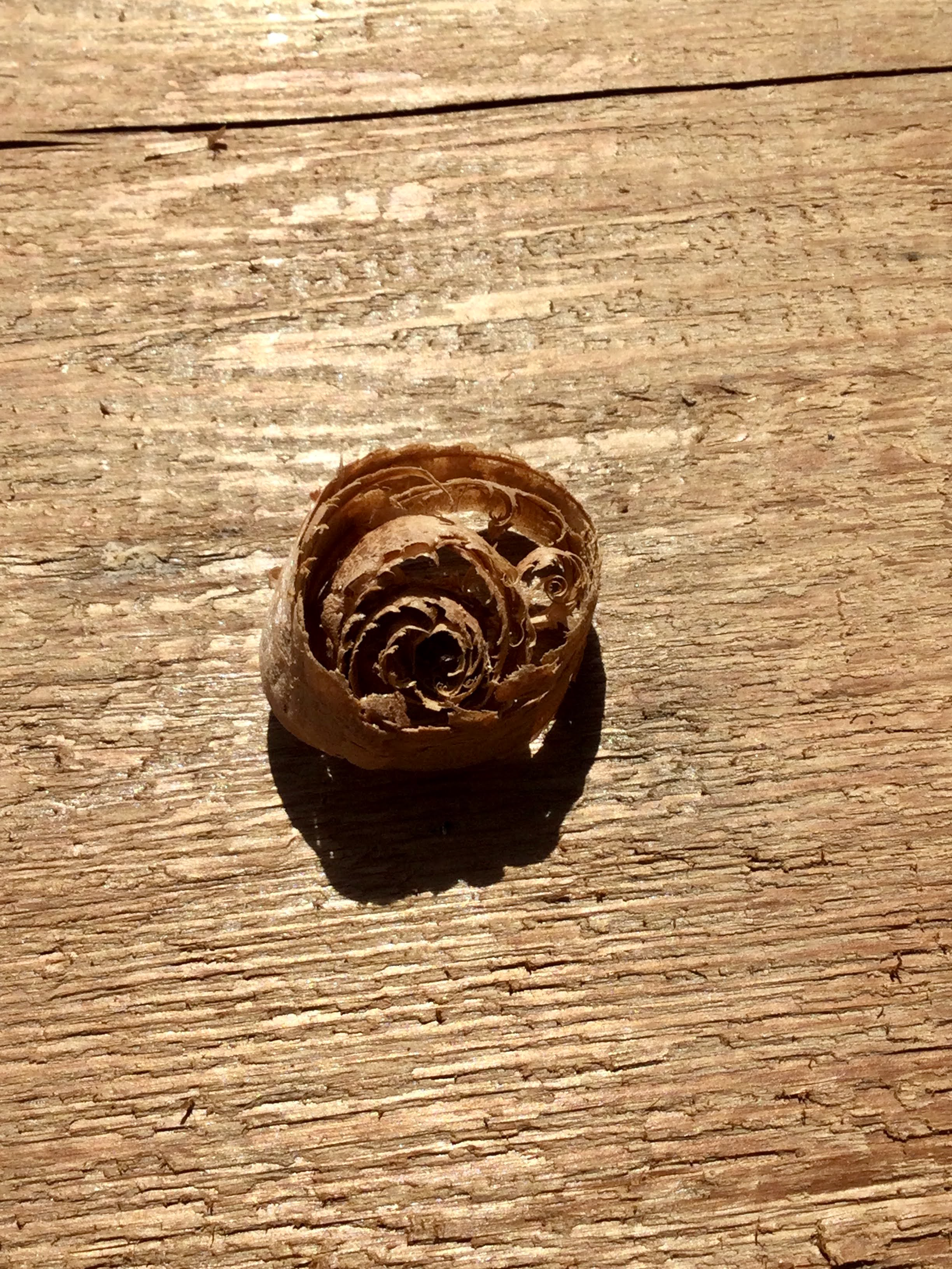 Raphael then used a Draw Knife to create a uniform ovoid to carve from. This knife here is pretty old (60-100 years old) and was actually a Farrier Knife that was used to shape Horseshoes. This knife creates beautiful curled pieces of Cedar. Check out the image below. What does it remind you of?