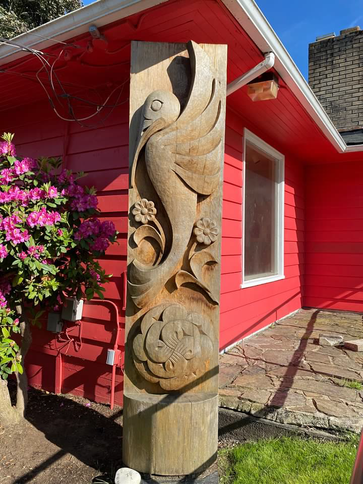 Indigenous Education Post: 2 of the House Posts are in a more traditional form (representing Raphael's mom and dad). This one here is more contemporary. Watch the video below to hear Raphael explain it. After, check the photos below and connect with the story: In what ways can education be a doorway into the future? Remember to look for teardrops, hearts, and flowers (it may not be as obvious as the above example).