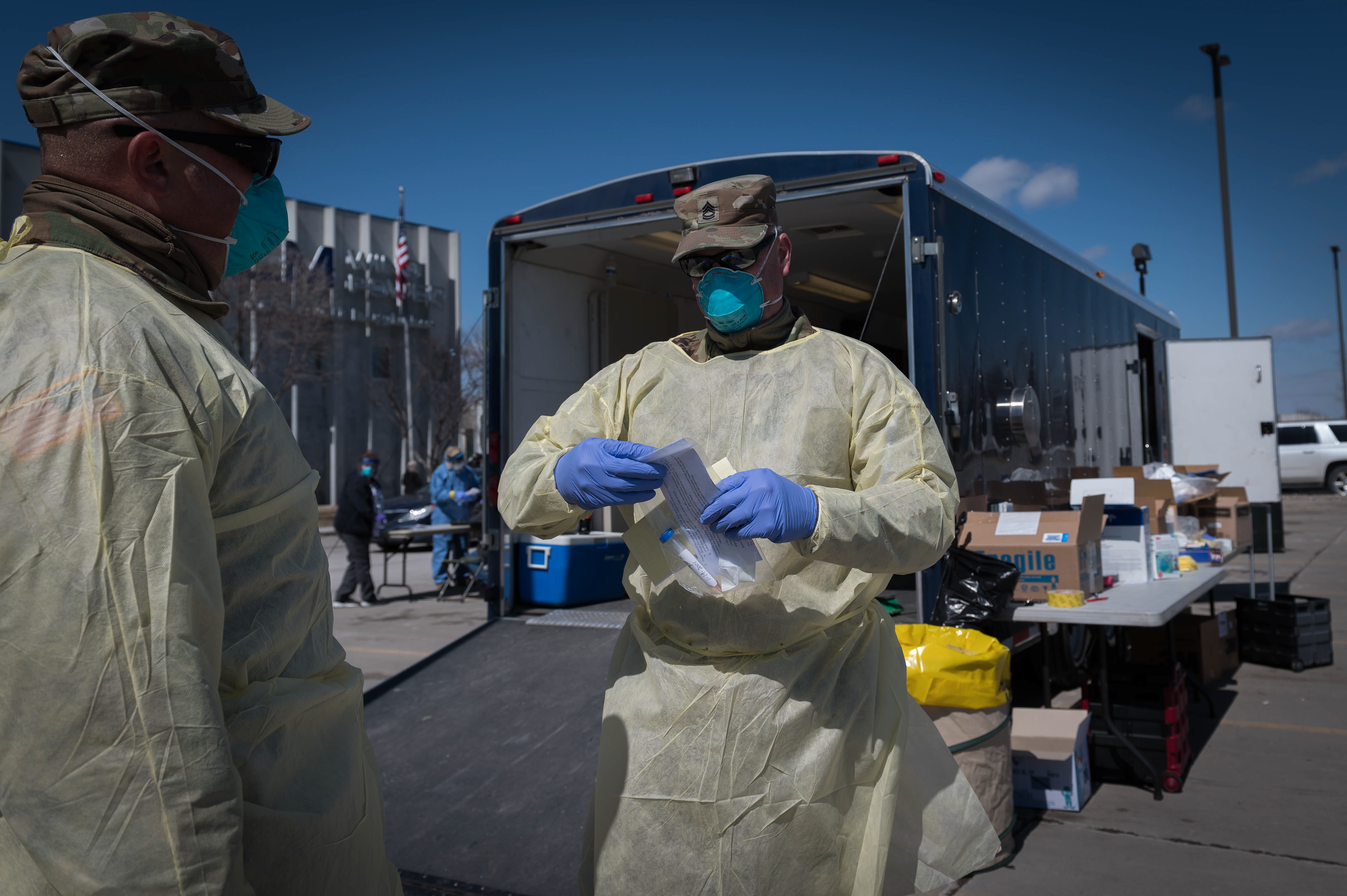 Sgt. 1st Class Jeremy Sigl, right, assembles testing kits for providers on April 16 in Grand Forks. Patients were guided through the mobile COVID-19 testing lanes while staying in the comfort of their vehicles.