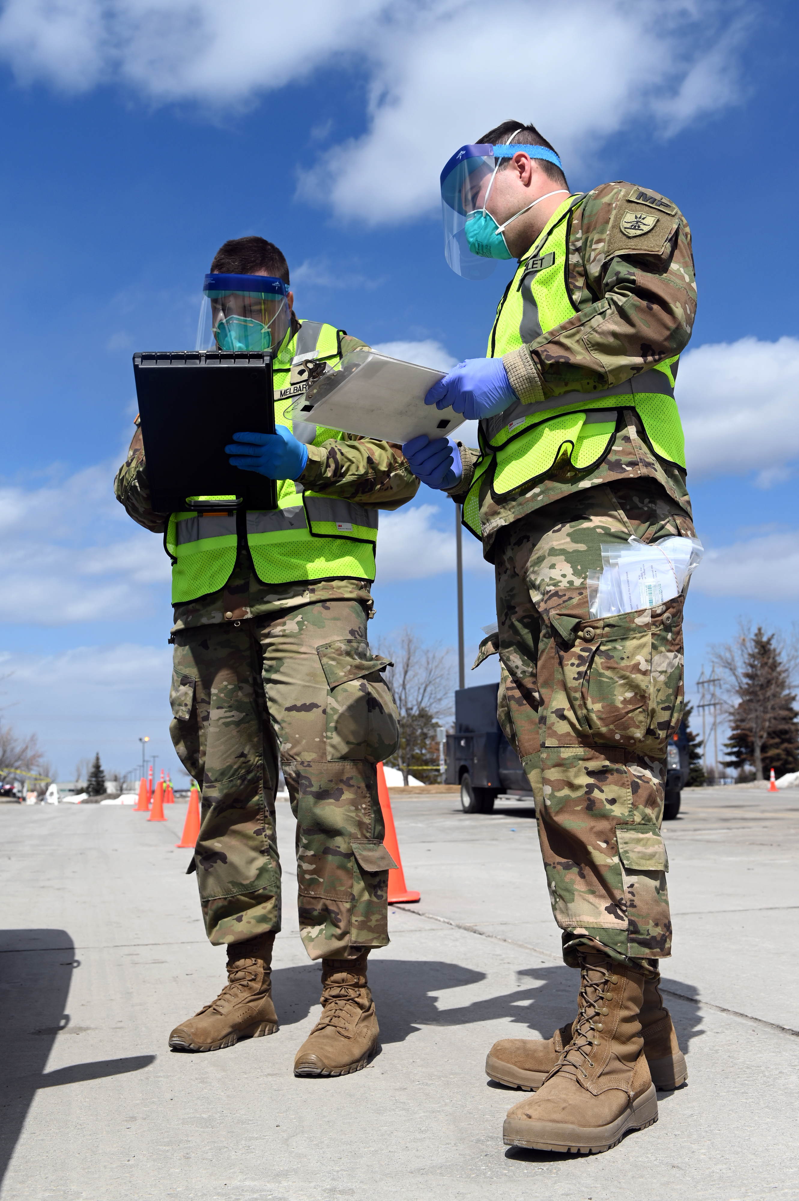 Spc. Scott Melbarzdis of the 816th Military Police Company and Spc. Brian Goulet of the 191st Military Police Company work together to collect patients’ information for the testing kits at the COVID-19 mobile testing site in Grand Forks on April 16.