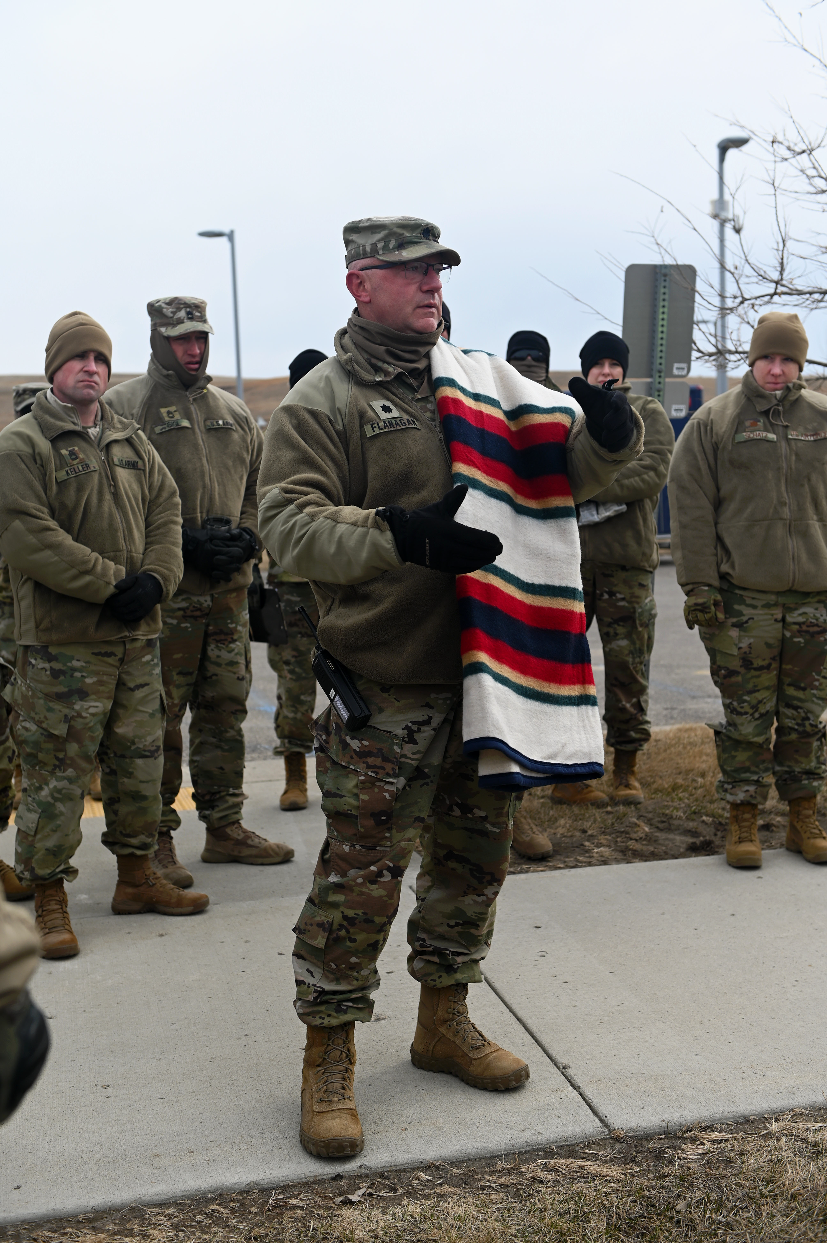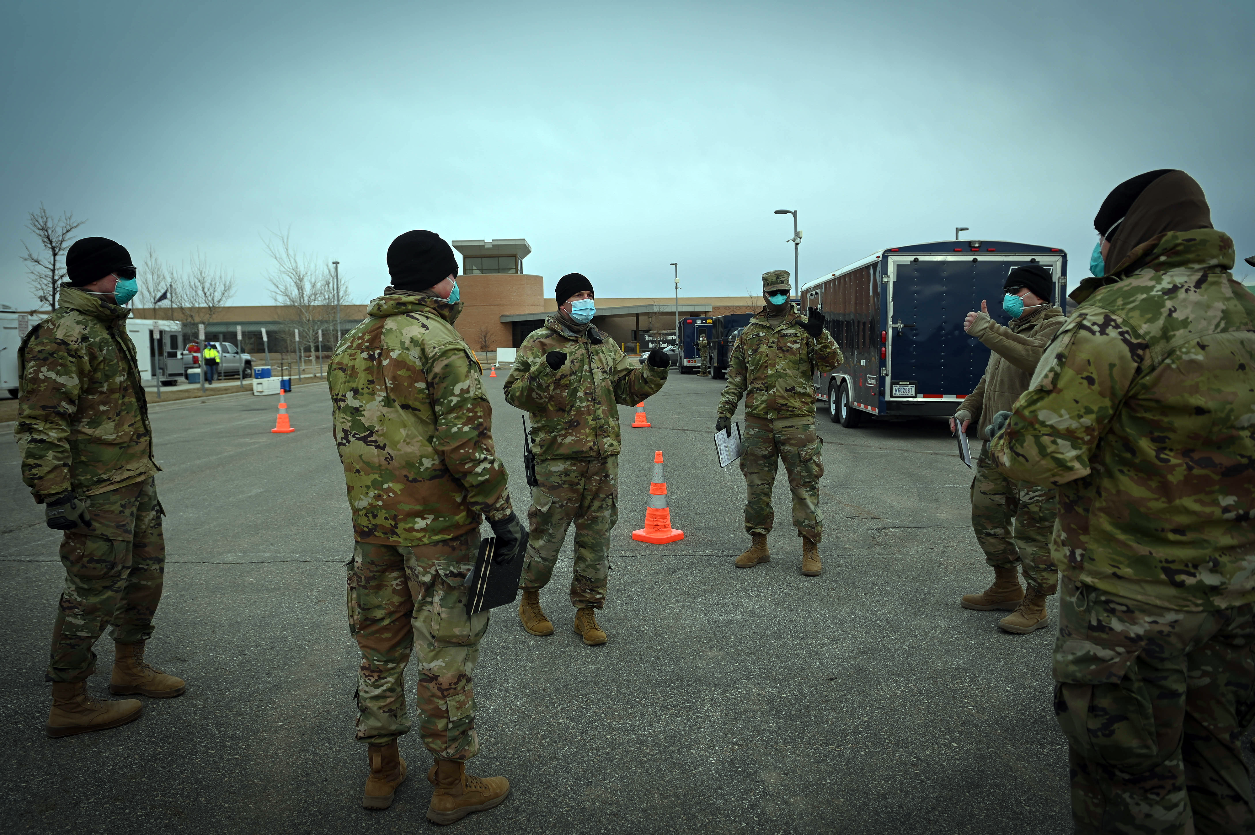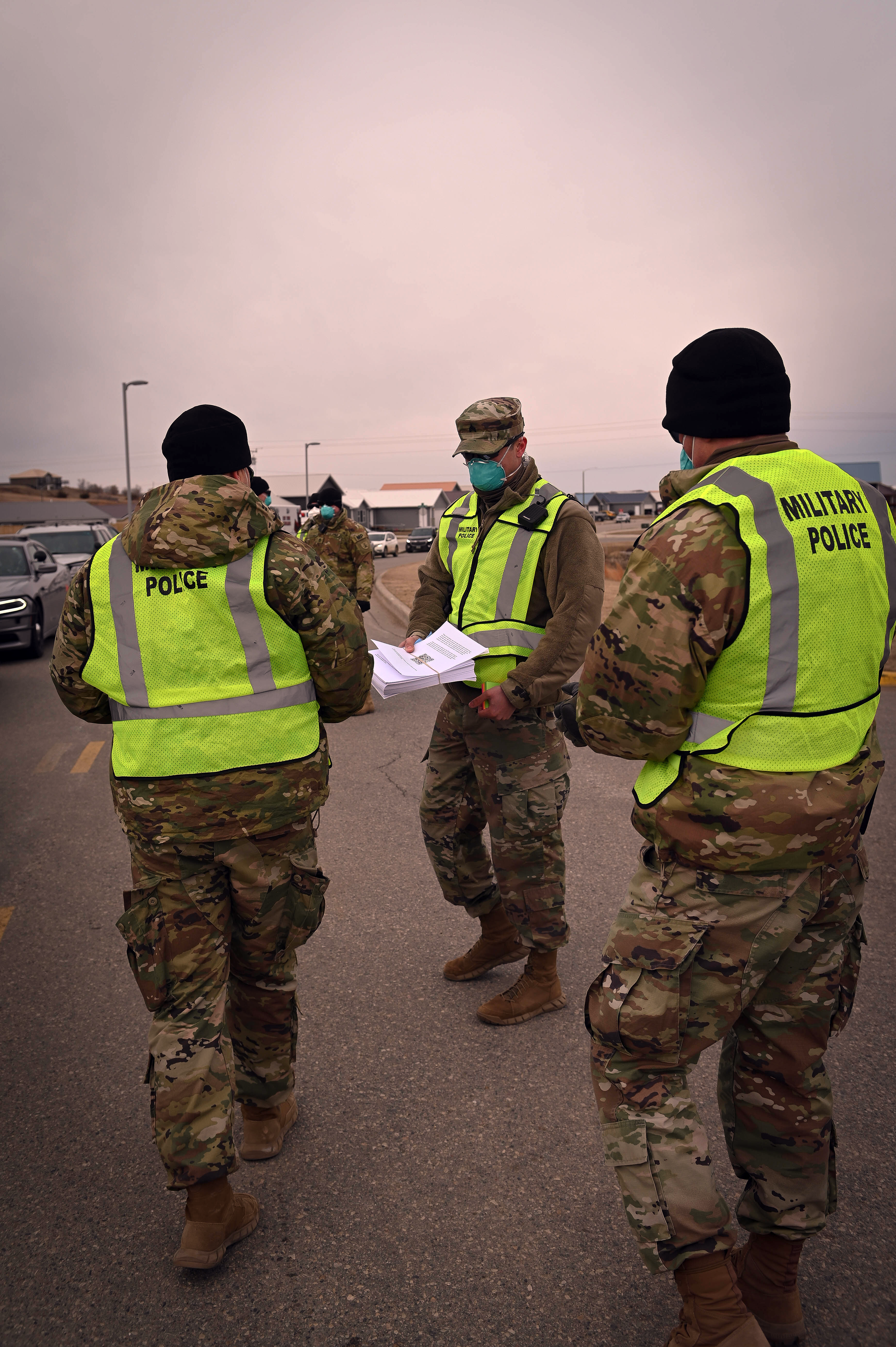 N.D. Army National Guard military police discuss how they will control traffic at the mobile COVID-19 testing at the Elbowoods Memorial Health Center in New Town on April 11. Patients were able to complete the testing while seated in their vehicle.
