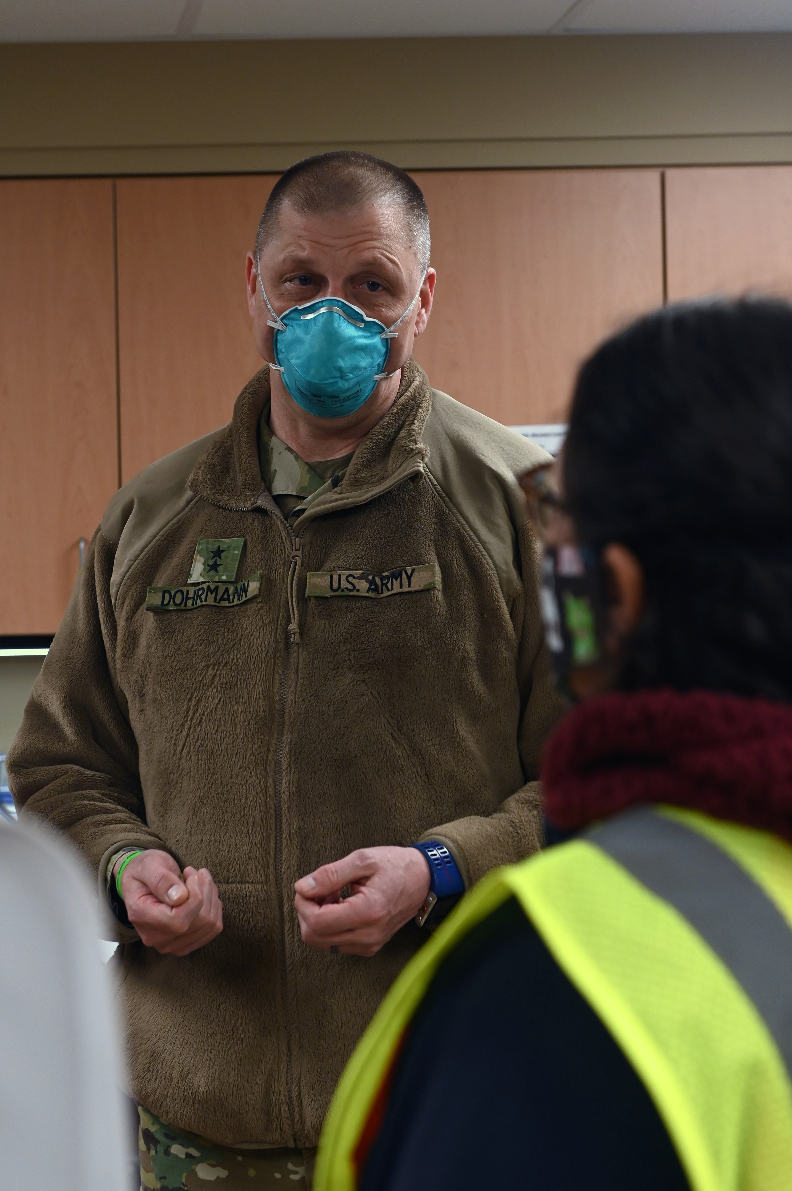 Maj. Gen. Al Dohrmann, N.D. adjutant general, discusses ideas with local healthcare officials at the Elbowoods Memorial Health Center in New Town on April 11. The discussion centered on how to best serve smaller communities in the state. The N.D. National Guard is a partner of the whole of community response to the COVID-19 pandemic.