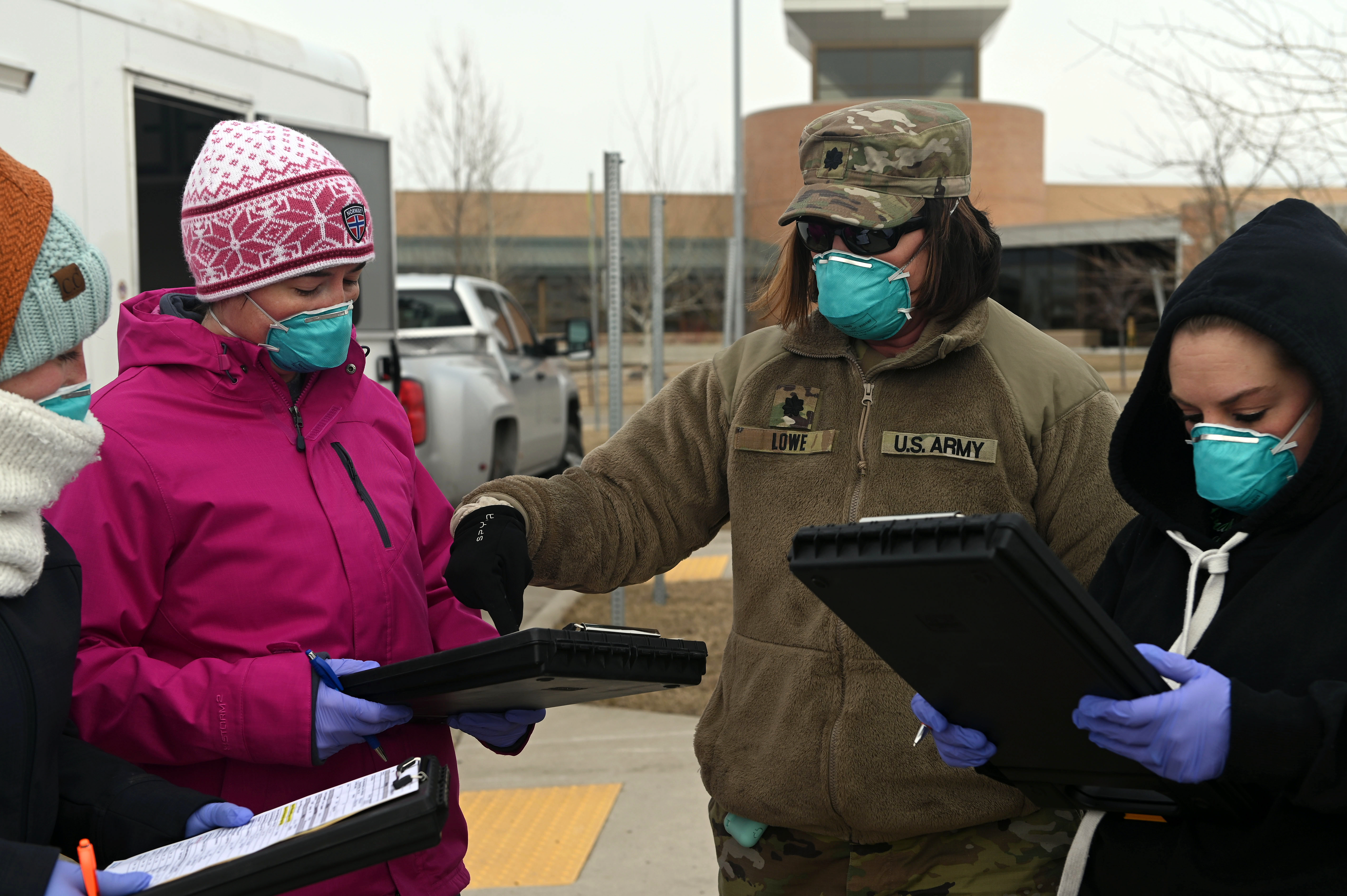 The N.D. National Guard assisted the Mandan, Hidatsa and Arikara Nation, also known as the Three Affiliated Tribes, with mobile COVID-19 testing on April 11 and April 13 as part of the N.D. Department of Health's Operation Drive-In. About 400 tests were administered at the Elbowoods Memorial Health Center in New Town on the Fort Berthold Indian Reservation by members of the N.D. National Guard's 81st Civil Support Team, 191st Military Police Company and others. Top photo. Lt. Col. Barb Lowe consults with volunteers who assisted with the COVID-19 mobile testing on April 11.