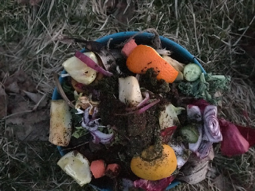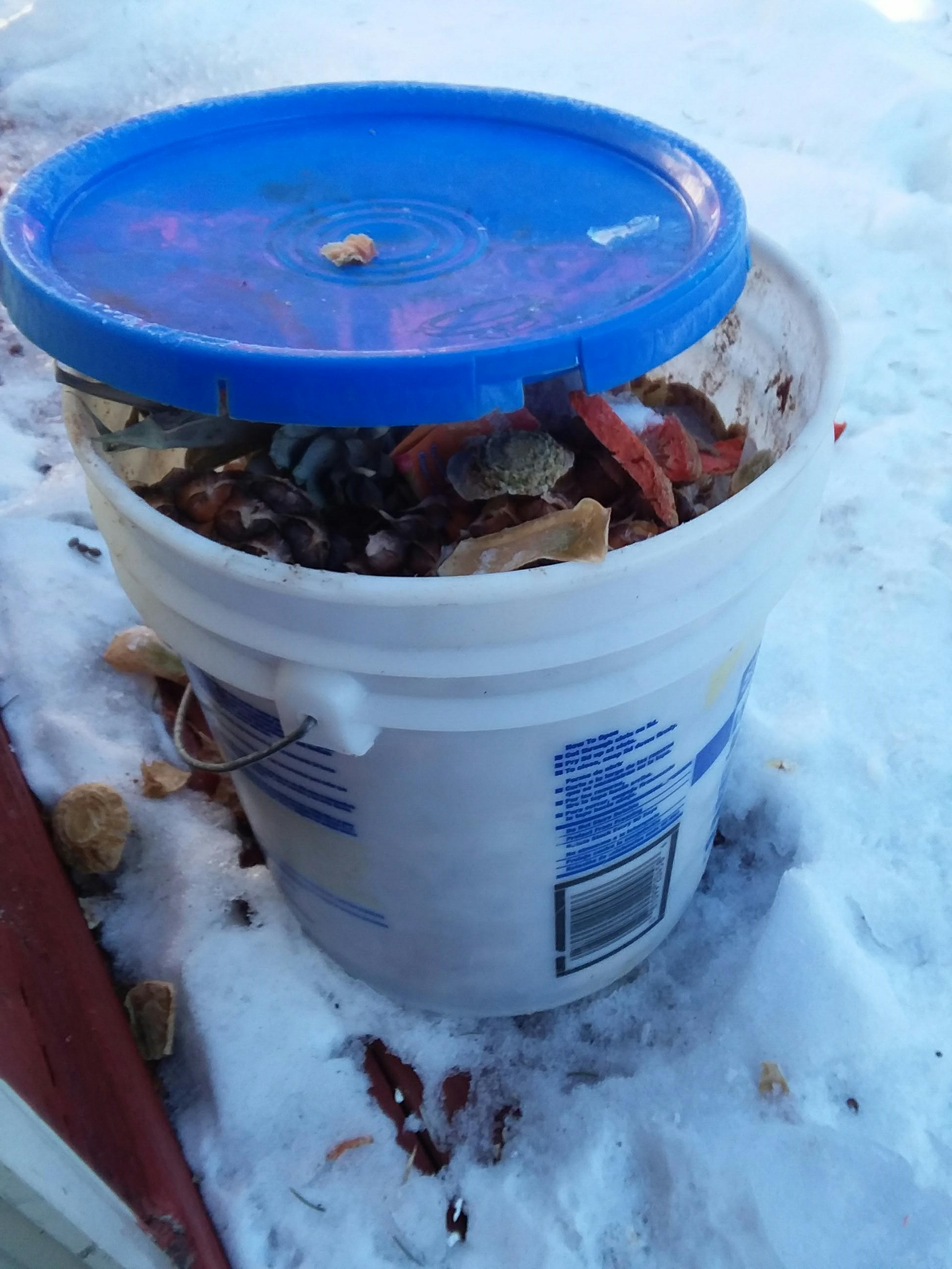 - When the kitchen container is full dump it in the bucket outside your door, when the bucket is full take it to the compost pile. This saves trips to the compost pile.
