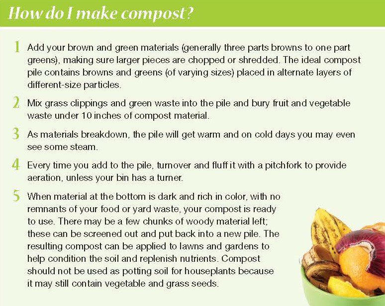 - Where should I put my pile/bin? Ideally, the site of your pile/bin will get some sun and some shade. Avoid standing water/find a spot with good drainage. As a general rule, the pile should be between 3 ft. square and 5 ft. square. If its too small, it may be a struggle to get it hot enough. So before you start dumping food scraps out back, get some yard waste together to begin building your pile and then add your scraps, and continue to maintain that balance of "browns" and "greens."