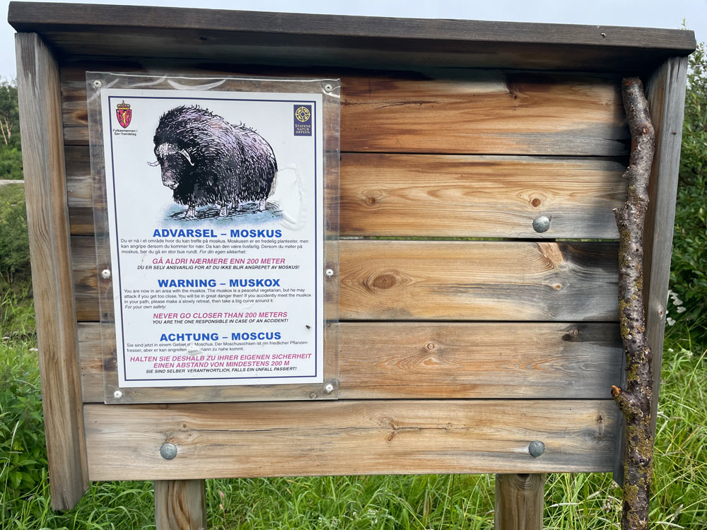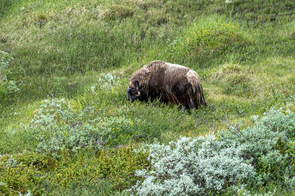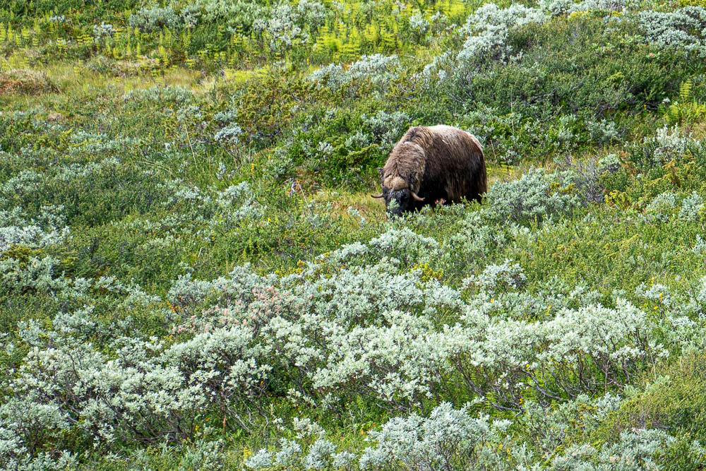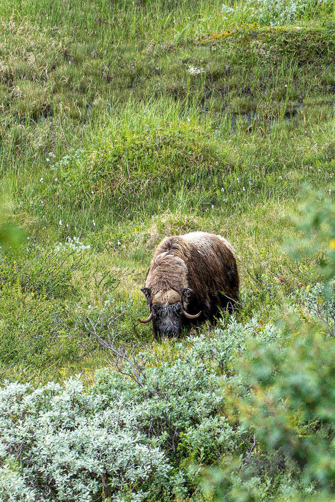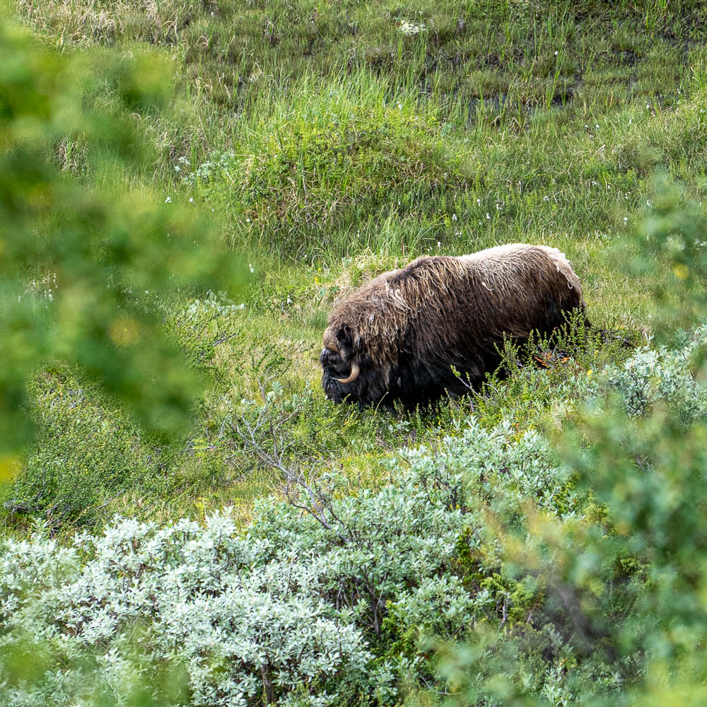 Am Eingang zum Nationalpark steht: Der Moschusochse ist ein friedlicher Pflanzenfresser, aber er kann angreifen, wenn man ihm zu nahe kommt. Ein 200 Meter Sicherheitsabstand wird empfohlen. Wir wagen uns etwas näher ran. Auch wenn Moschungsochsen nicht zur Gattung der Büffel, sondern zur Verwandschaftsgruppe der Ziegen gehören, wiegt ein ausgewachsener Bulle fast eine halbe Tonne und schafft, wenn er wütend wird eine Spitzengeschwindigkeit von 60 Km/h. Weglaufen ist da keine Option.