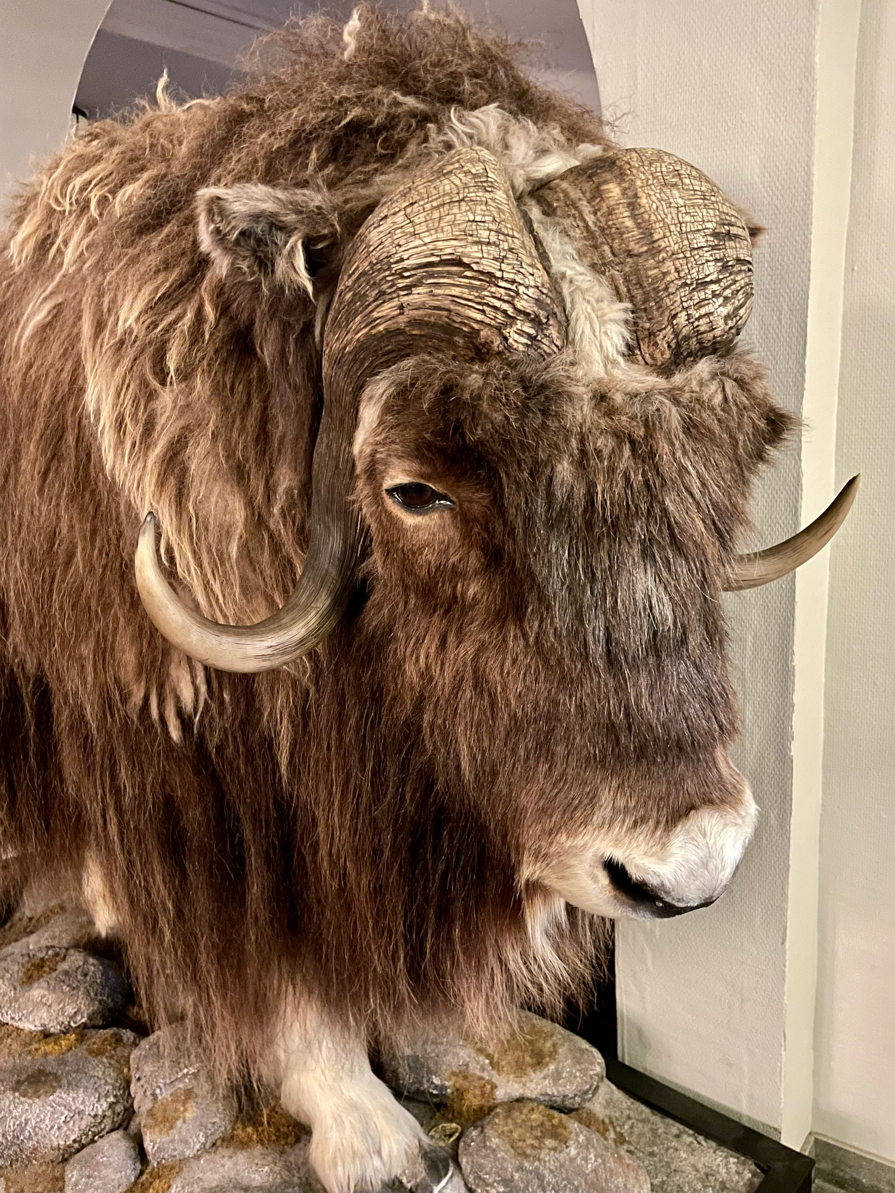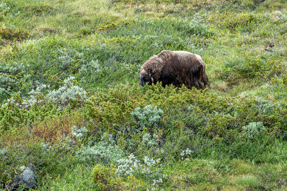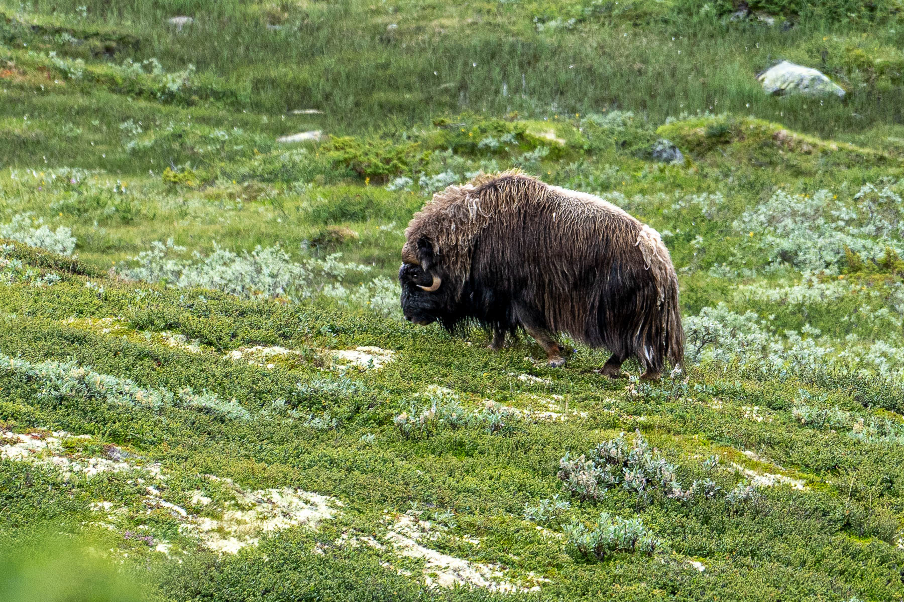 Am Eingang zum Nationalpark steht: Der Moschusochse ist ein friedlicher Pflanzenfresser, aber er kann angreifen, wenn man ihm zu nahe kommt. Ein 200 Meter Sicherheitsabstand wird empfohlen. Wir wagen uns etwas näher ran. Auch wenn Moschungsochsen nicht zur Gattung der Büffel, sondern zur Verwandschaftsgruppe der Ziegen gehören, wiegt ein ausgewachsener Bulle fast eine halbe Tonne und schafft, wenn er wütend wird eine Spitzengeschwindigkeit von 60 Km/h. Weglaufen ist da keine Option.