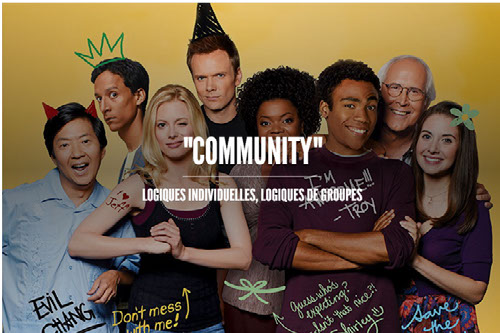 Aborder la questions des rapports entre logiques individuelles et logiques de groupes revient à examiner et analyser des structures dans lesquelles se déploient communautés et collectivités. Une série américaine illustre parfaitement cela: Community. Cette série situe son action au cœur d'un campus universitaire et son propos et ses personnages semblent directement mettre en scène, de manière parodique mais avec beaucoup de finesse, nos pratiques contemporaines en termes de sociabilité: