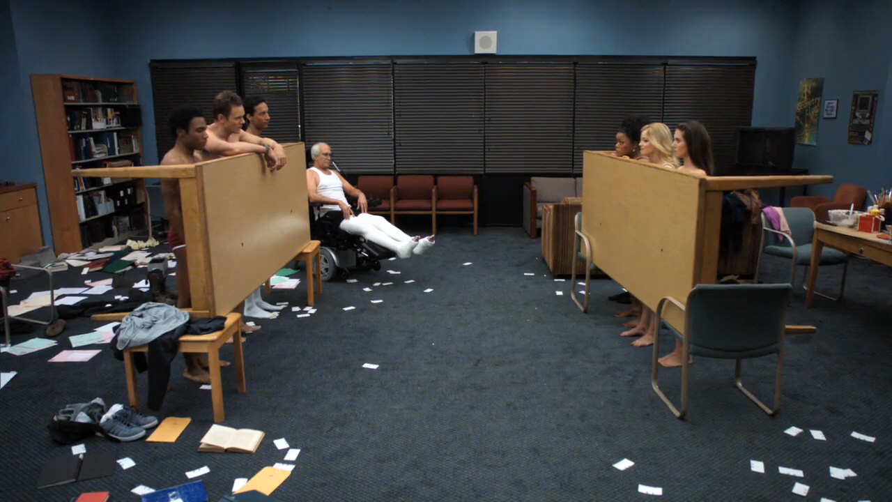 S'en suivra un procès loufoque au bord de la piscine, avec Britta dans le rôle de l'accusée, Jeff dans celui de l'avocat et Duncan, Cheng et le Doyen dans ceux des juges.
