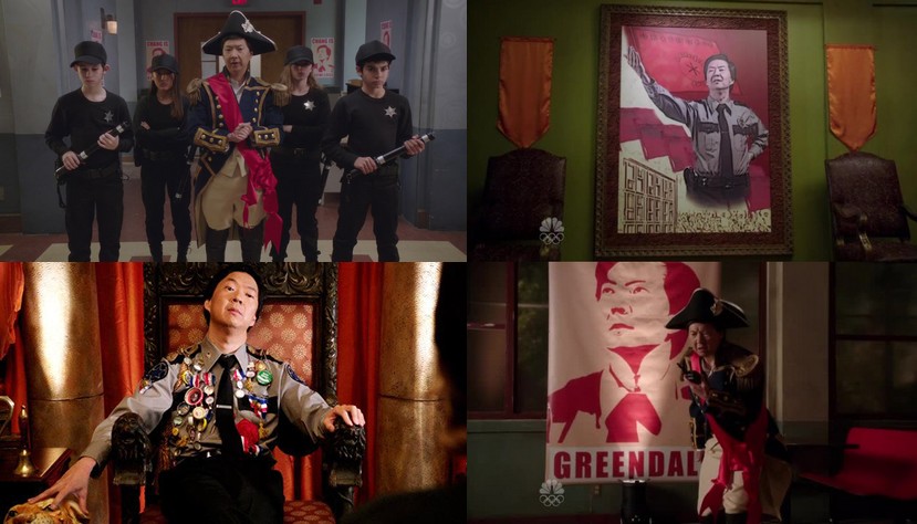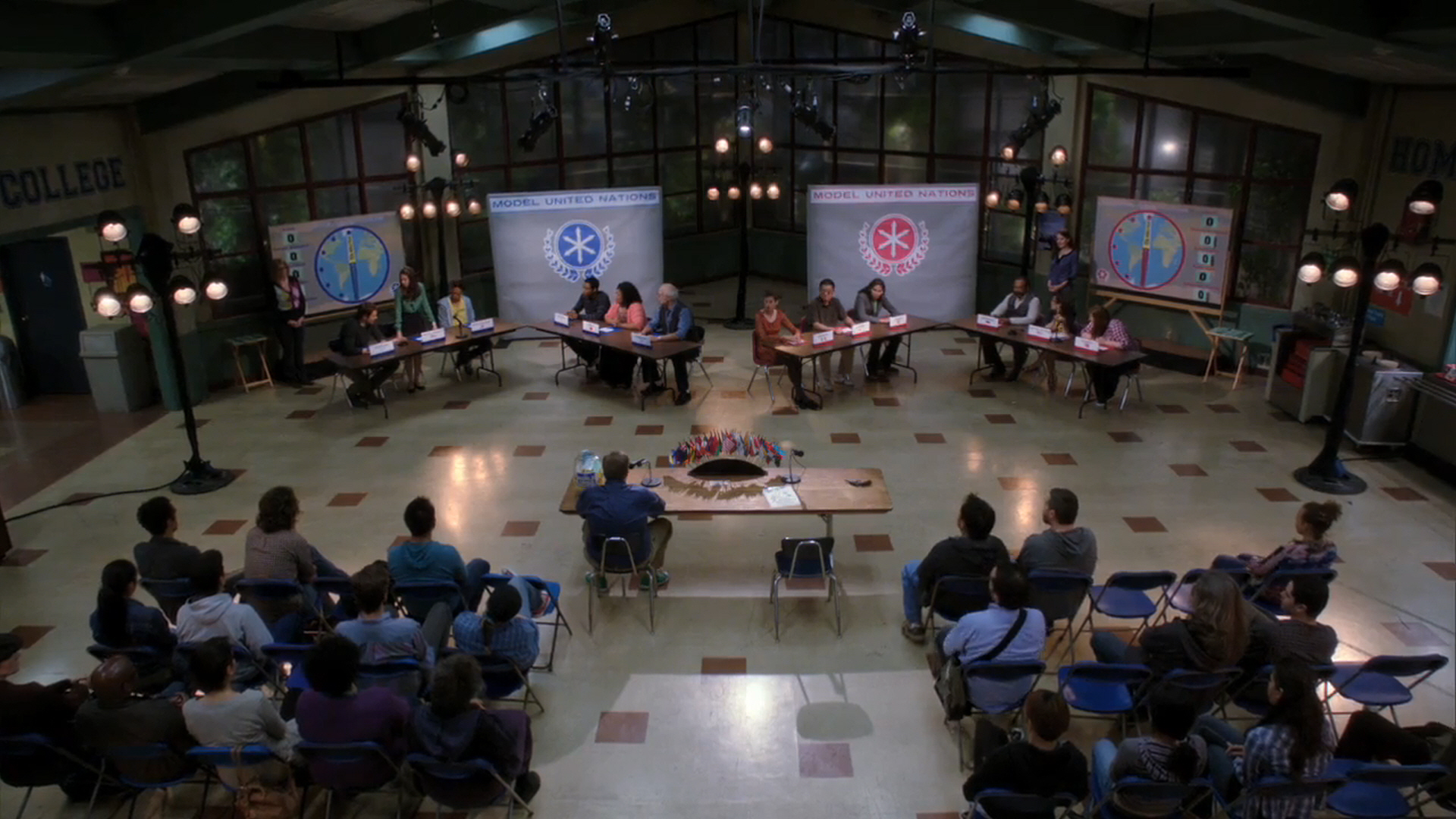 Il inscrit au cœur du projet de Greendale une dimension participative qui se traduit par exemple par un concours pour élire le nouveau drapeau - et son slogan - de l'Université. Concours remporté par notre groupe, sur la base d'une blague potache (conséquence: nos héros devront prendre part à un nouveau projet tout aussi folklorique dans l'épisode 0204)...