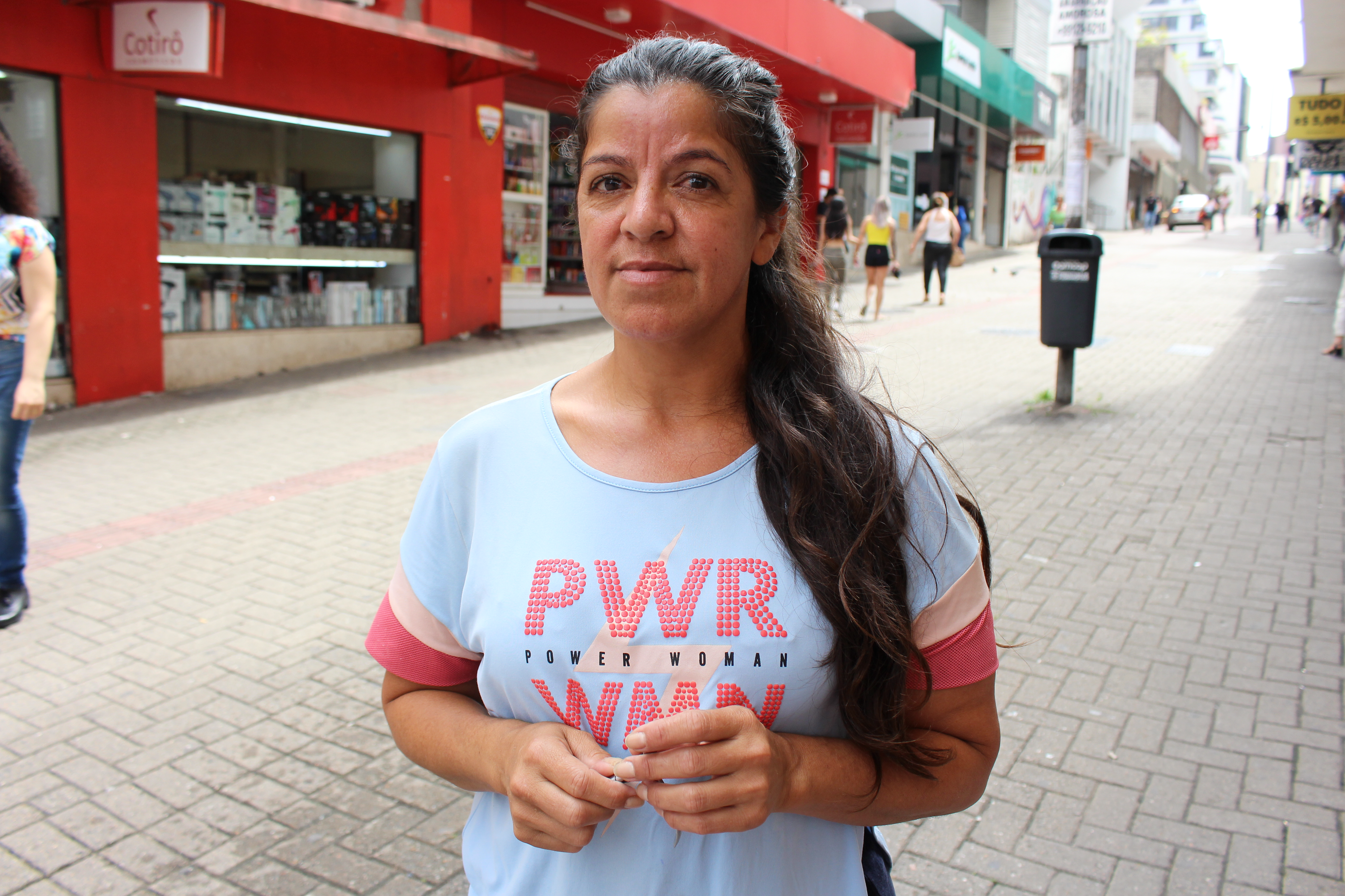 Moradora do bairro de Coqueiros, Giani vem todos os dias de ônibus para o local de trabalho. No ponto em que fica, no Centro, chega às 9h e permanece até às 17h. Antes de começar a trabalhar, faz parte da rotina levar a filha pequena, de 3 anos, para a creche. Além dela, é mãe de outra menina, de 18 anos, que assim como Giani, já está trabalhando. “Ela terminou o terceiro ano. À princípio ela tinha várias coisas que queria ser, mas muda muito devido à idade. Perguntei para ela: o que tu queres estudar agora? Então ela me disse que primeiro quer trabalhar por um tempo. De toda forma, vejo que ela sempre está se empenhando na língua portuguesa. Quando escreve para mim (mensagens) é ponto, vírgula, é show.”