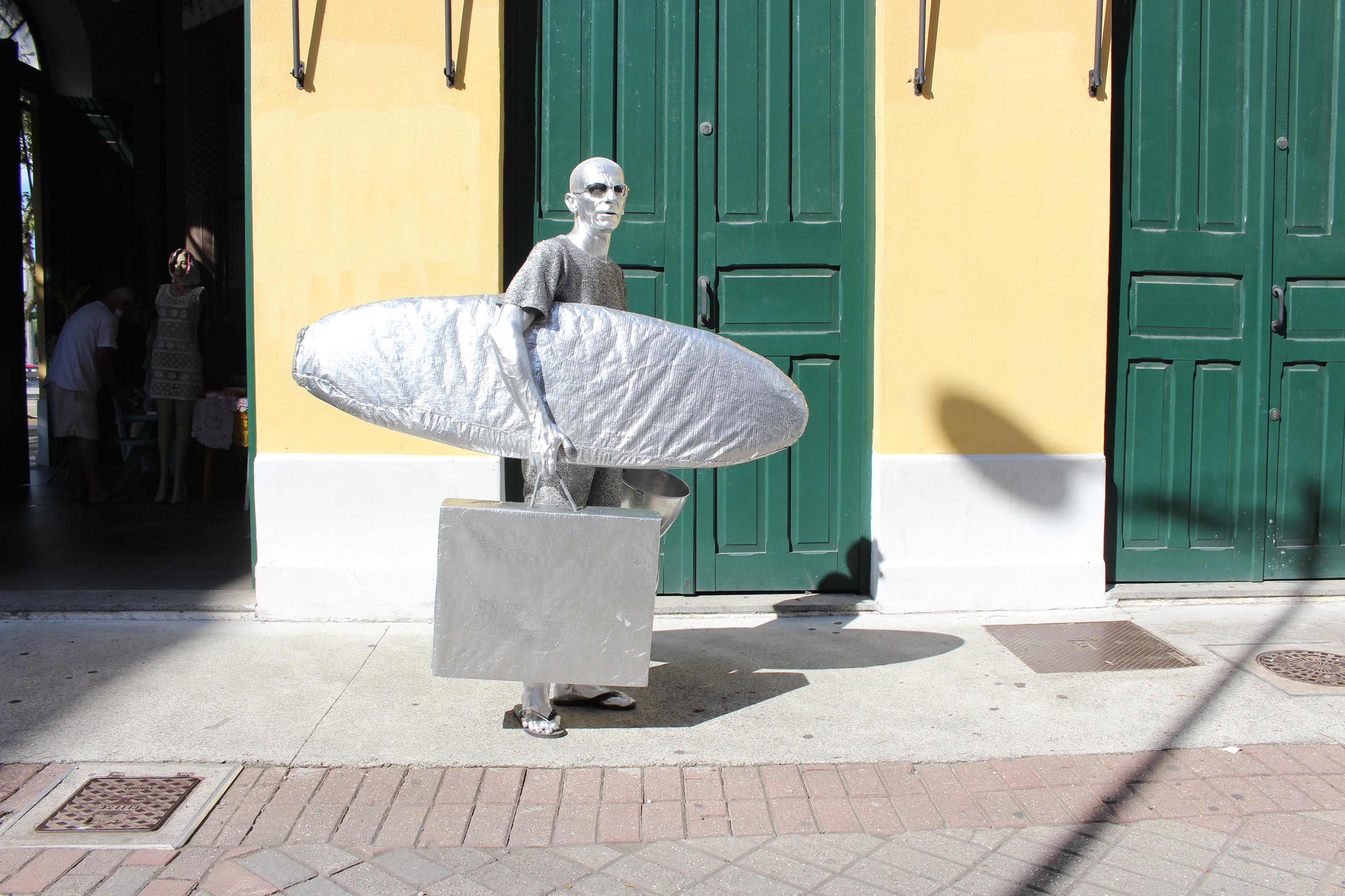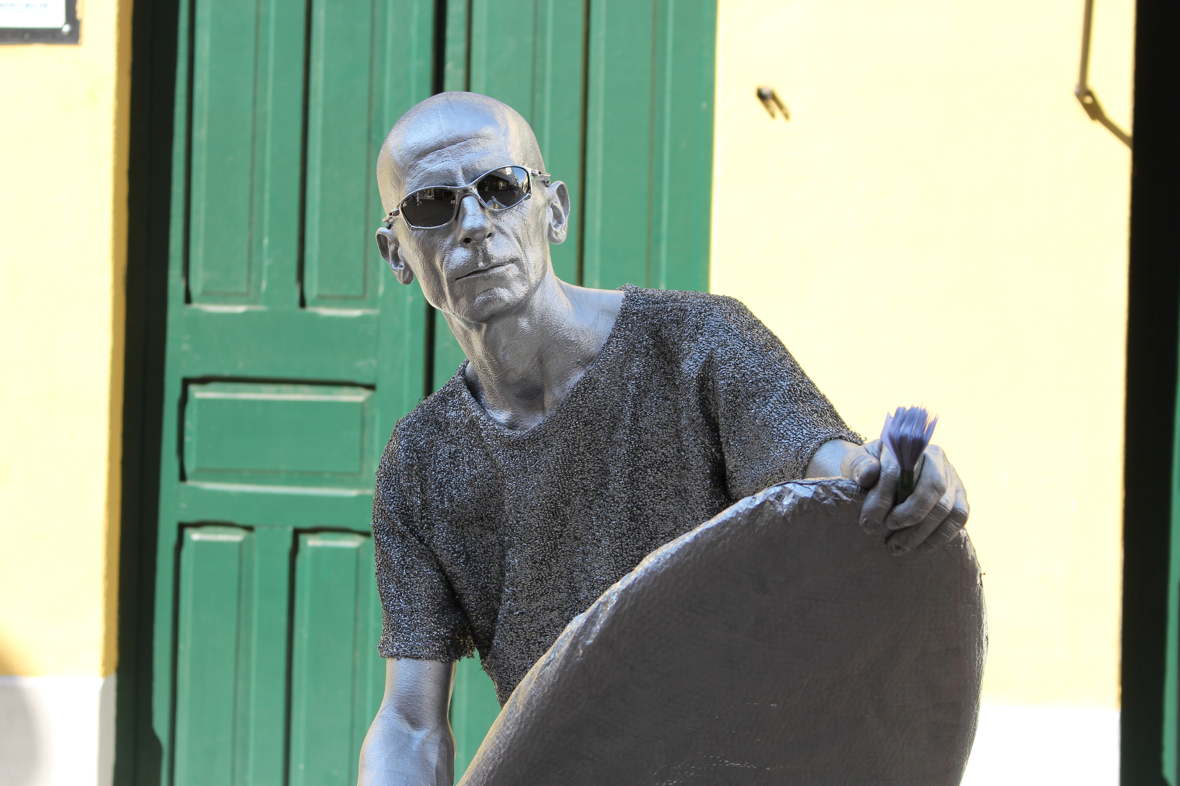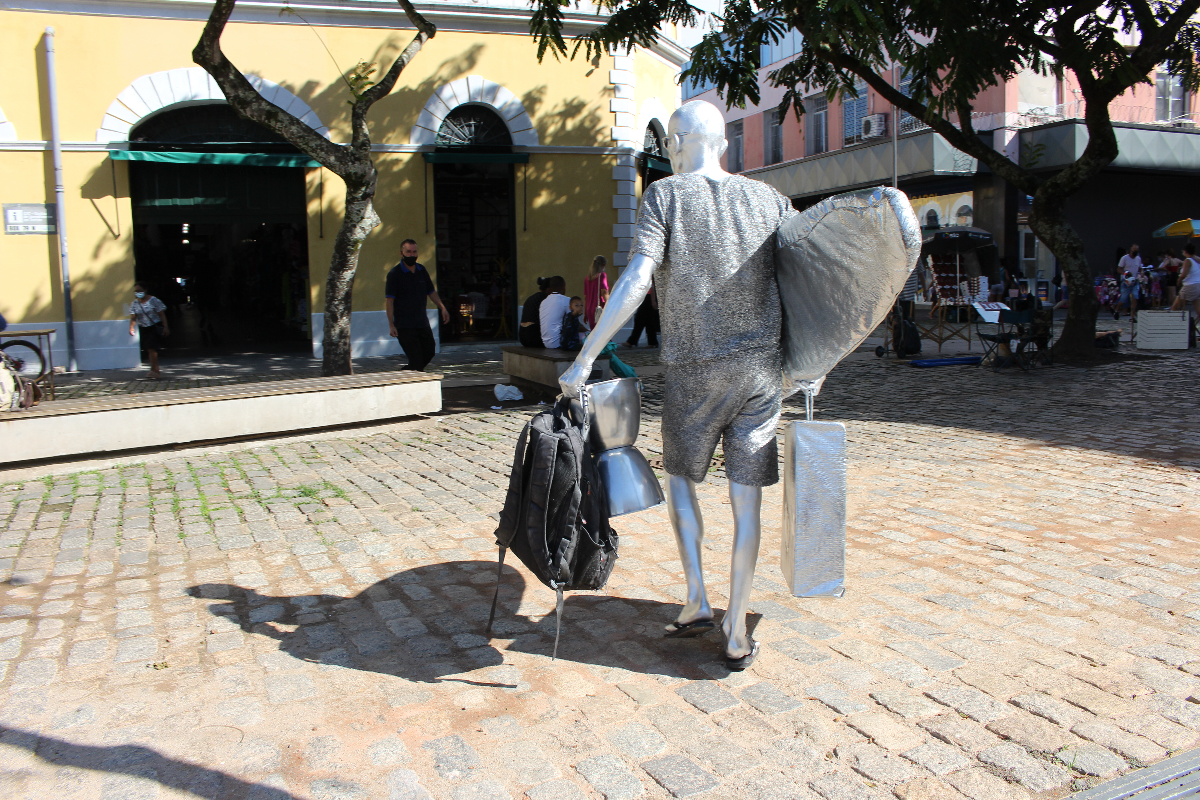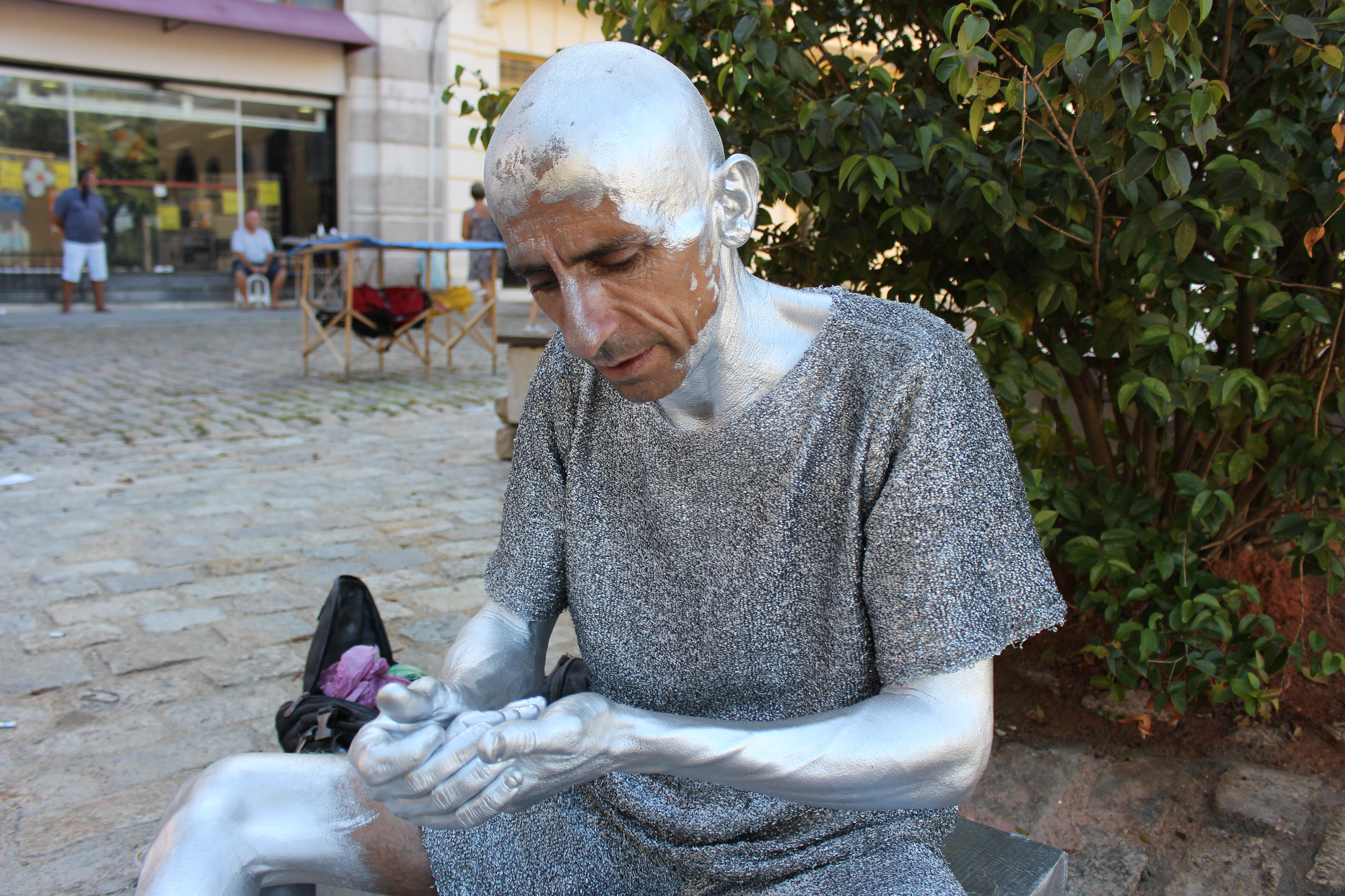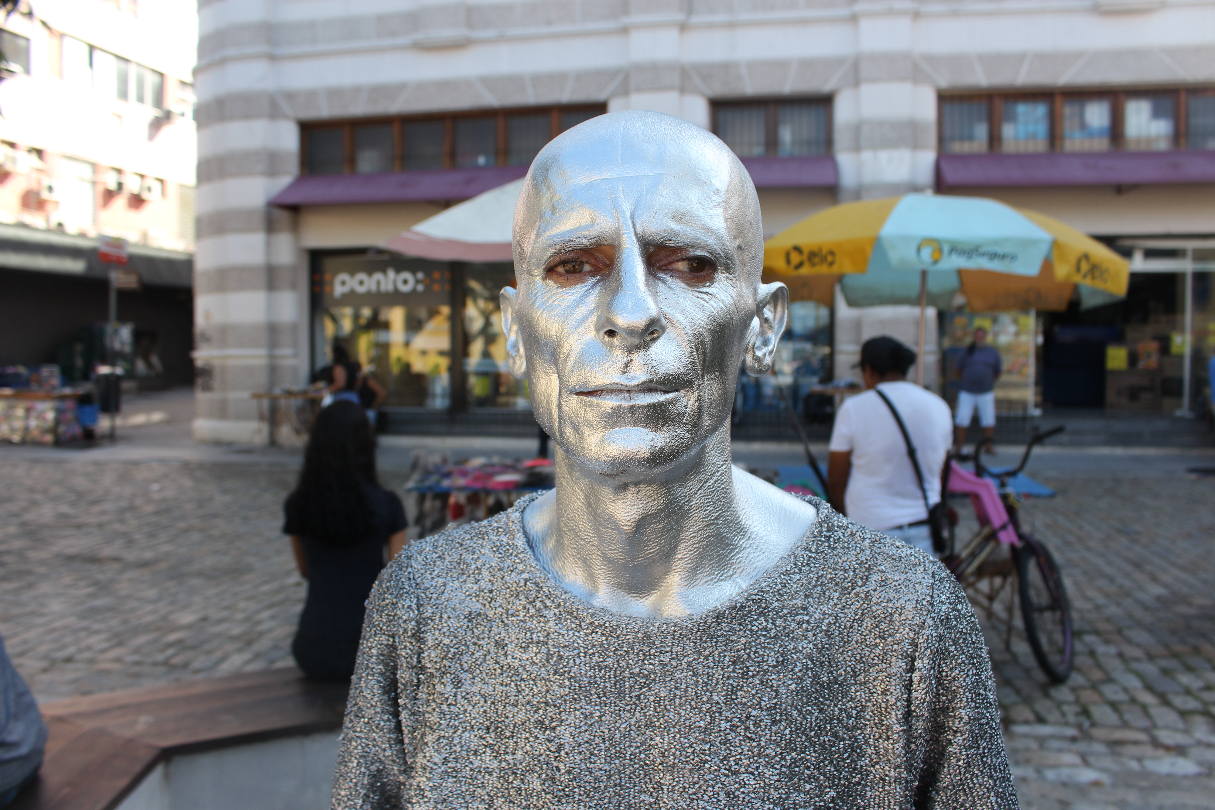 Os dias de sol, embora muitas vezes escaldantes, são os preferidos do artista. Com a luz refletida em sua pele e na roupa, o efeito prateado se intensifica. Em dia de muita chuva, ele nem sai de casa.