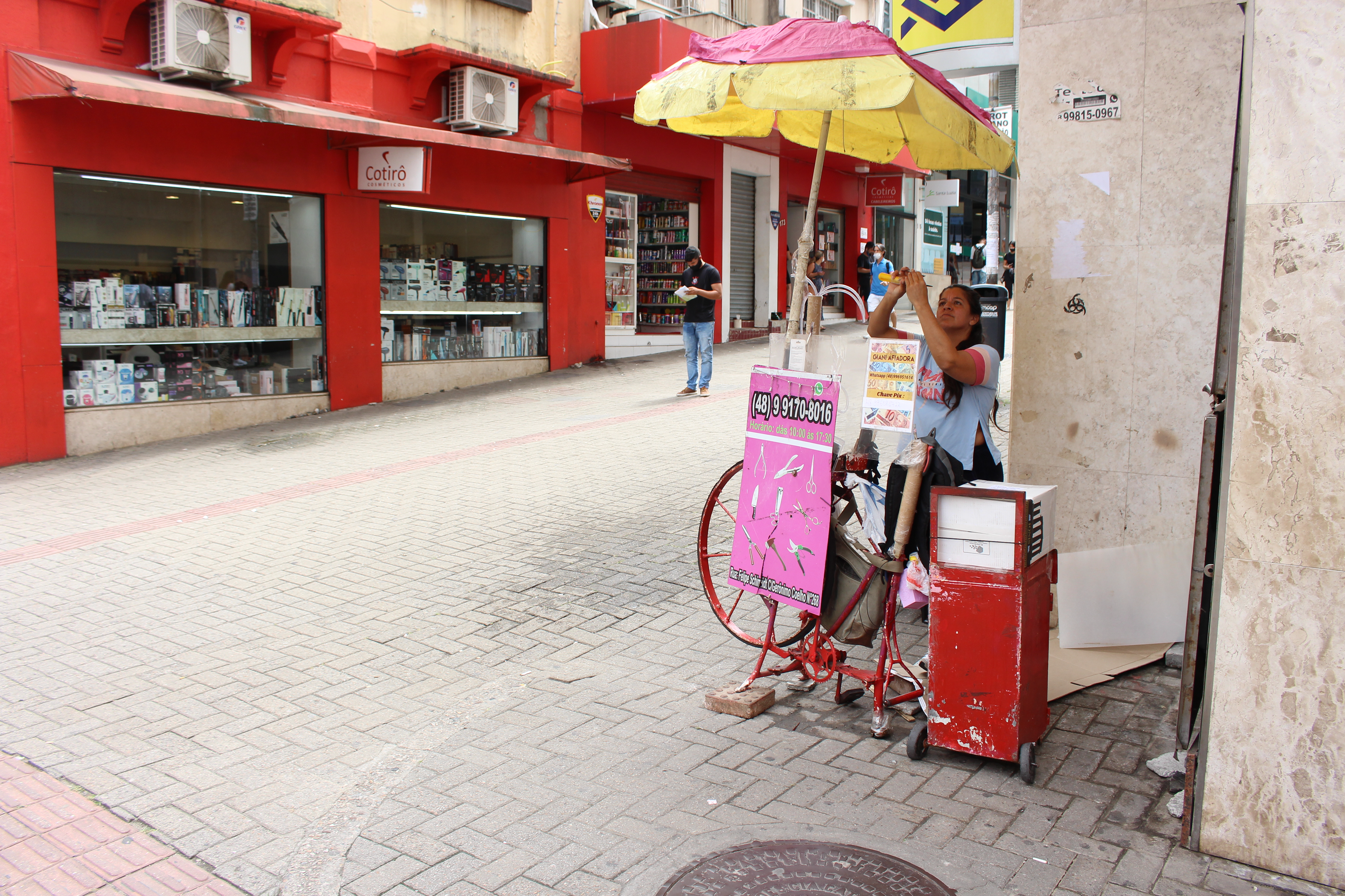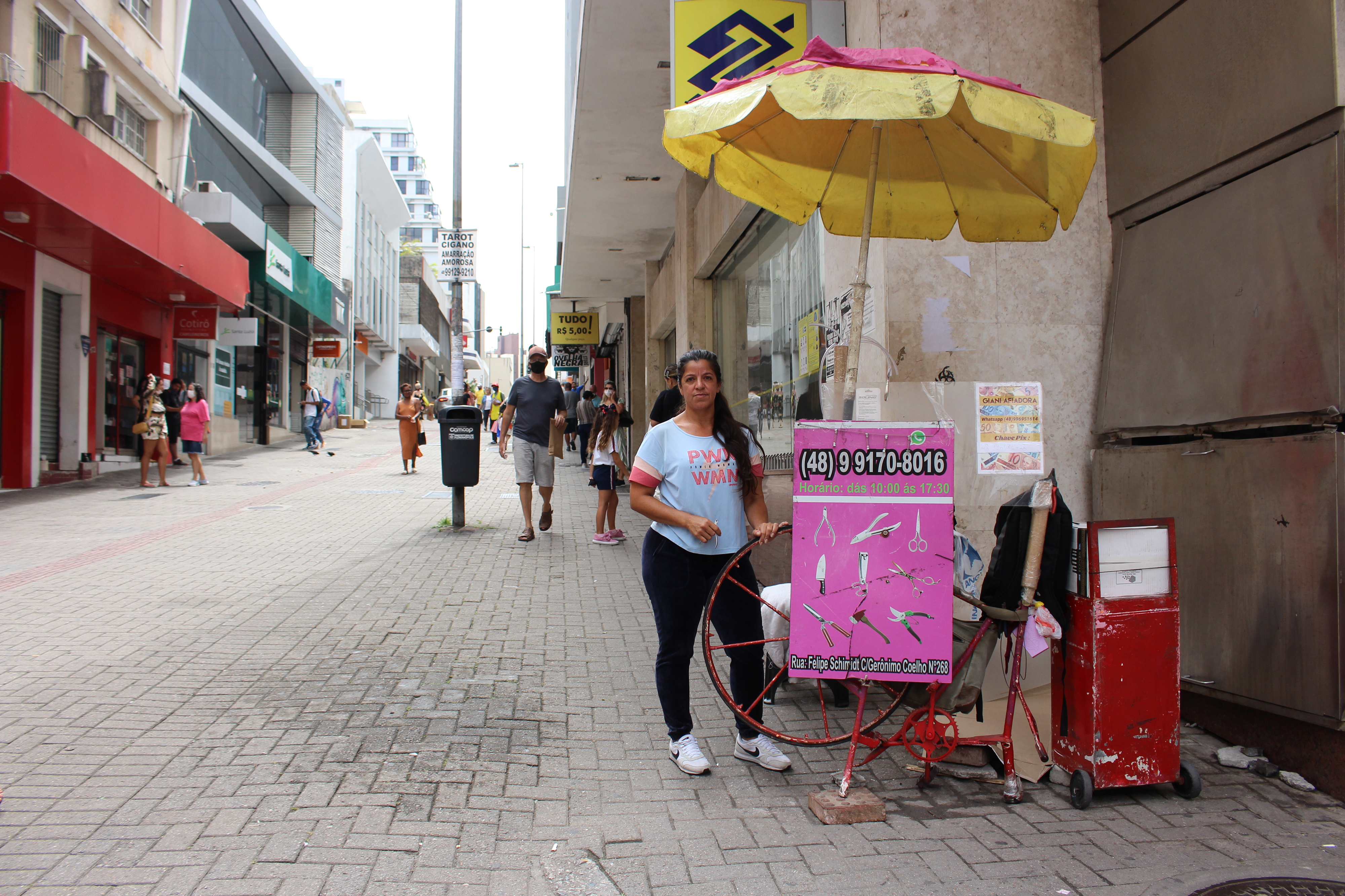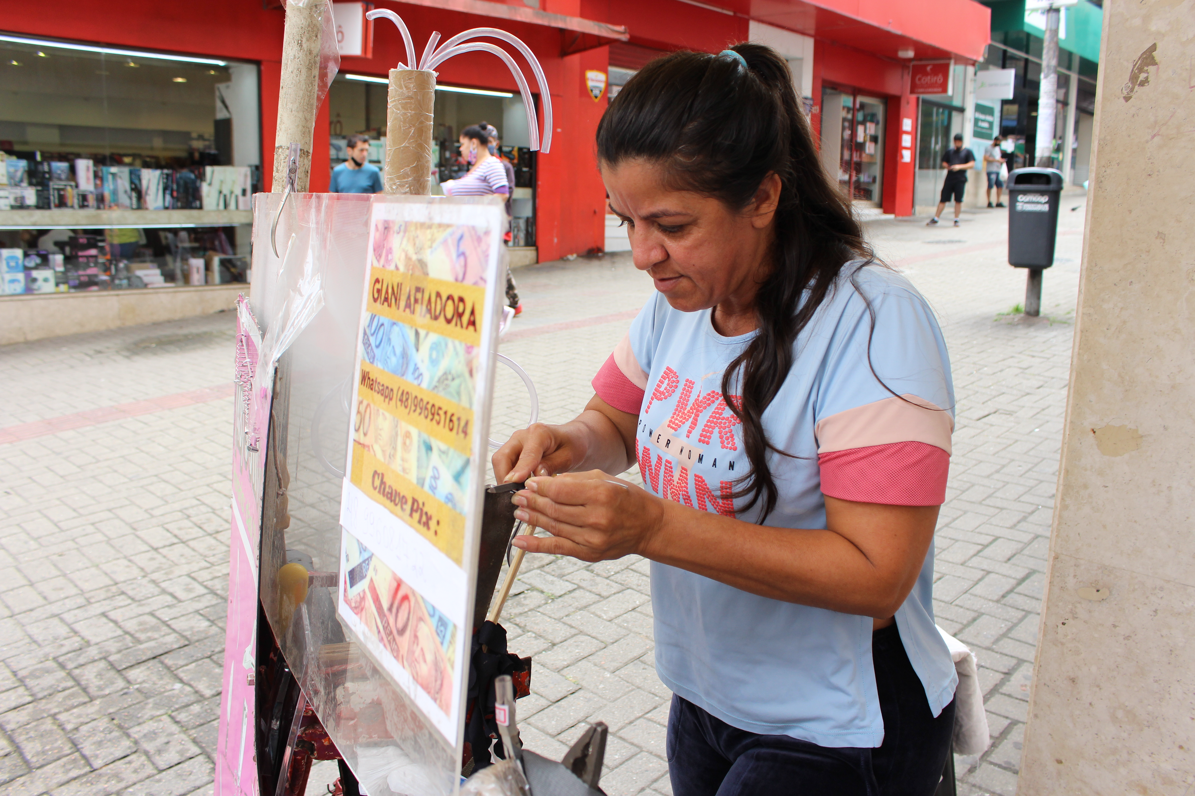 Olá. Eu me chamo Giani, tenho 45 anos e já sou afiadora há praticamente vinte anos. Aprendi com meu falecido marido, mas exerço a profissão sozinha há 15, até porque ele faleceu tem 10 anos. Iniciei com 18 anos e sou a única mulher afiadora no Centro da cidade de Florianópolis.