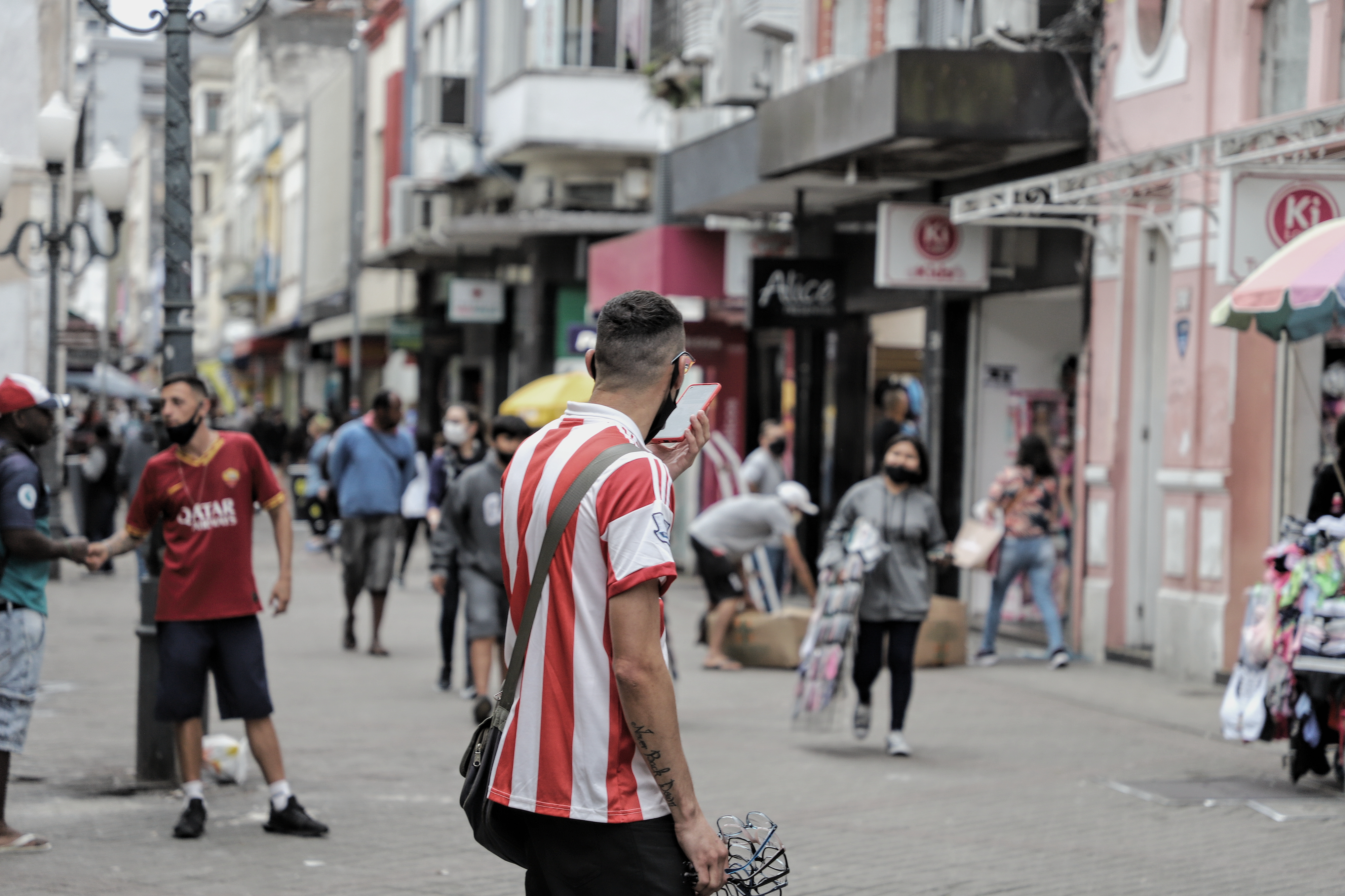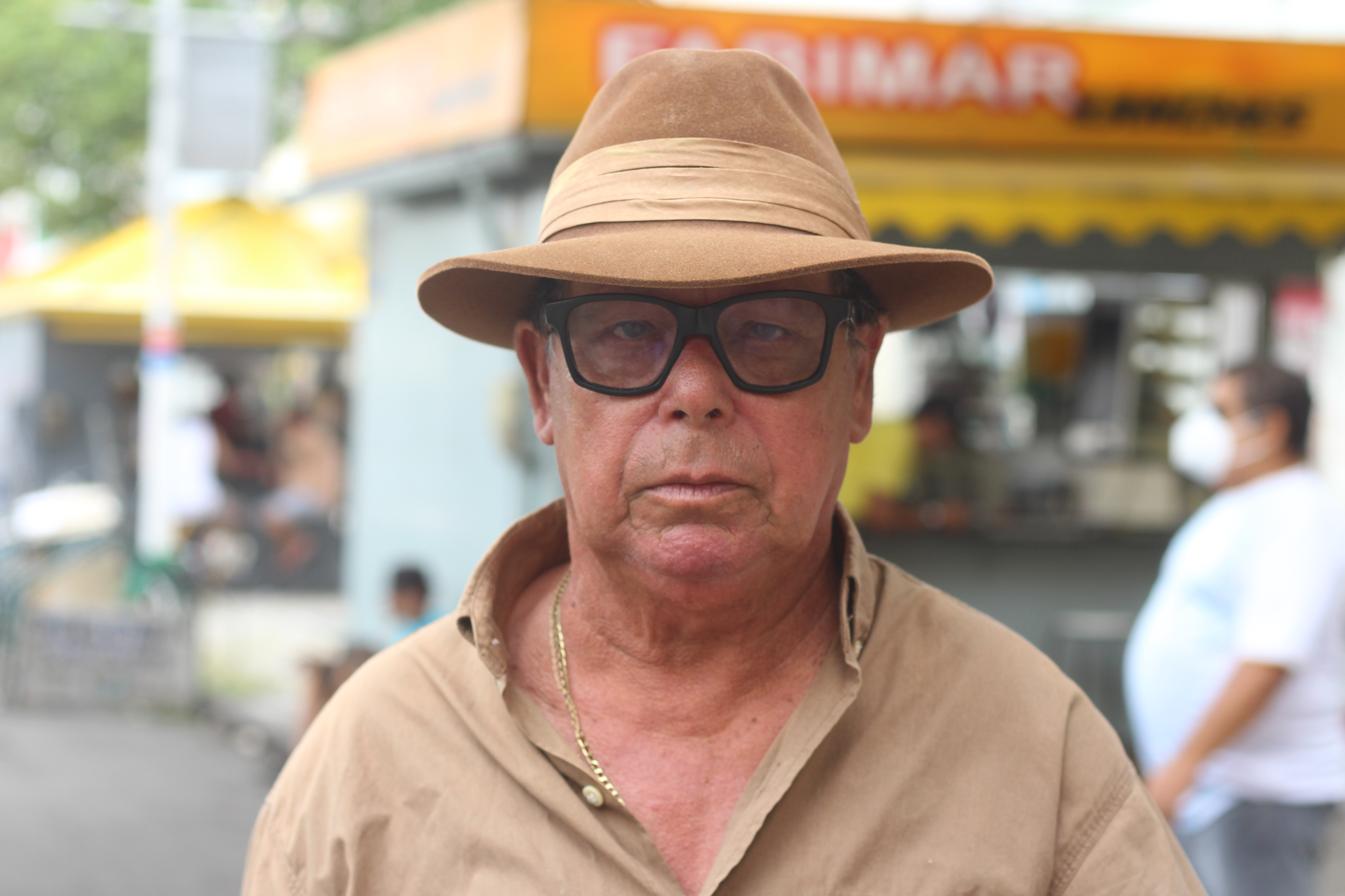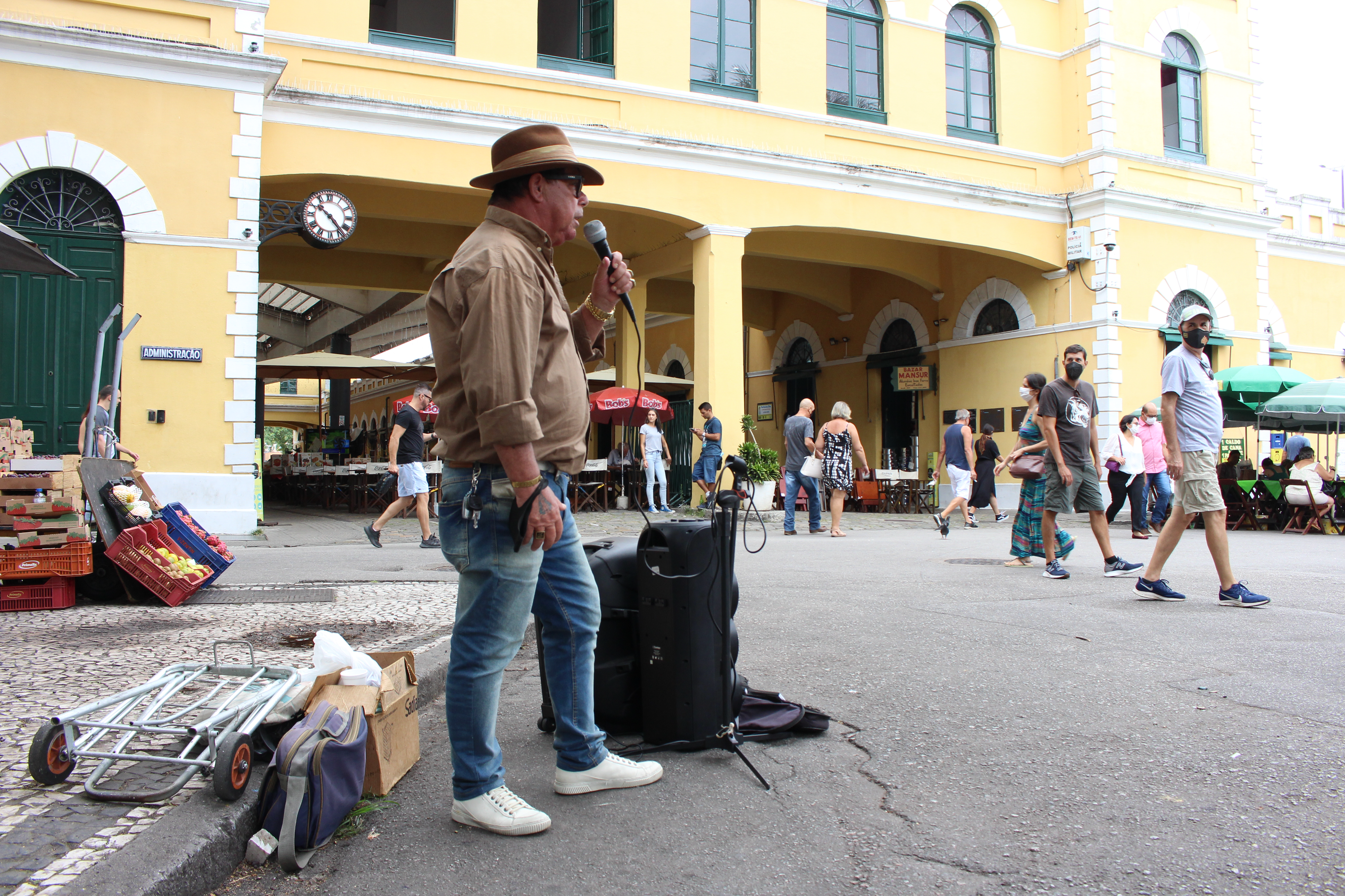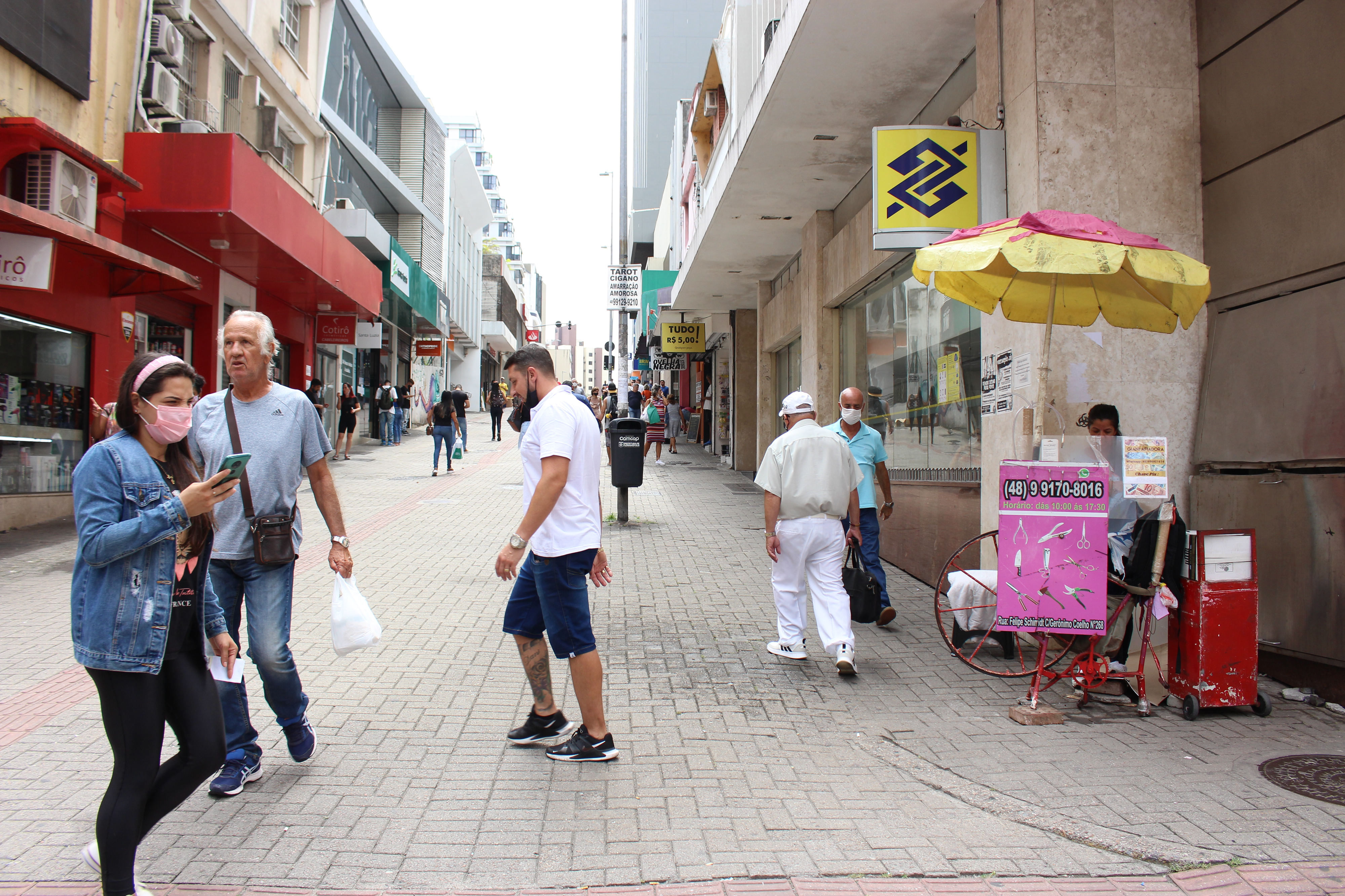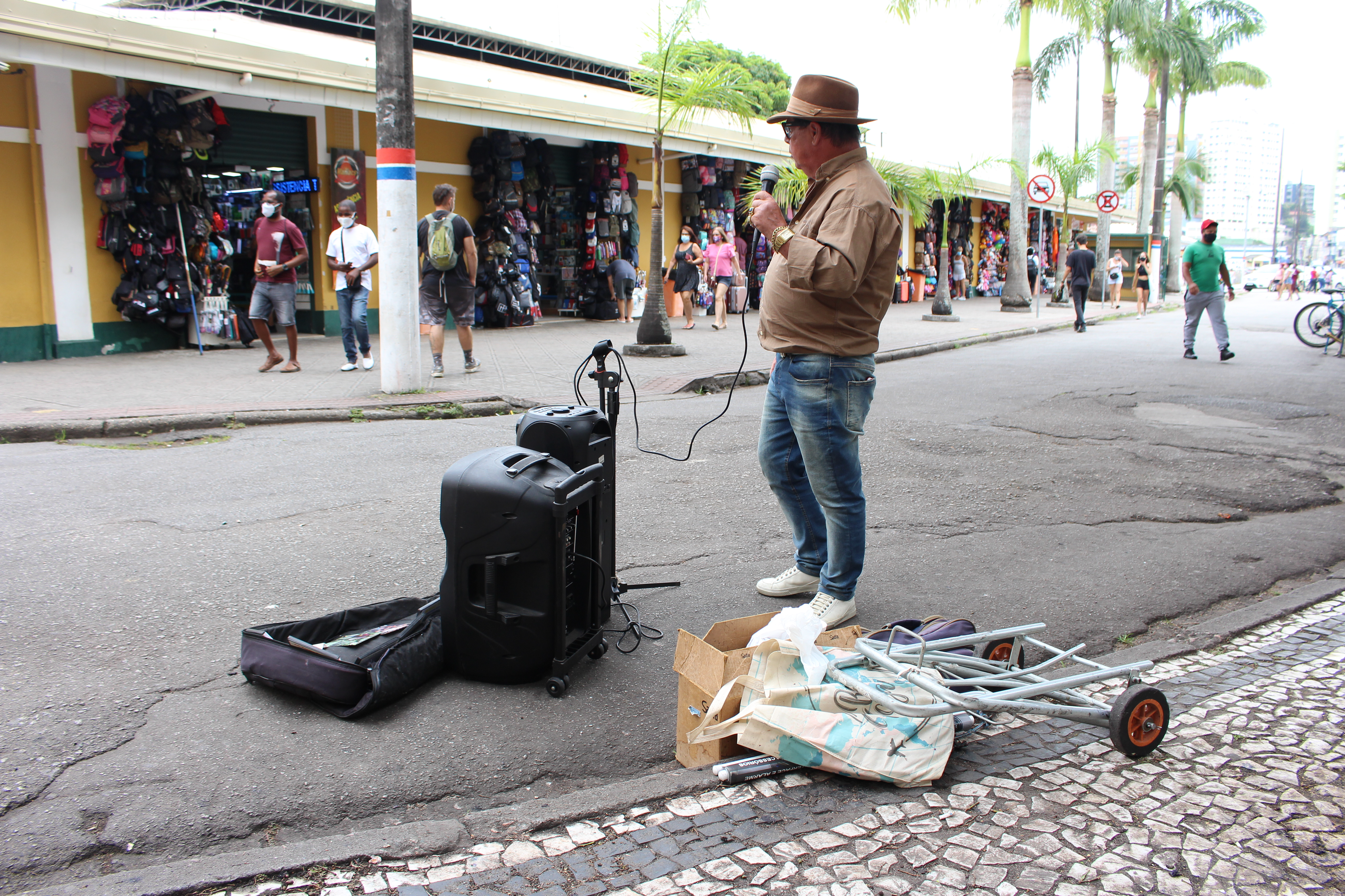 Sozinho no centro, acompanhou o período de queda do movimento e das vendas, e mesmo hoje, com a melhora da situação epidemiológica, defende que a situação ainda não se normalizou. “Eu chegava a vender 4 ou 5 mil por mês. Hoje vendo 2 mil e pouco. A clientela caiu, olha aí o tanto de gente que tem. É pingadinho, né? Isso aqui era um lugar muito povoado de gente. Tem dias que tem movimento, mas nada estabelecido.”