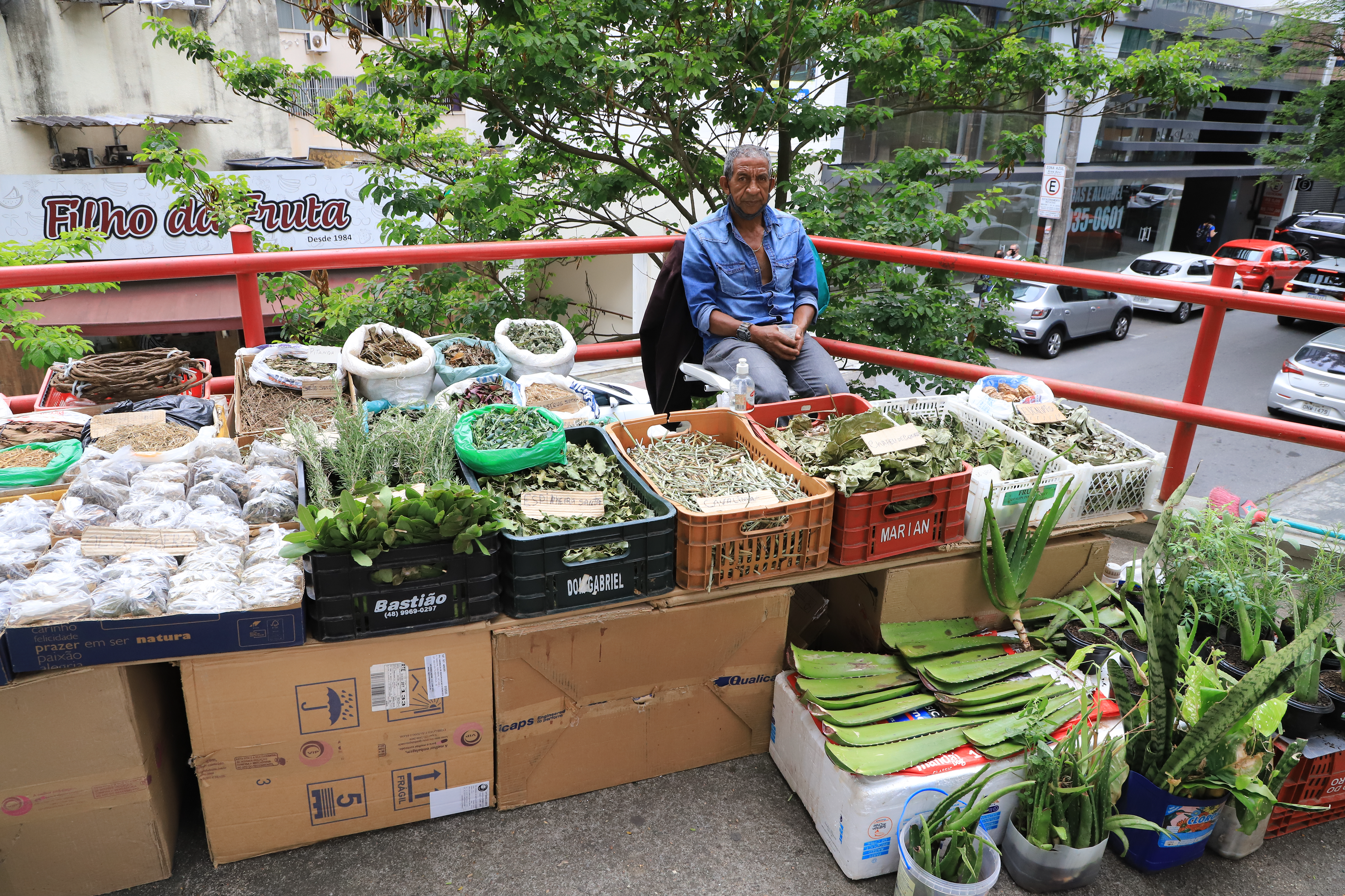 “Eu comecei a ter conhecimento das plantas medicinais quando tinha 25 anos. Eu vim para Florianópolis e vi que aqui na cidade as pessoas buscavam bastante por isso, tinha demanda. Aí eu resolvi abrir a banca e vender elas por aqui. Tô aqui até hoje. Faz vinte anos de Centro, mas nesse ponto faz oito anos. Antes trabalhava no Direto do Campo.”