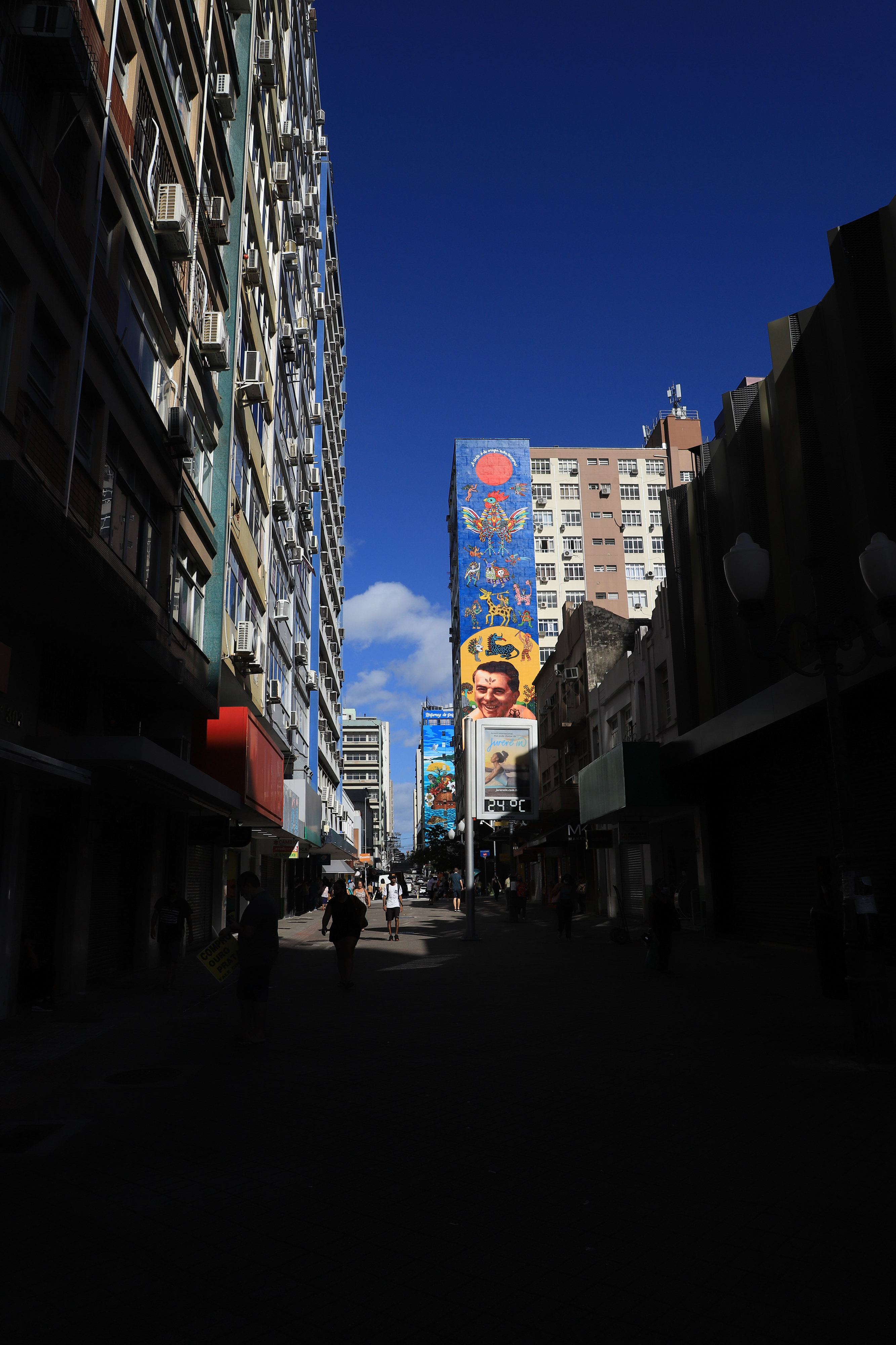 As ruas do Centro de Florianópolis são palco de cenas variadas. Tem gente que joga xadrez em mesas de concreto em algumas das esquinas. São sempre dois no desafio e outros senhores acompanhando de perto. Usando coletes verdes, pelo menos vinte negociantes compõem um grupo que grita o dia todo “compro ouro”. Parados no semáforo, uma mulher discute com o homem do carro ao lado sobre a posição do veículo na via. De roupa amarela e debaixo do sol, uma idosa derruba a sacola ao tentar se esquivar de uma placa não vista enquanto mexia no celular. Entre uma loja e outra, um consultório e uma repartição pública, os sons que chegam aos ouvidos de quem passa variam do sertanejo aos desejos de “bom dia”.