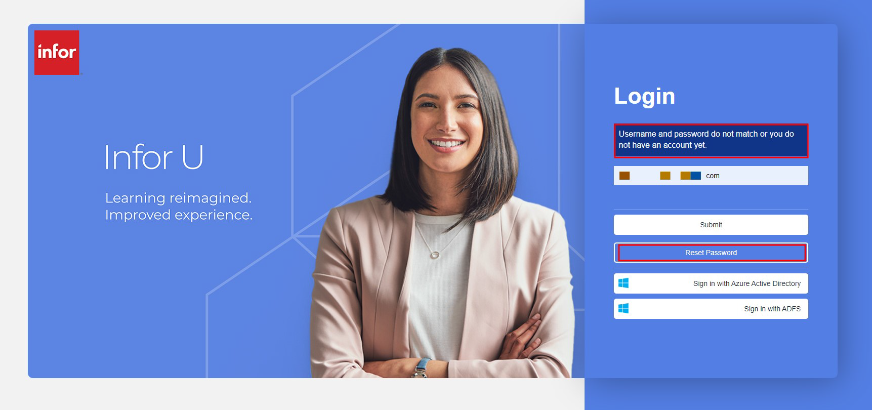 If a user is unable to recall the password for the Infor Concierge and Infor U Campus kindly follow these instructions. Resetting the password of the Concierge account will allow the user to access Infor U Campus via Sign in with ADFS (Single Sign-On [SSO] button).