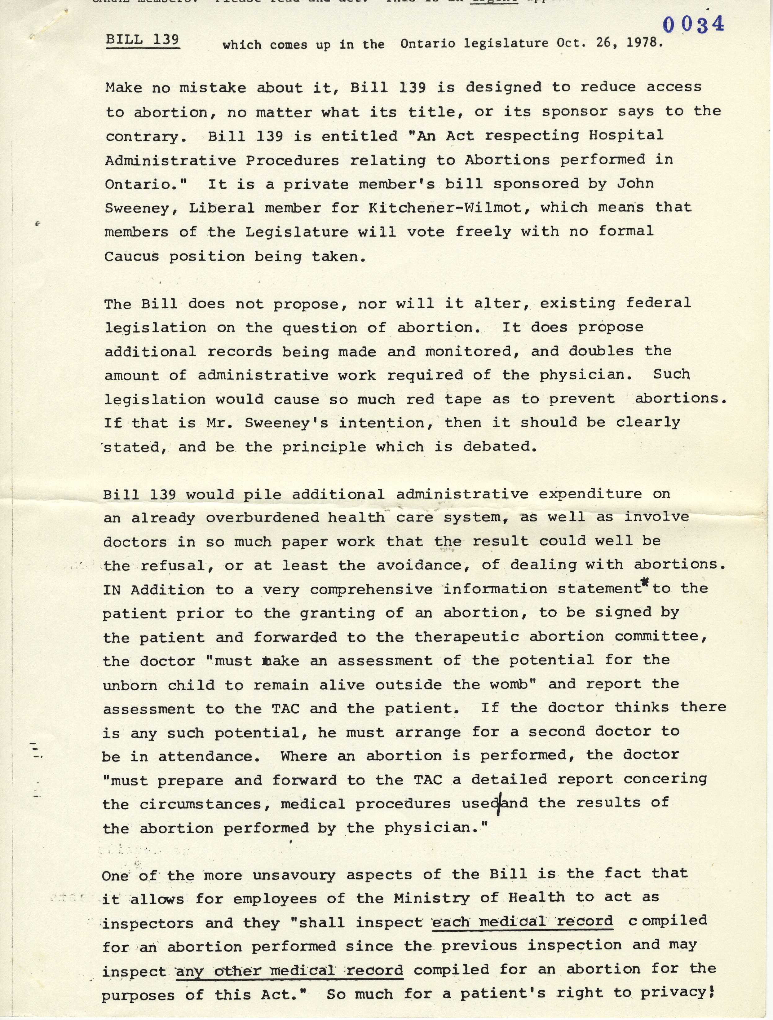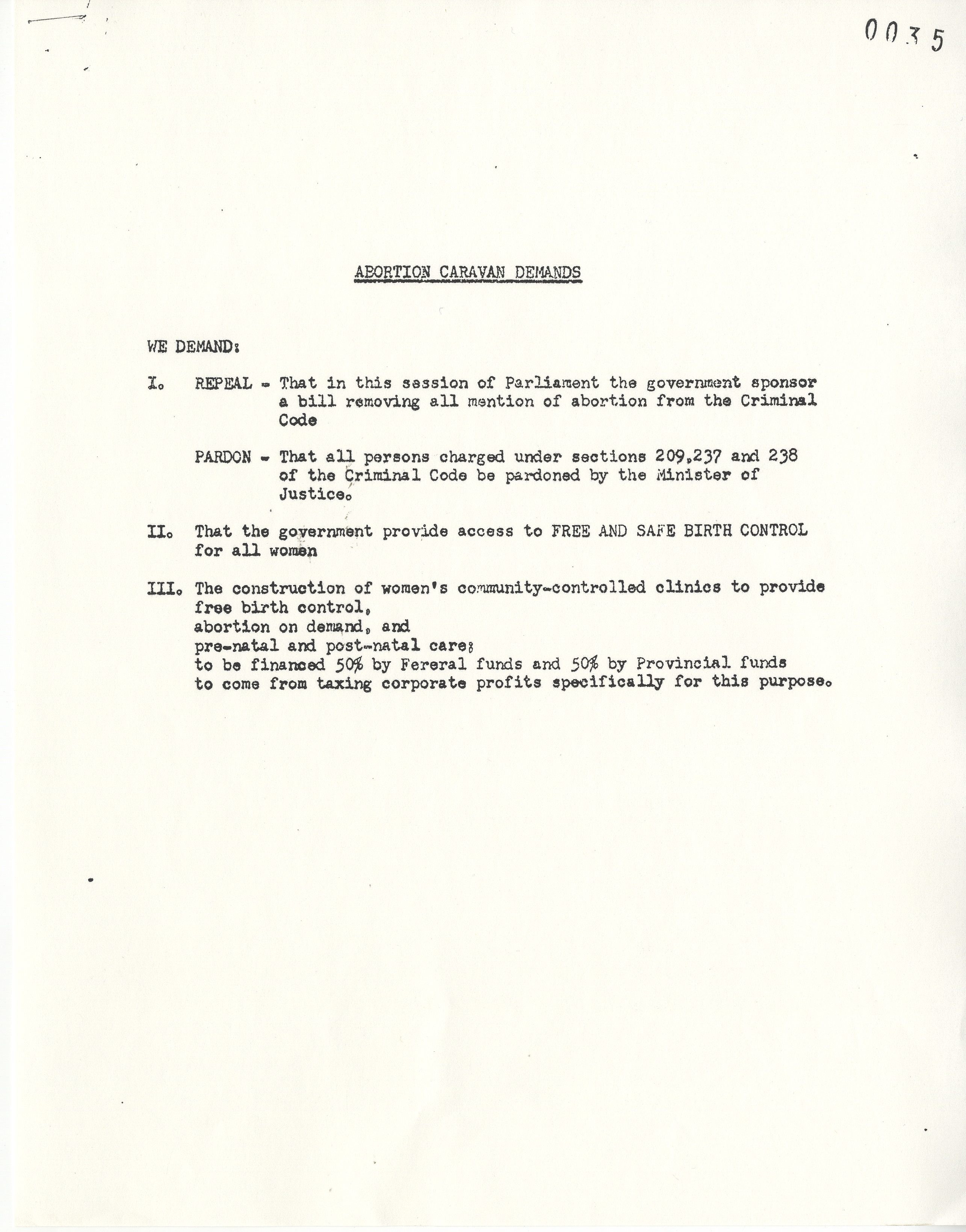 "WE CHARGE THE GOVERNMENT OF CANADA... of being responsible for the MURDER BY ABORTION OF 2,000 CANADIAN WOMEN, who enter hospitals for treatment of complications from illegal abortions... If another country murdered 2,000 Canadian WOMEN, the Canadian Government would take immediate steps to stop the murders and should the murdering not be stopped, the Government of Canada would probably call an Emergency meeting and could quite conceivably declare war on that country. Laws can be changed very quickly in wartime, in a state of national emergency. The deaths of thousands of women and the tragedy of unwanted pregnancies constitute such an emergency. We, therefore, demand that an Emergency Meeting be called to end such carnage of Canadian women by illegal abortion...We consider the government of Canada is in a state of war with the women of Canada..."
