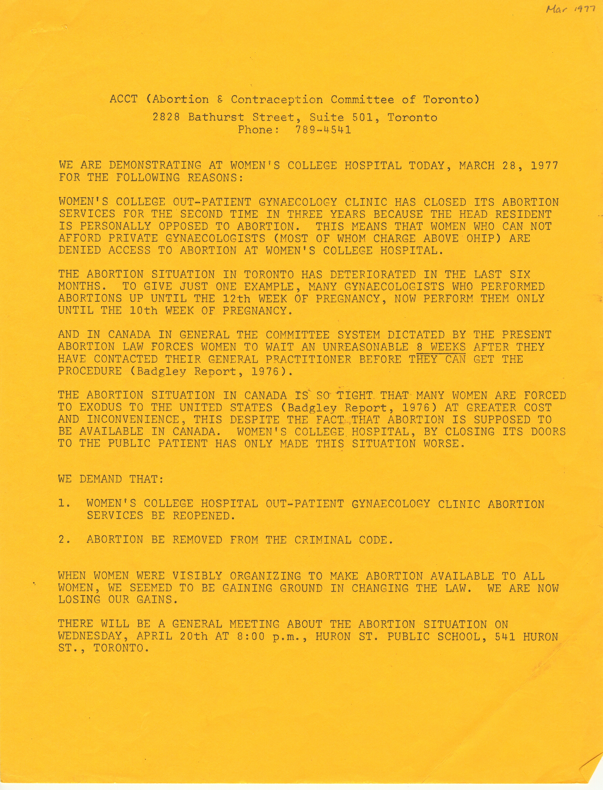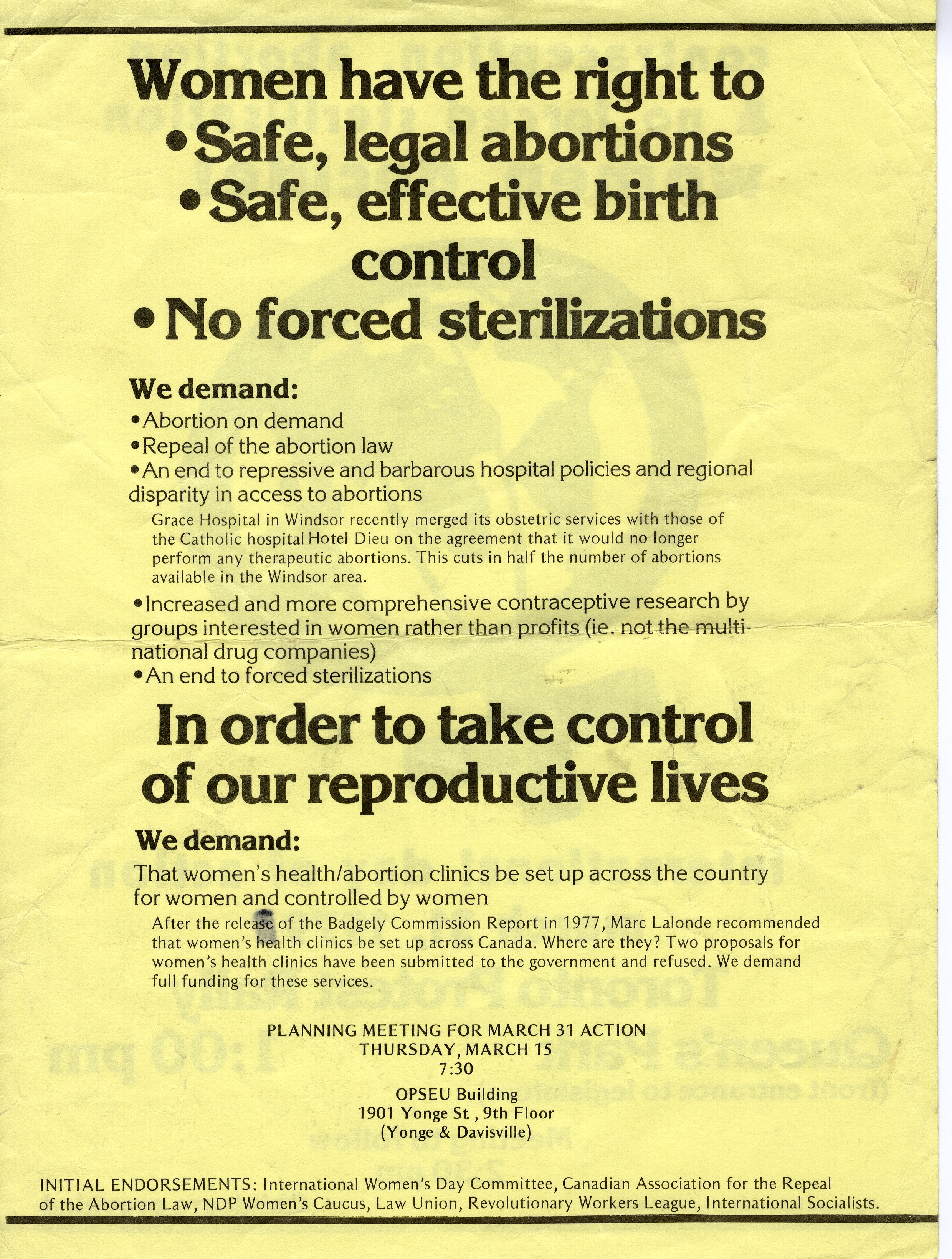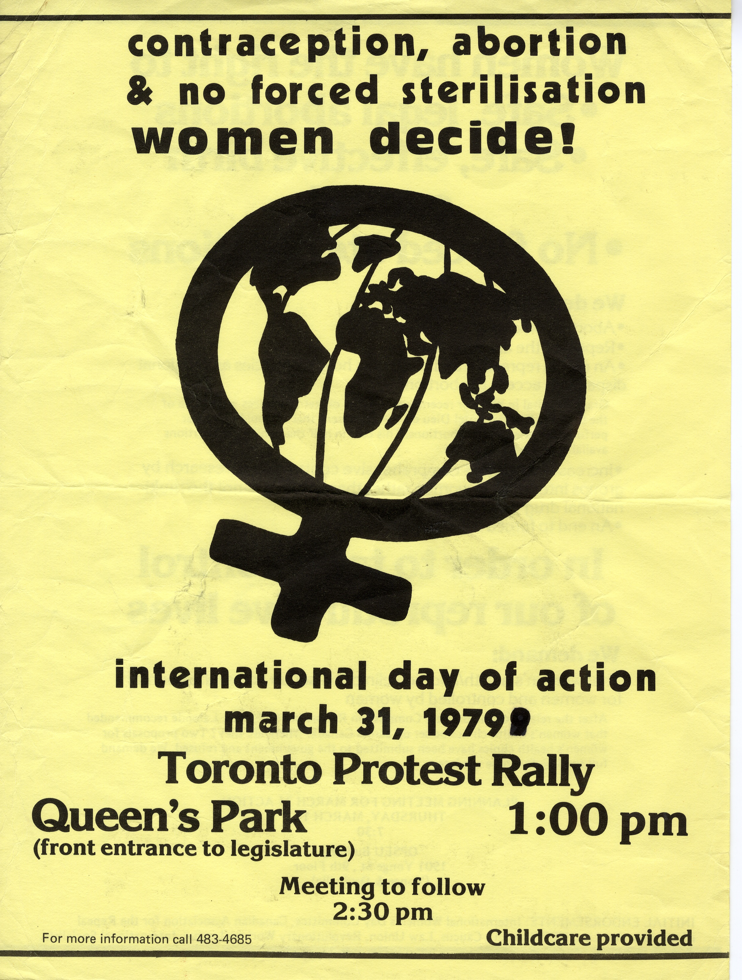 Right: Abortion and Contraception Committee of Toronto. Flyer (1977). From the CWMA collection (10-001) at University of Ottawa Archives and Special Collections.
