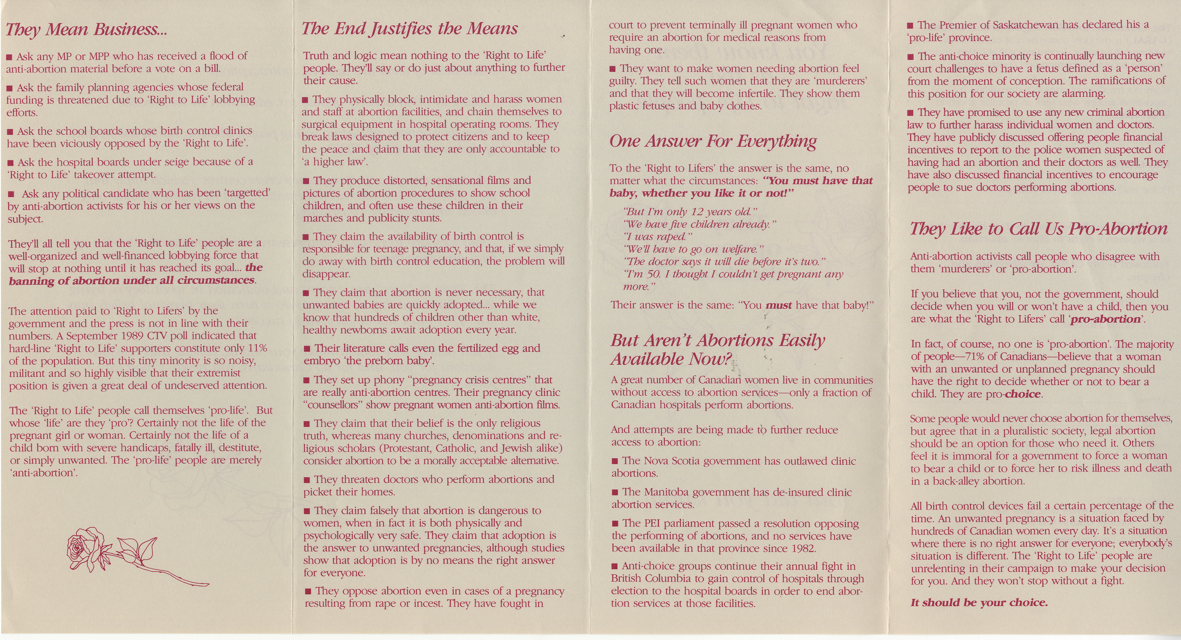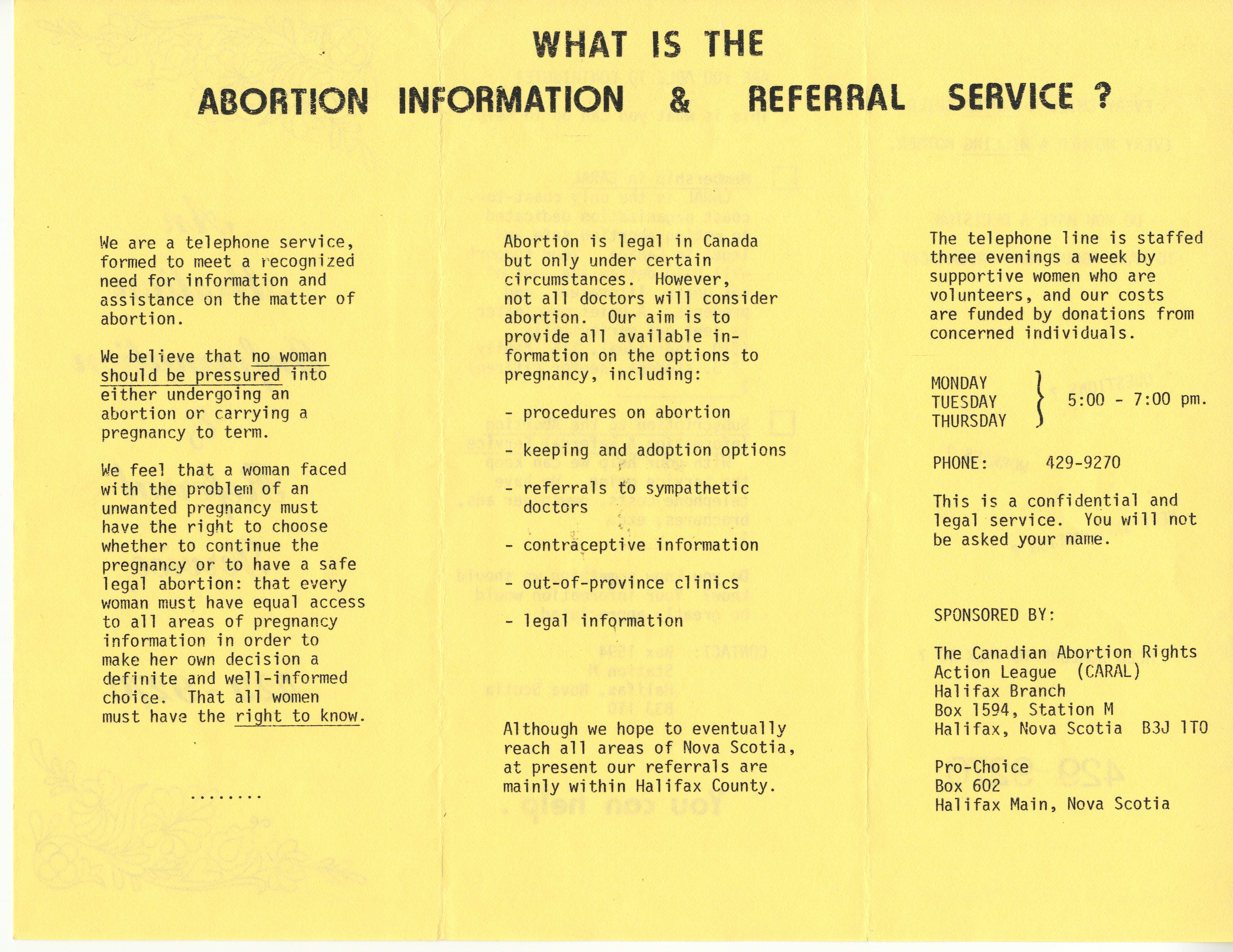 Left: Canadian Abortion Rights Action League. "An Abortion Information and Referral Service." Pamphlet (c.1979-1981). From the CWMA collection (10-001) at University of Ottawa Archives and Special Collections.