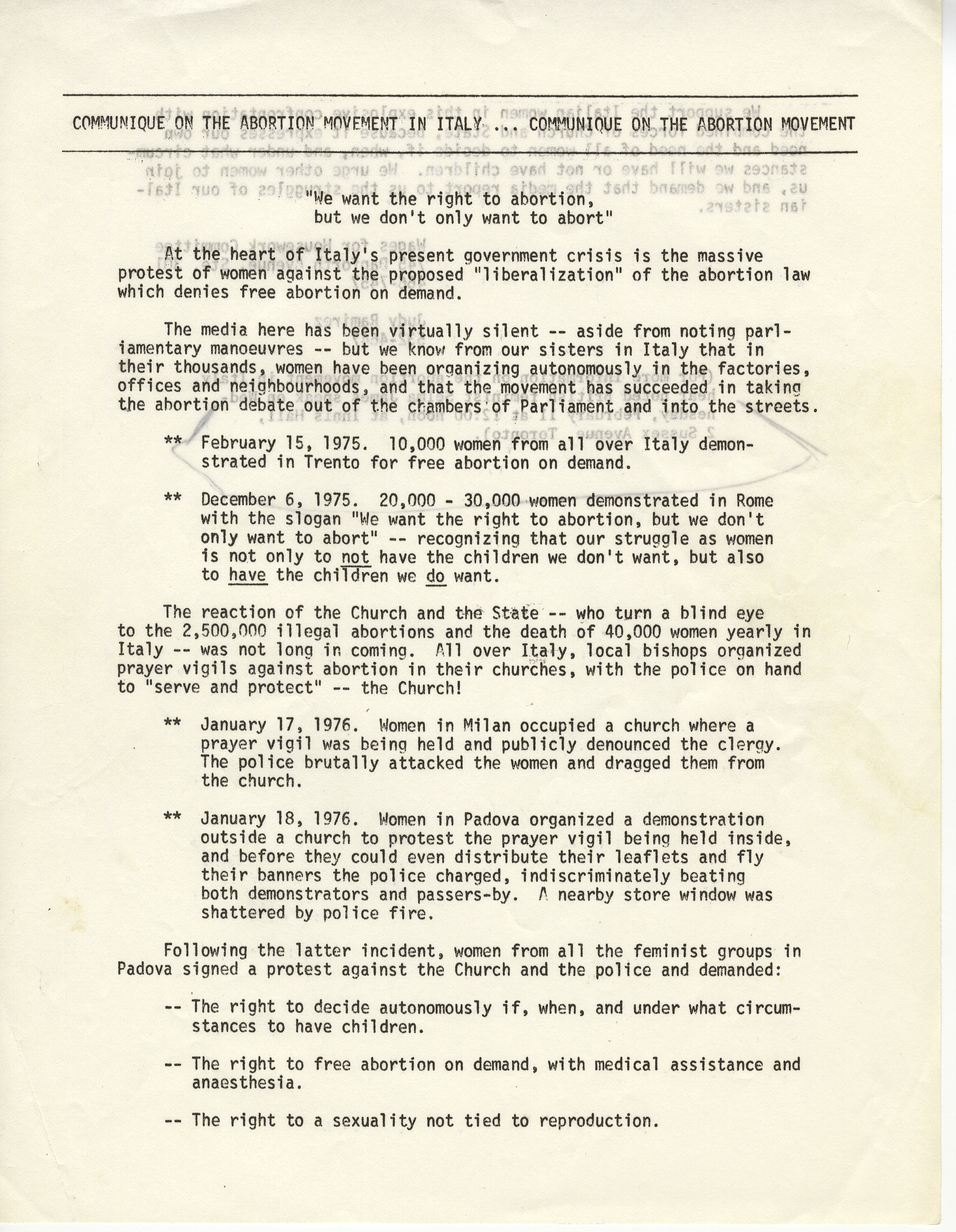 Left: Wages for Housework Committee. "Communique on the Abortion Movement in Italy" (1976). From the CWMA collection (10-001) at University of Ottawa Archives and Special Collections.
