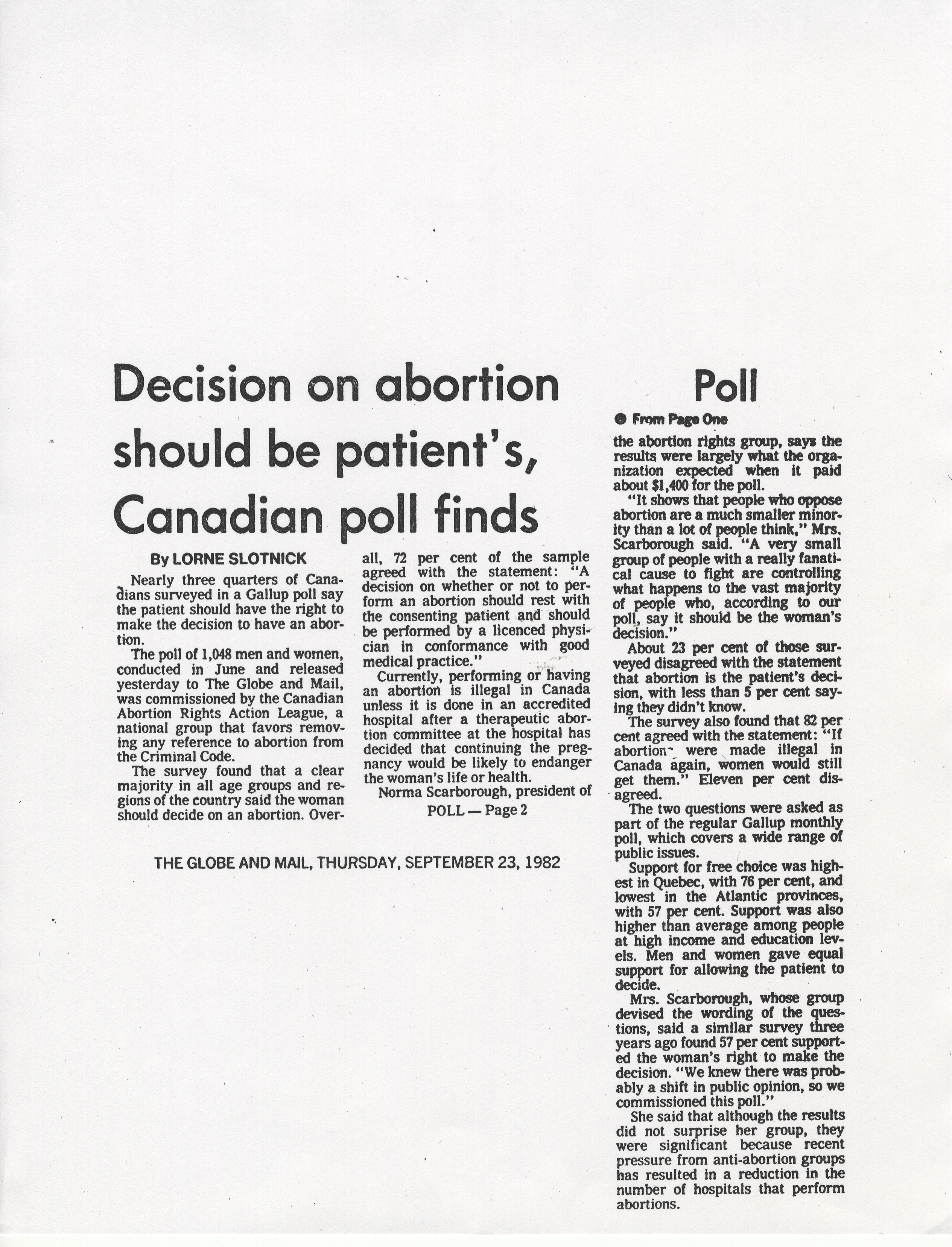 Slotnick, Lorne. "Decision on abortion should be patient's, Canadian poll finds." The Globe & Mail (23 September 1982). From the CWMA collection (10-001) at University of Ottawa Archives and Special Collections.