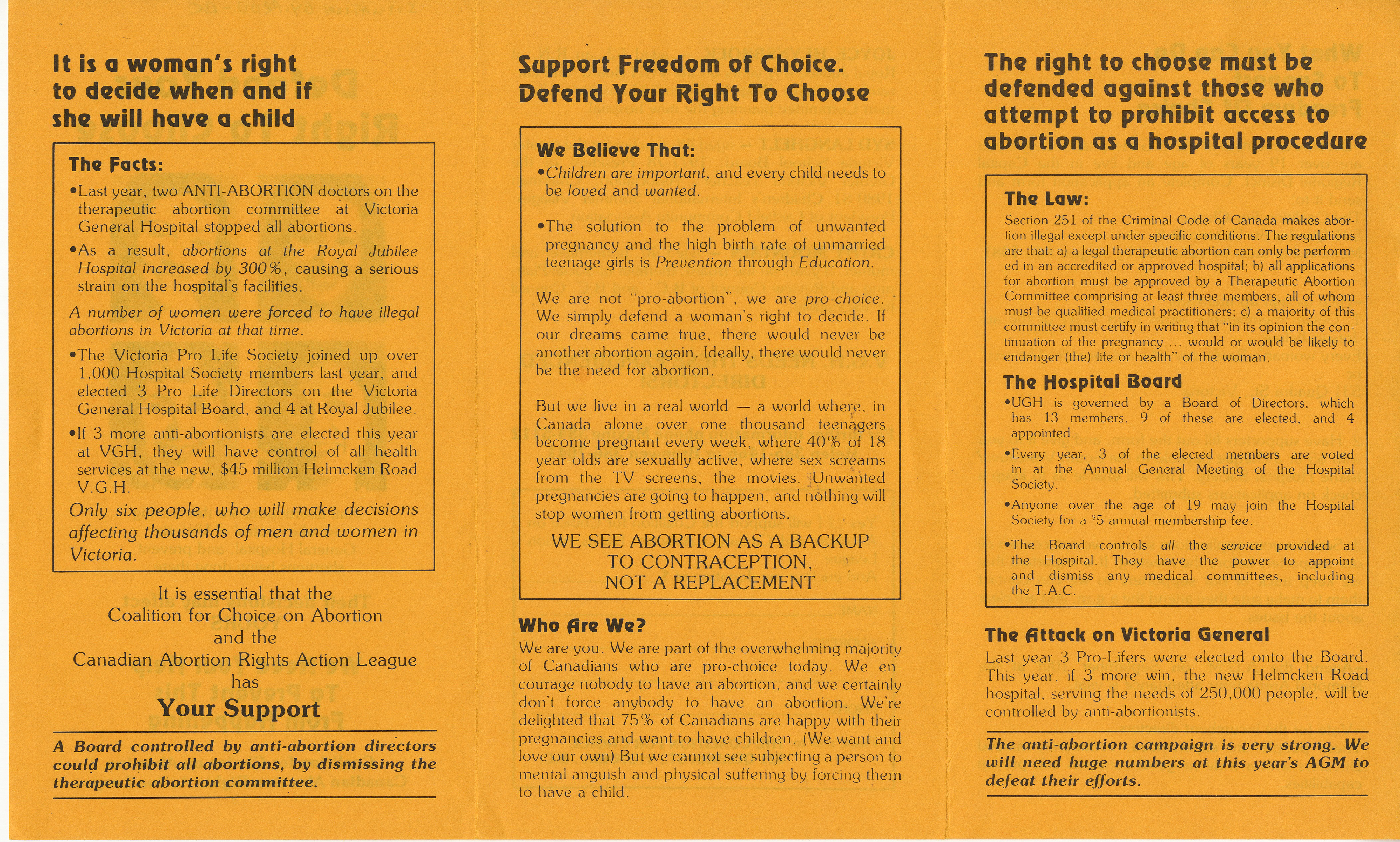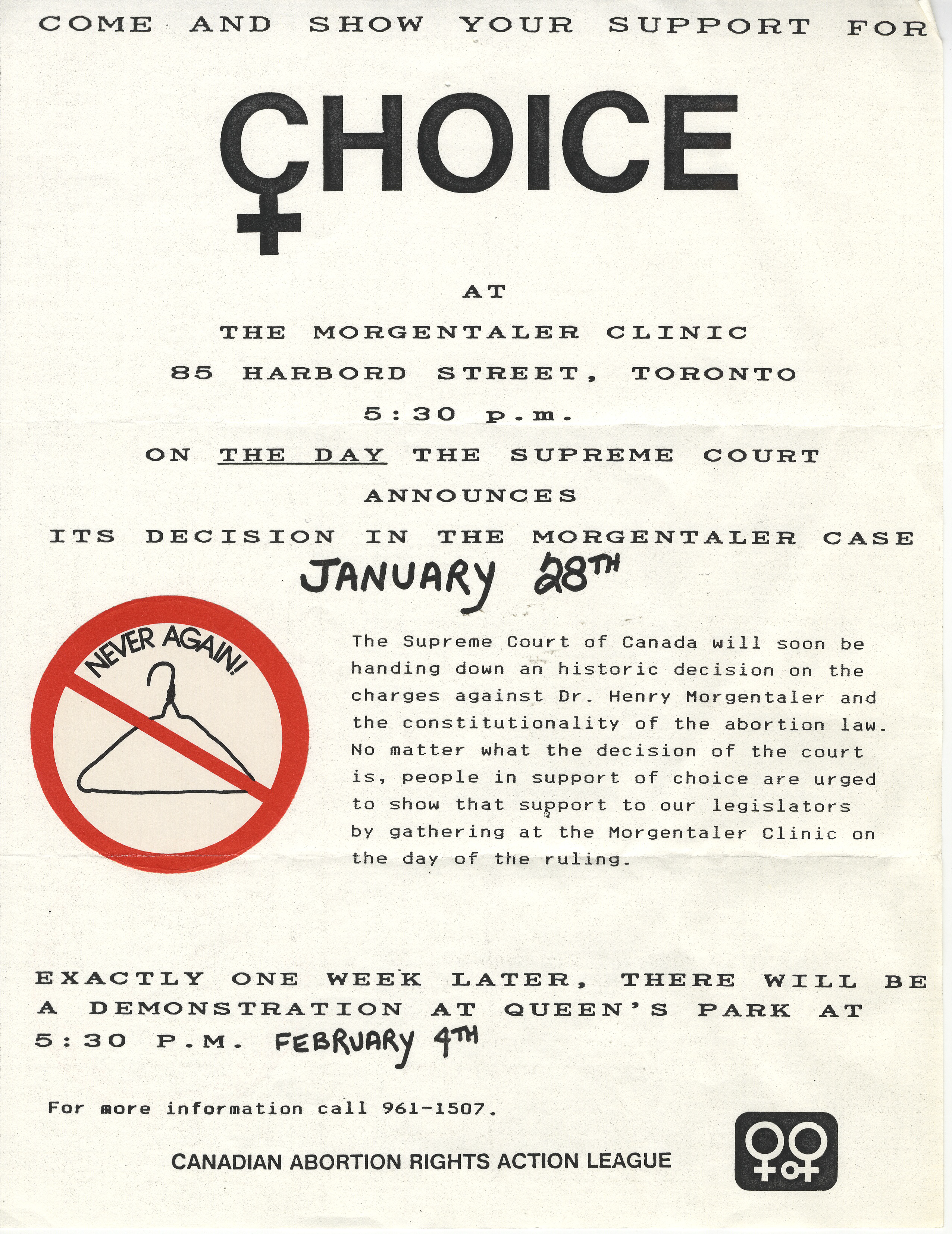 CARAL, originally called the Canadian Association for Repeal of the Abortion Law, was formed in response to the arrest and incarceration of Dr. Henry Morgentaler in 1974. In the 1970s, Dr. Morgentaler was repeatedly tried and once jailed for providing safe, yet illegal abortions from his free-standing clinic in Montreal. Like the VCW, Morgentaler not only believed in a woman's right to choose abortion, but viewed access to contraception as a fundamental aspect of reproductive health care. Morgentaler was one of the first Canadian doctors to perform vasectomies, insert IUDs, and provide unmarried women with birth control before it became legal to do so under Bill C-150 in 1969 (this is the same bill that allowed for "therapeutic abortion," but only with doctor and hospital board approval).