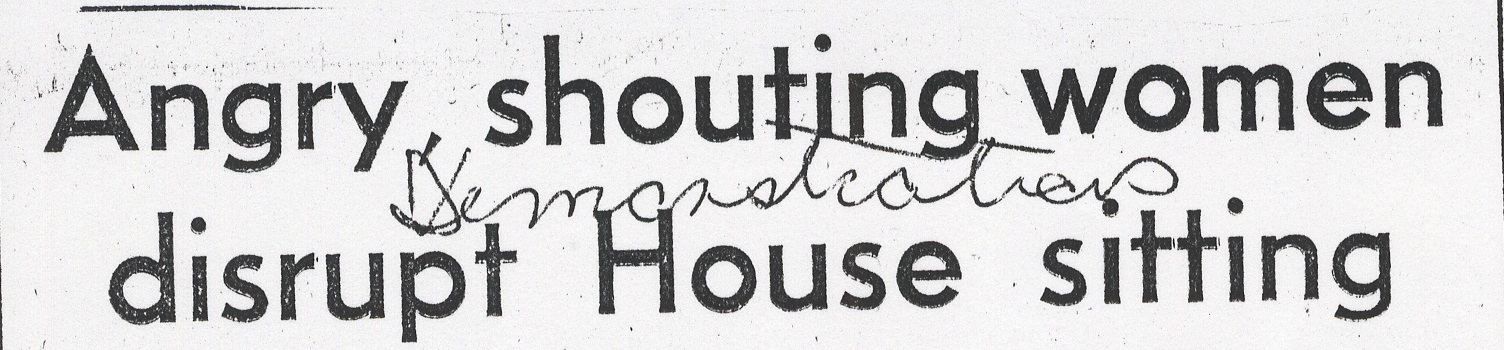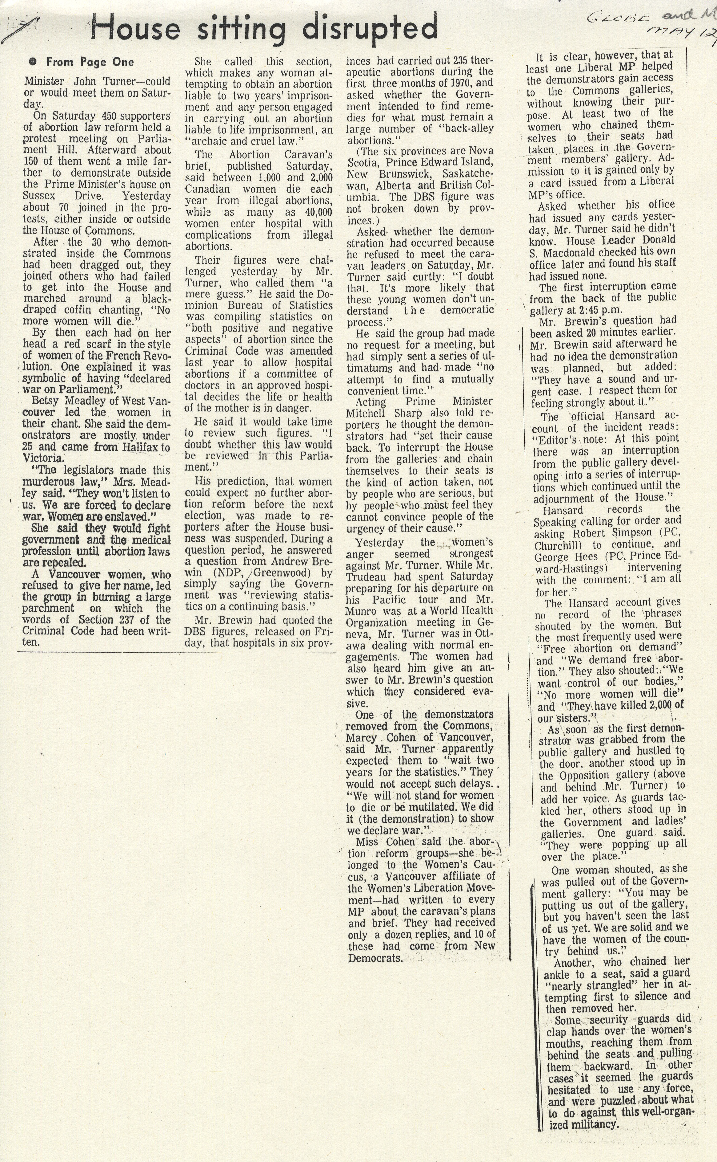 Sanger, Charles. "Angry, shouting women disrupt house sitting." The Globe and Mail (12 May, 1970).