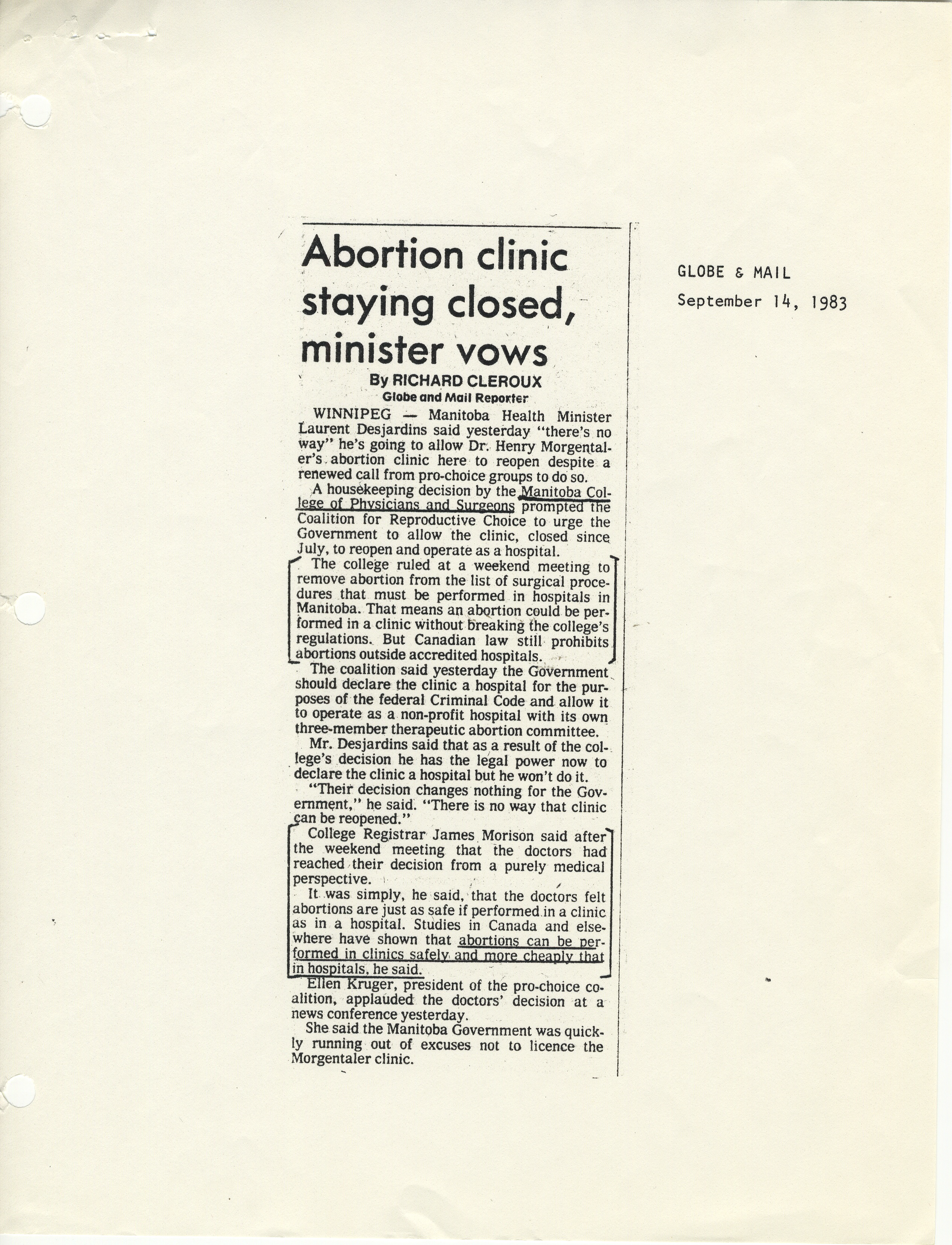Cleroux, Richard. "Abortion clinic staying closed, minister vows." The Globe & Mail (14 September 1983). From the CWMA collection (10-001) at University of Ottawa Archives and Special Collections.
