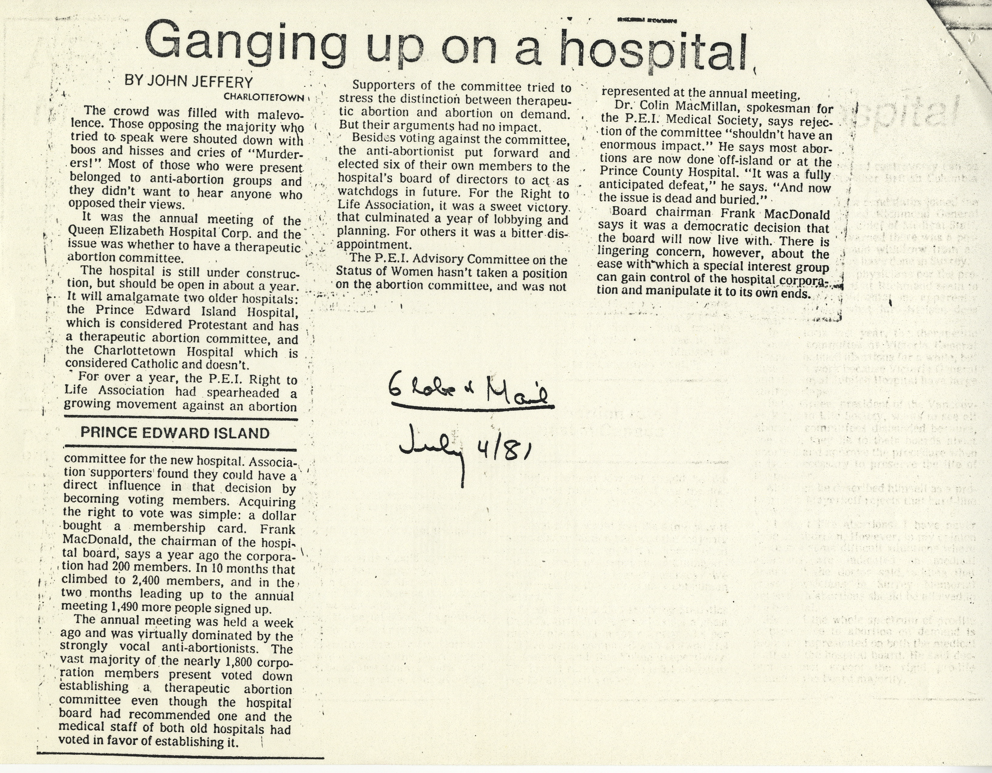 Jeffrey, John. "Ganging up on a hospital." The Globe & Mail (4 July 1981).
