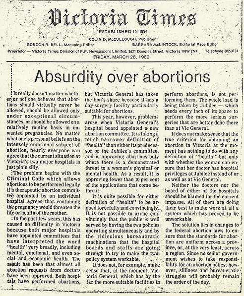 Bell, Gordon R., ed. "Absurdity over abortions." Victoria Times (28 March 1980).