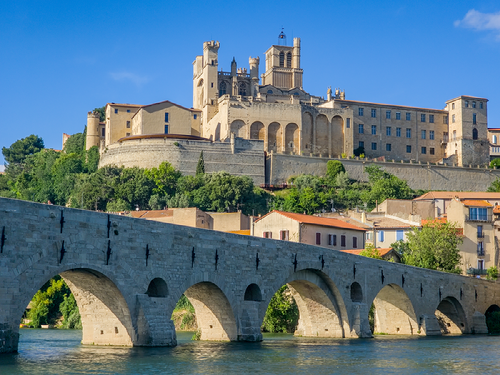The Orb River runs through the city of Béziers and makes for a picturesque setting with the Pont Vieux in the foreground and the Catedral de Saint-Nazaire de Béziers towering above.
