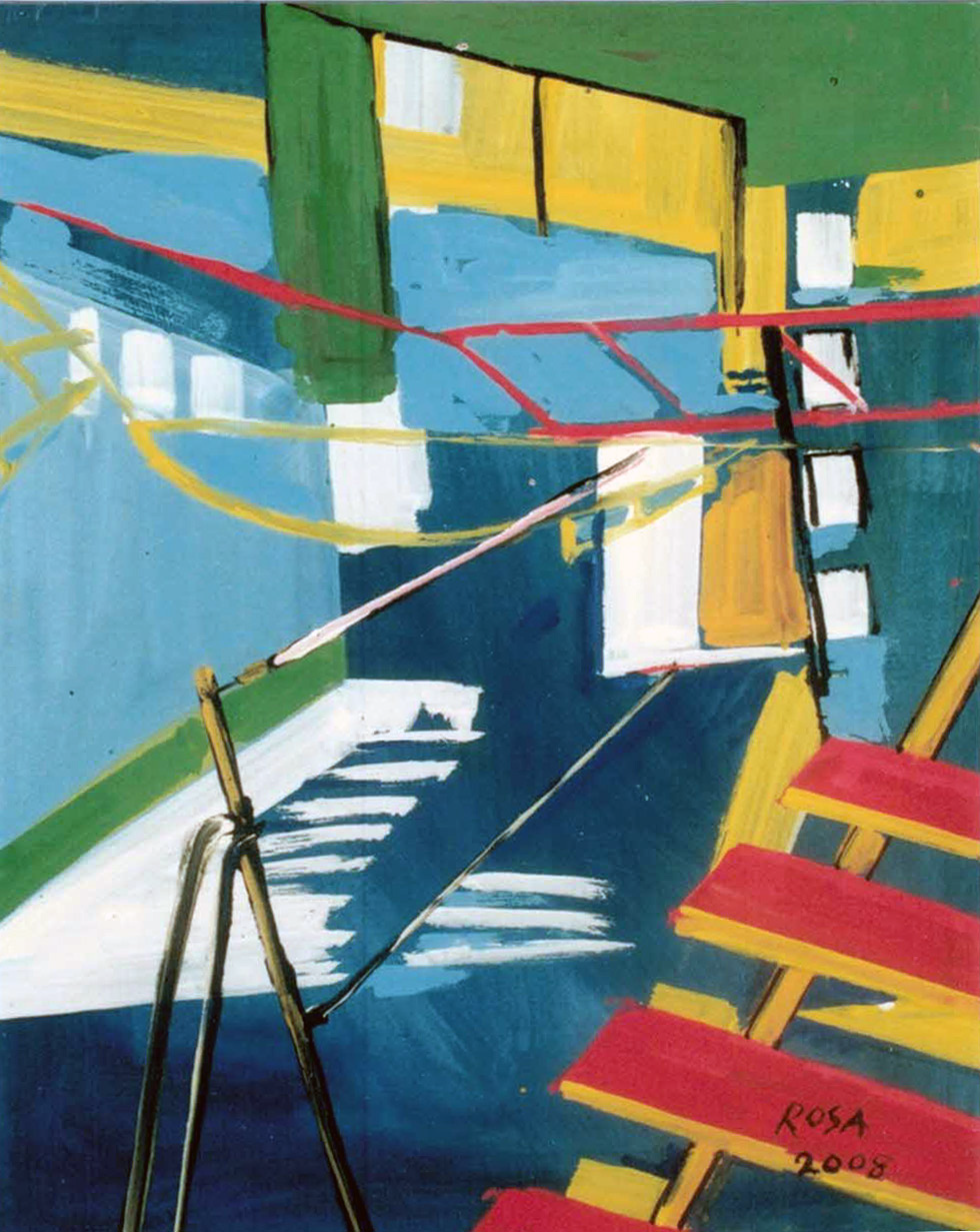 Nella visione di Rosa lo spazio architettonico non è inteso come ambiente funzionale e tridimensionale ma come orgiastico accostamento di forme e cromie da estrapolare per realizzare nuove ed originali sperimentazioni visuali. Masse, linee e forme diventano capaci di definire soluzioni improbabili e nuovi concetti estetico-espressivi.