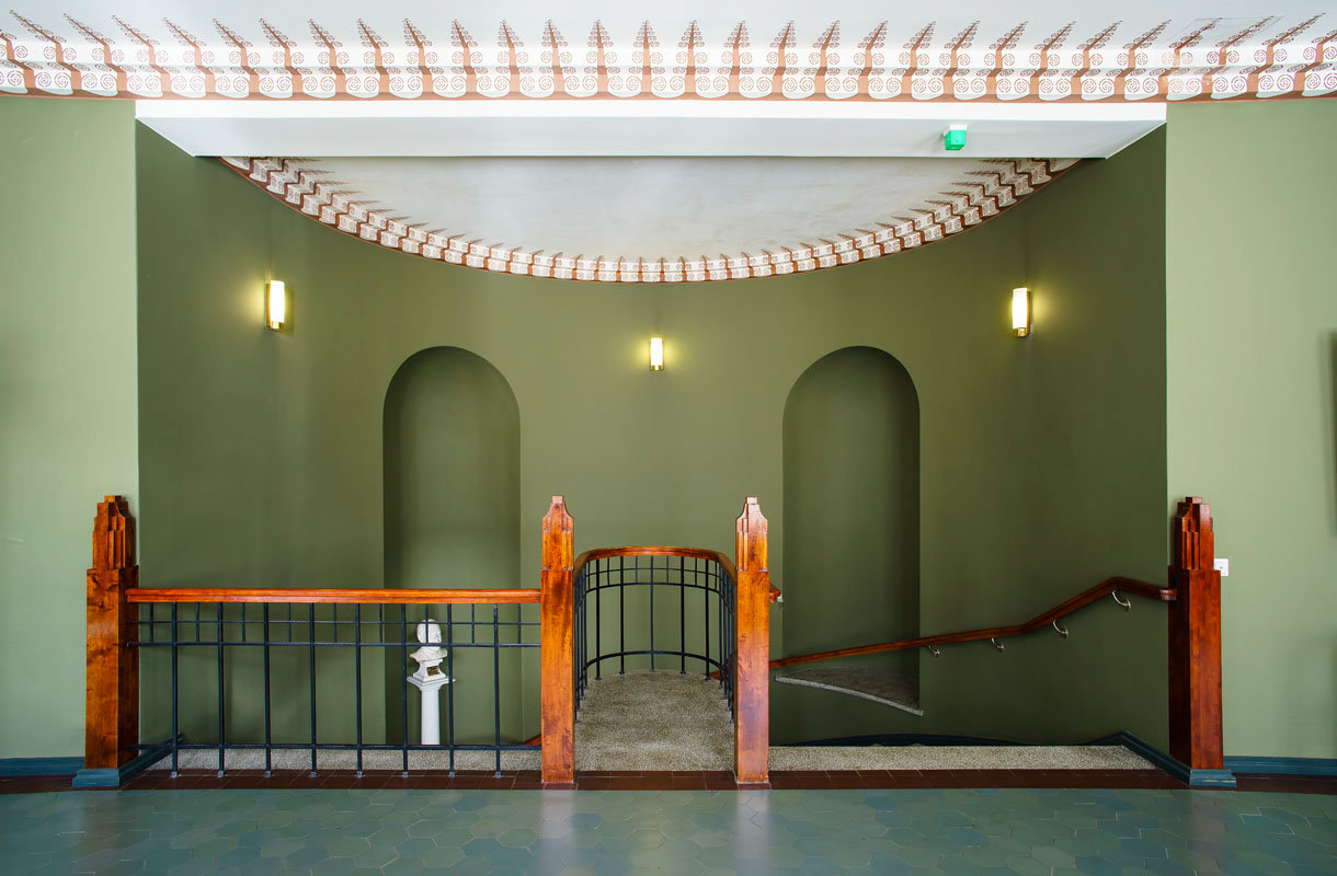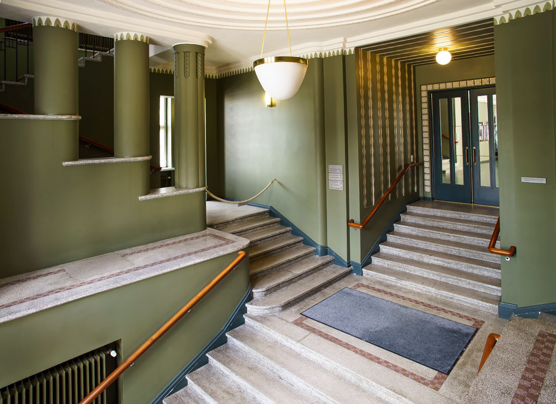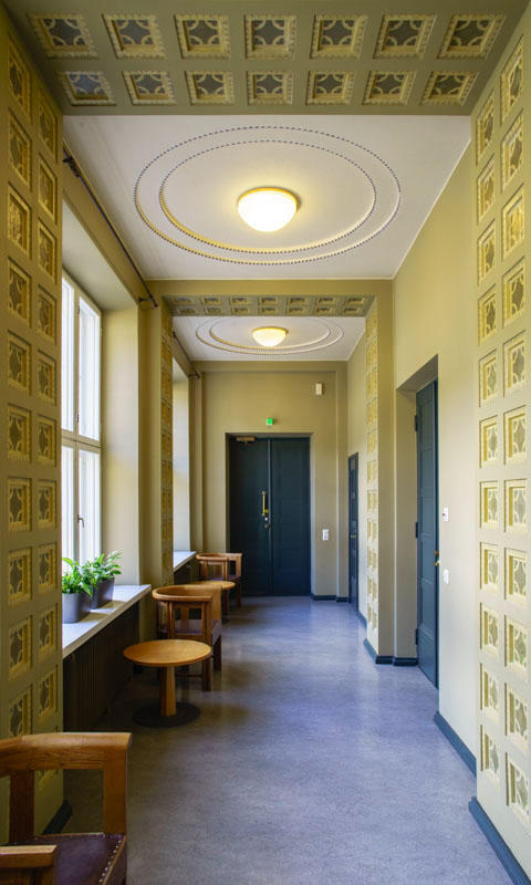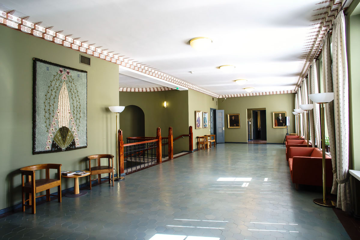 Kolmannen kerroksen hallintosiiven aulatilat. Seinällä olevan Ruusuryijyn mallin on suunnitellut Eliel Saarinen vuonna 1904.