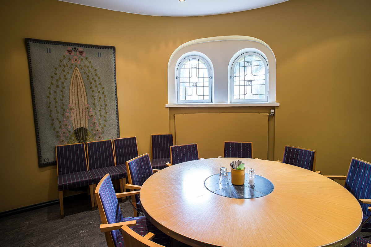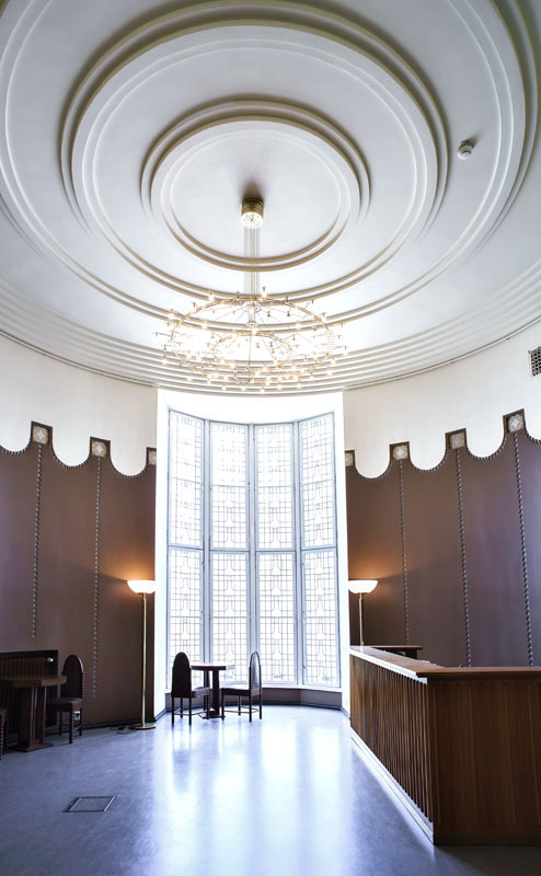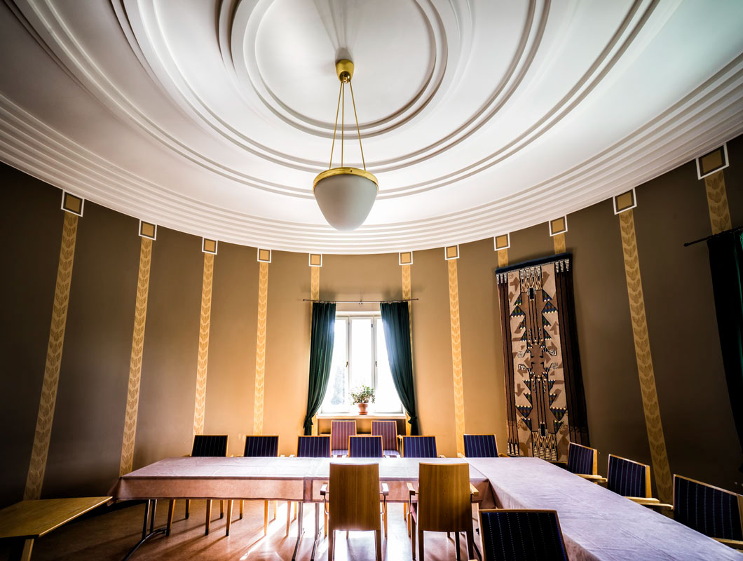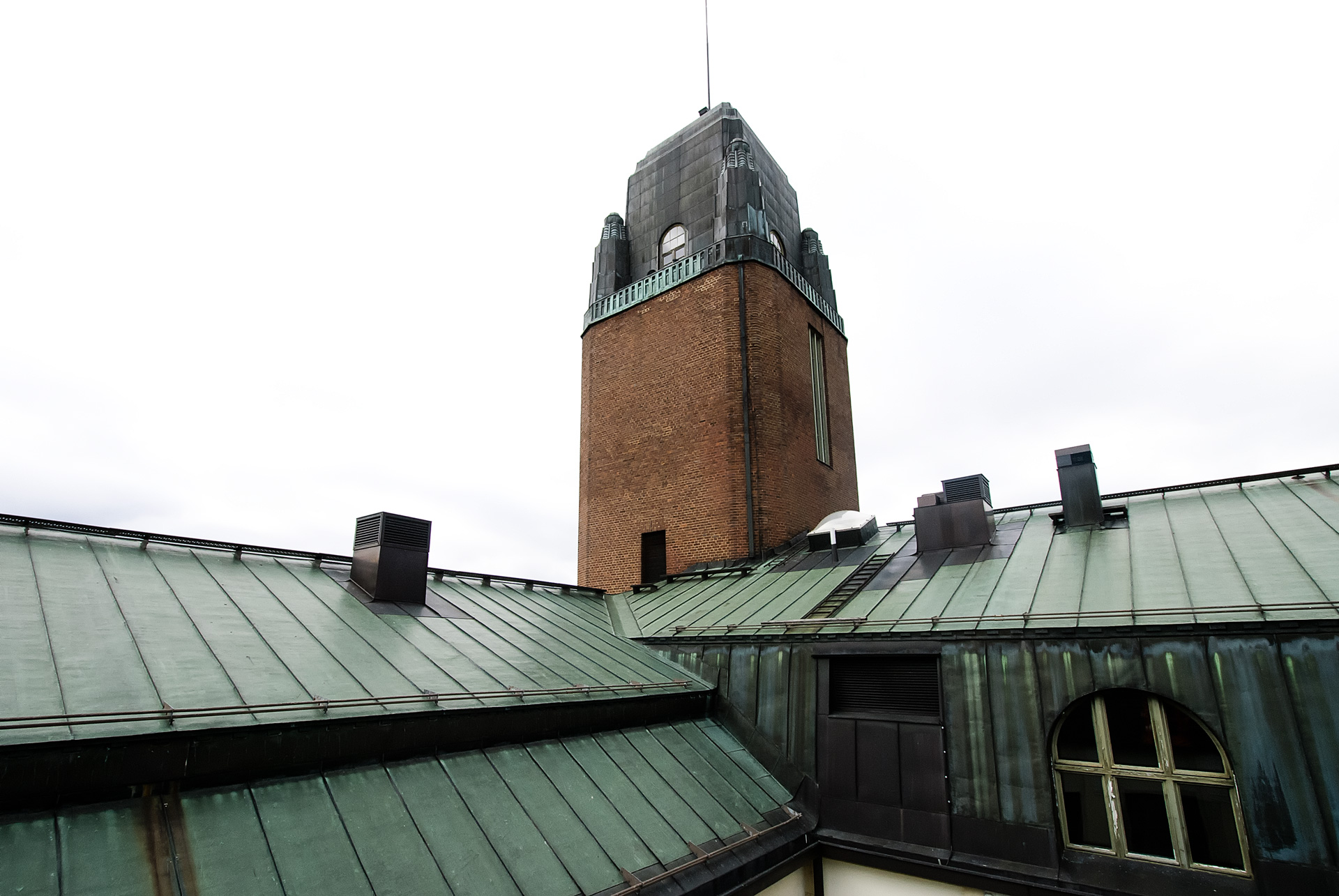 Kolmannen kerroksen hallintosiiven aulatilat. Seinällä olevan Ruusuryijyn mallin on suunnitellut Eliel Saarinen vuonna 1904.