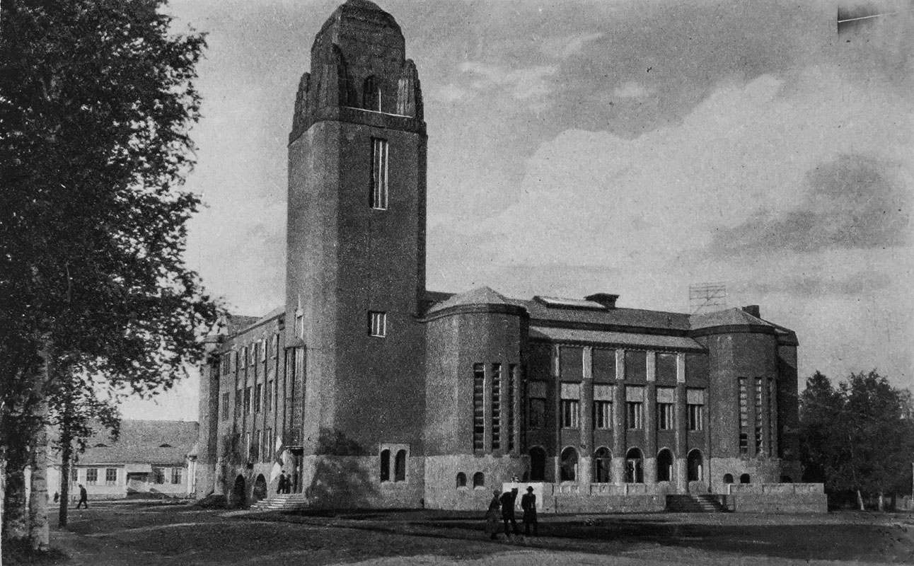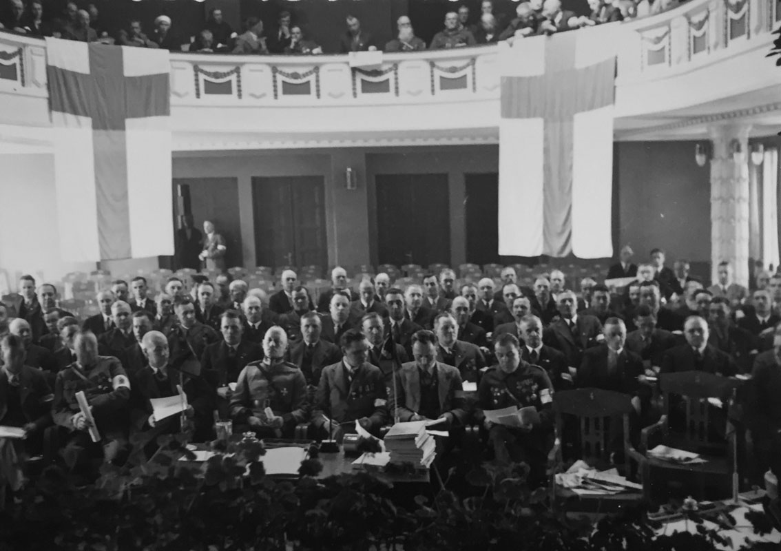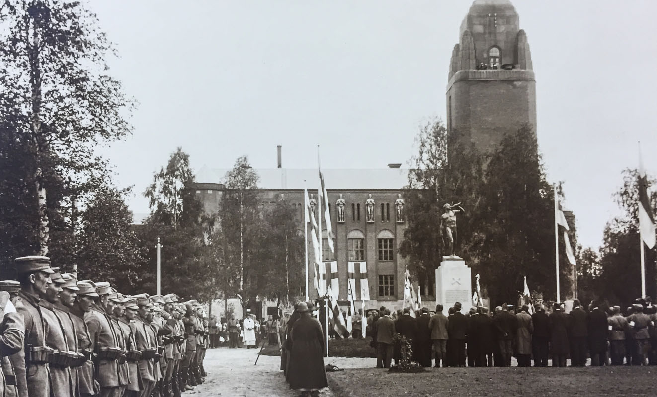 Joensuun kaupungintaloa ympäröi maailmansotien välillä vahva valkoisen Suomen perintö. Kuva Vapaussodan Rintamamiesten Liiton liittokokouksesta vuodelta 1937. Kuva Karjalaisen arkisto.
