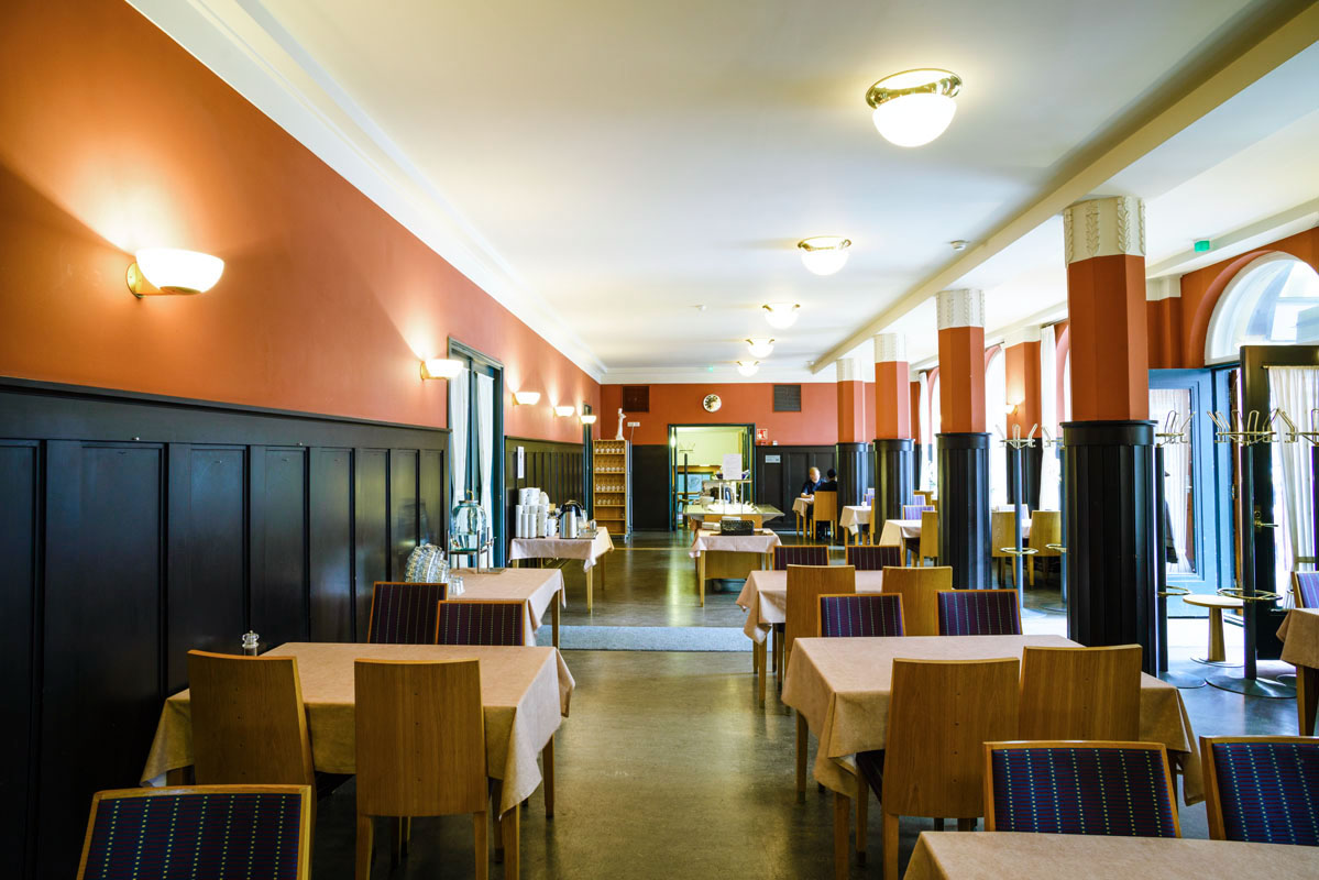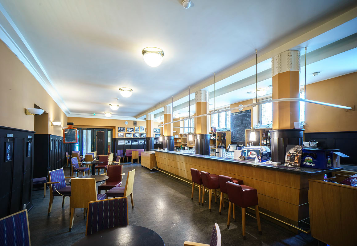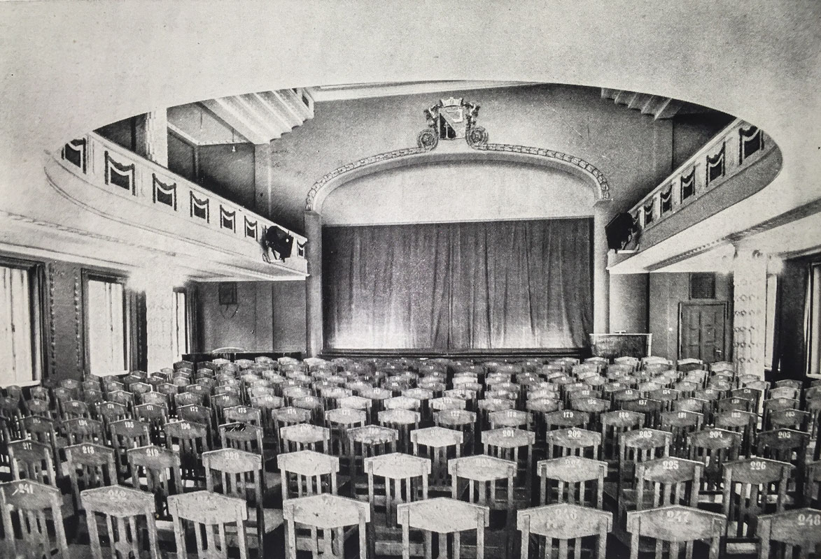Taustalla Eliel Saarisen suunnittelemat istuimet ja pöydät teatterin lämpiöön. Kuvat Joensuun kaupungin keskusarkisto.