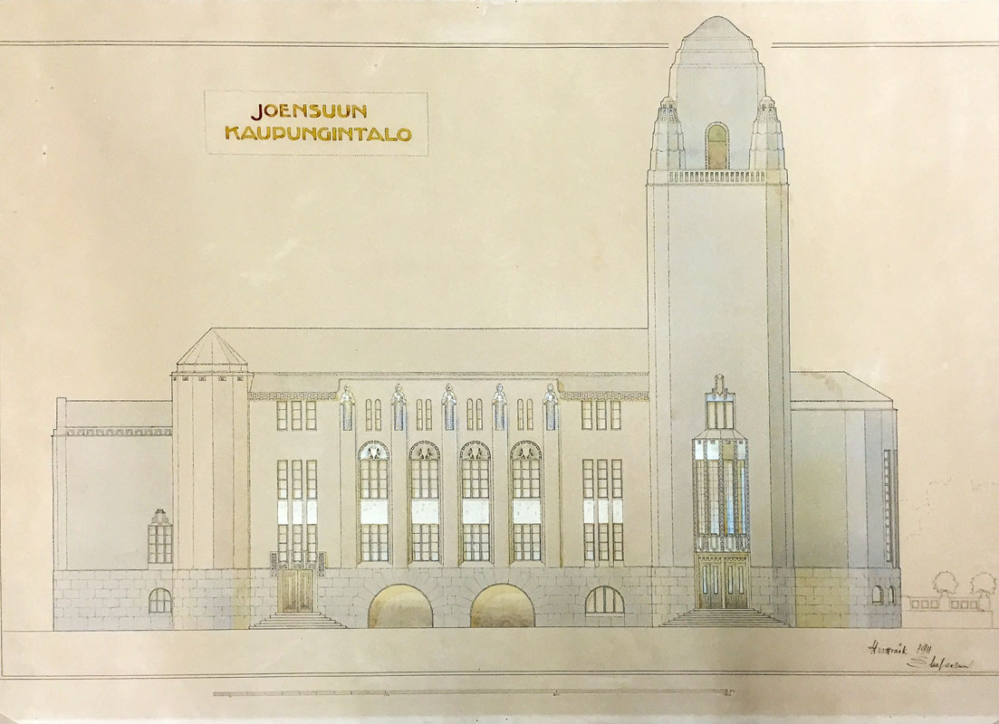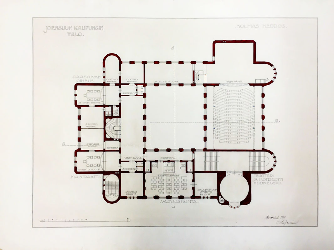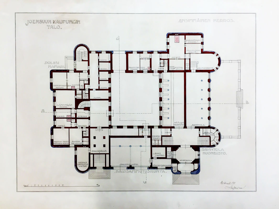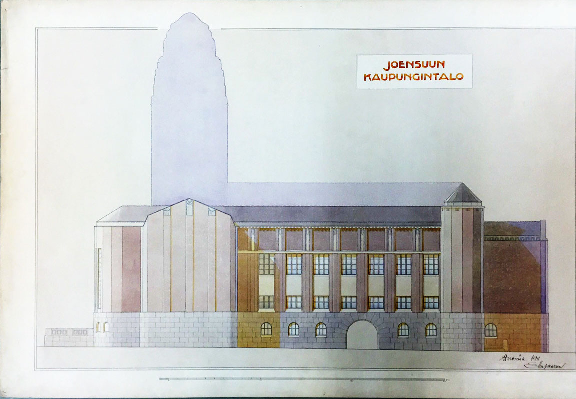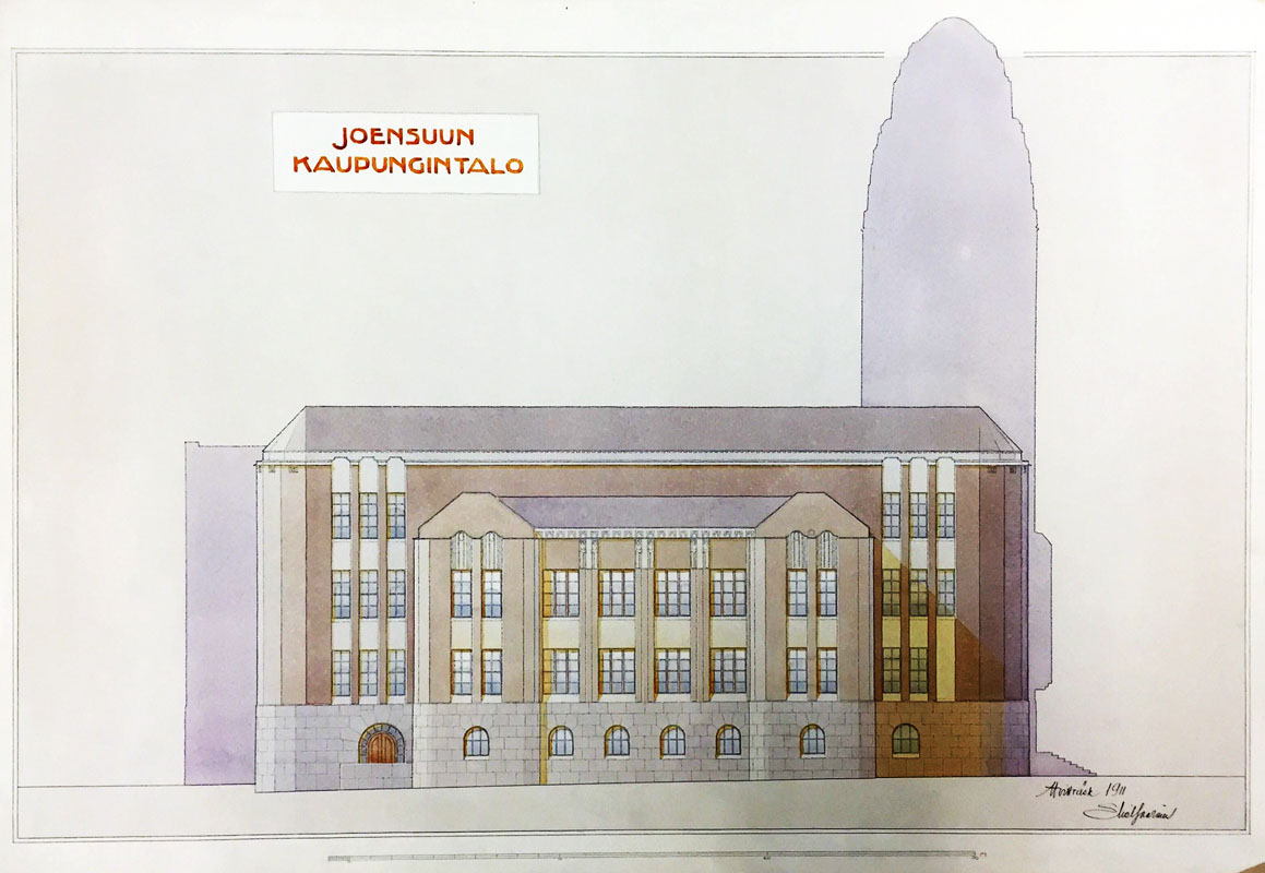 Taustalla muutospiirustus vuodelta 1910, ja alla sen pohjalta tehdyt laveeratut piirustukset vuodelta 1911, joiden mukaan Joensuun kaupungintalo rakennettiin. Piirustukset Joensuun kaupungin keskusarkisto.