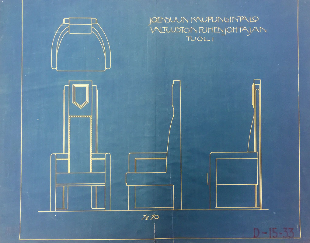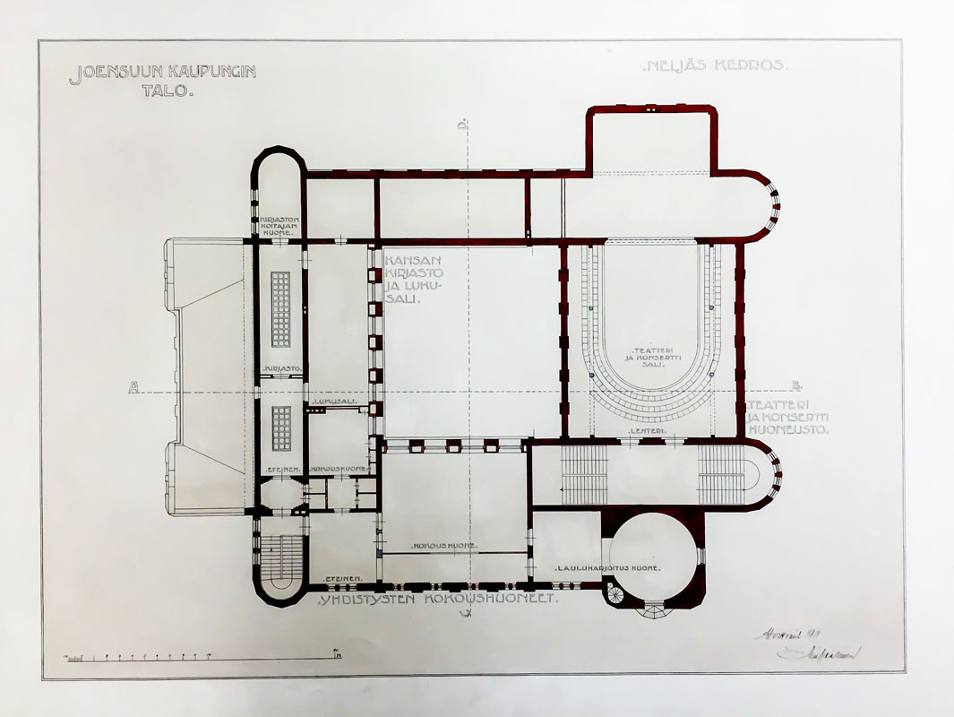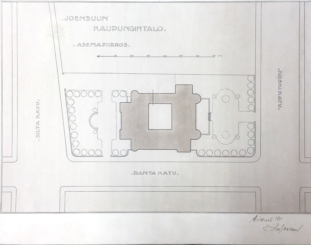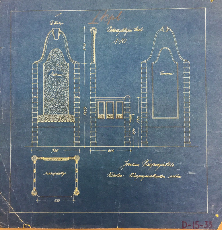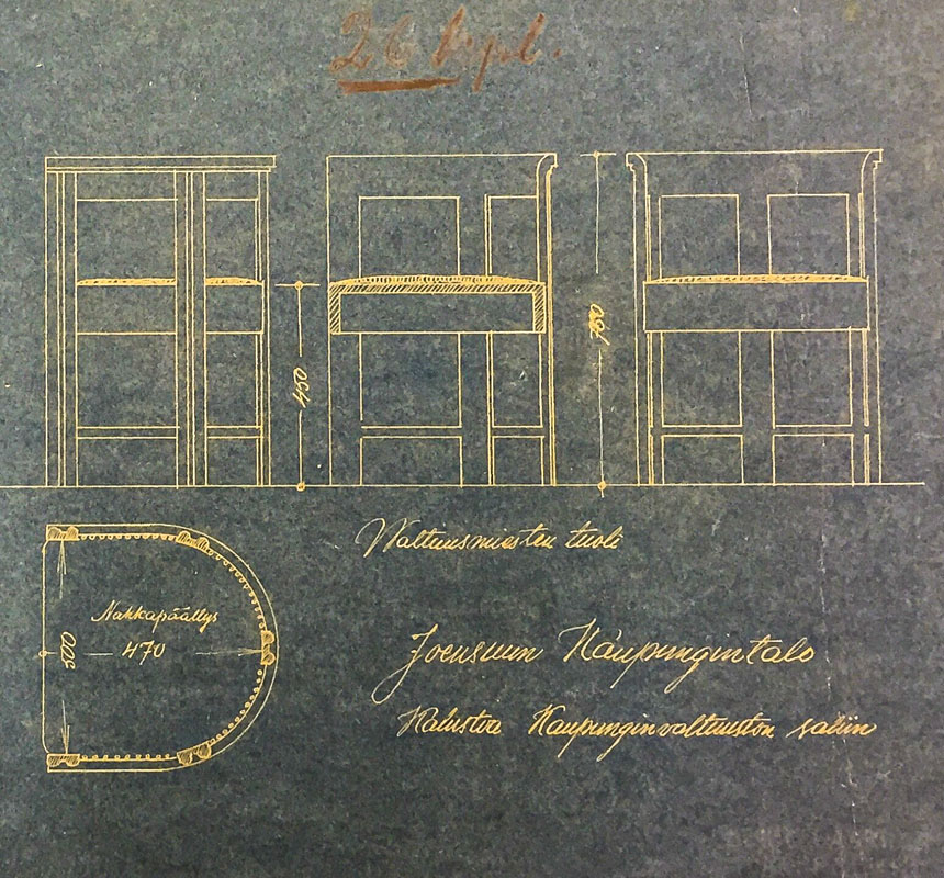 Taustalla muutospiirustus vuodelta 1910, ja alla sen pohjalta tehdyt laveeratut piirustukset vuodelta 1911, joiden mukaan Joensuun kaupungintalo rakennettiin. Piirustukset Joensuun kaupungin keskusarkisto.