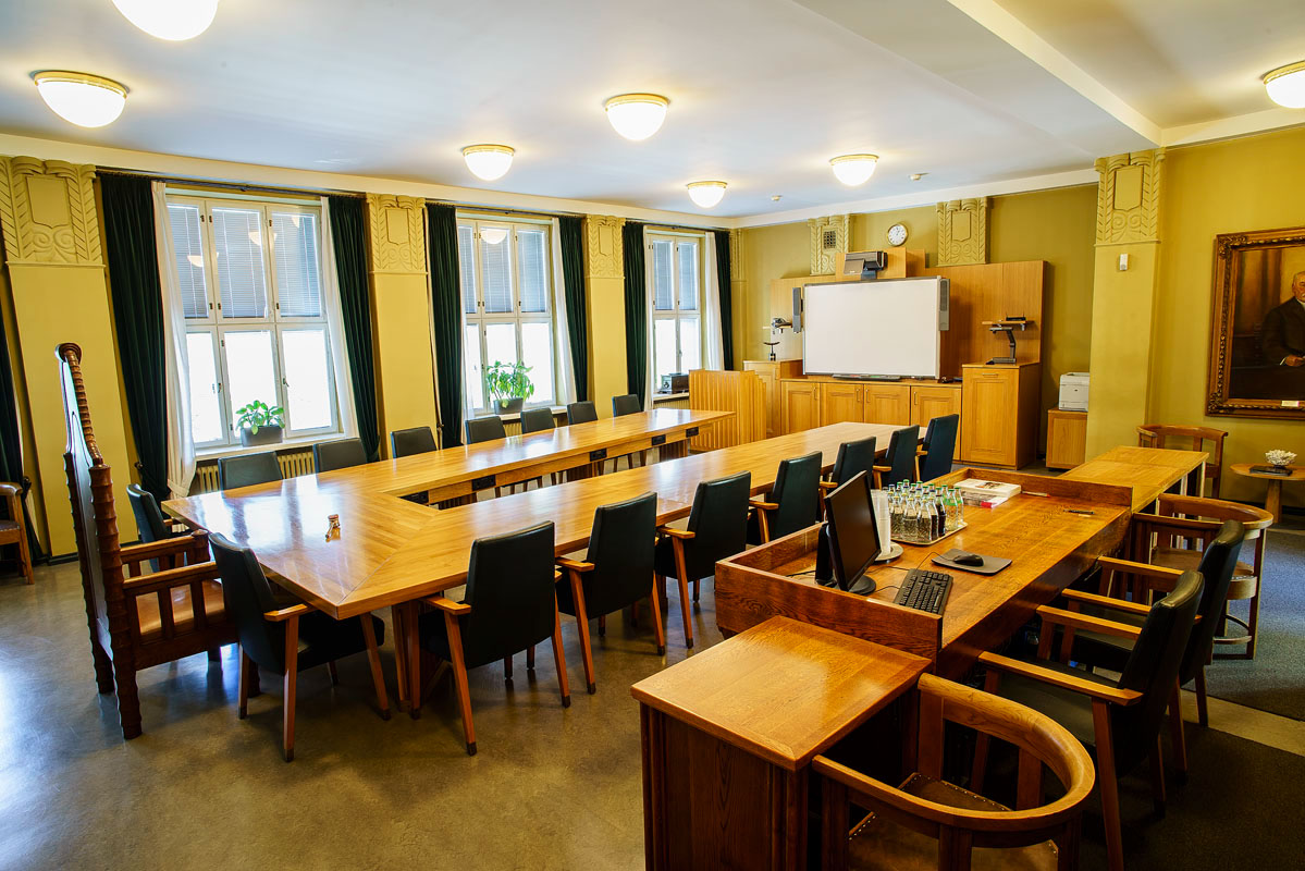 Niin sanottu hallintokäytävä, jonka varrella sijaitsee kaupungin valtuuston sali.