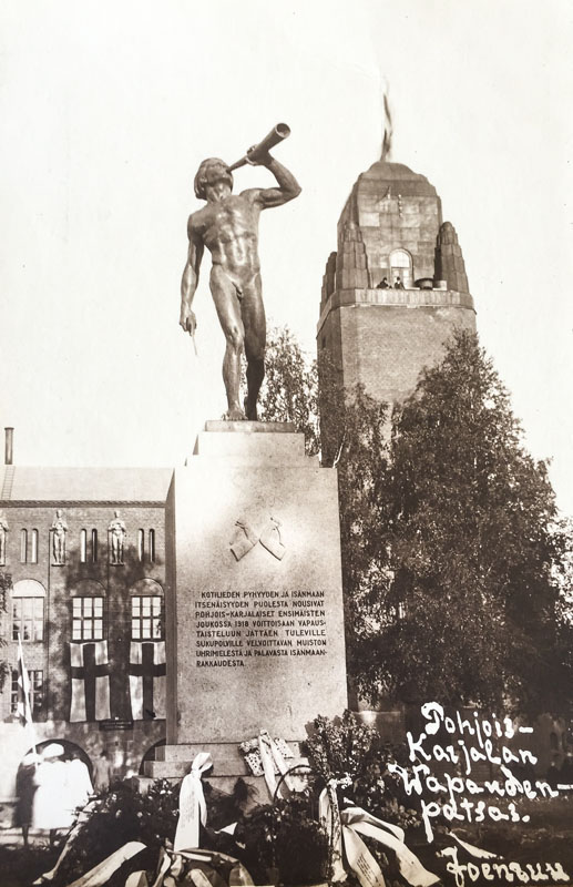 Kuvanveistäjä Yrjö Liipolan suunnittelema vapaudenpatsas. Kuva taustalla on vuodelta 1923, patsaan julkistamistilaisuudesta. Joensuun Vapaudenpuisto, jossa veistos sijaitsee, on olennainen osa Kaupungintaloa. Yrjö Liipolan Viestintuoja toitottaa jatkuvaan vapaustaistoon. Kuva Pasi Tuunaisen postikorttikokoelma.