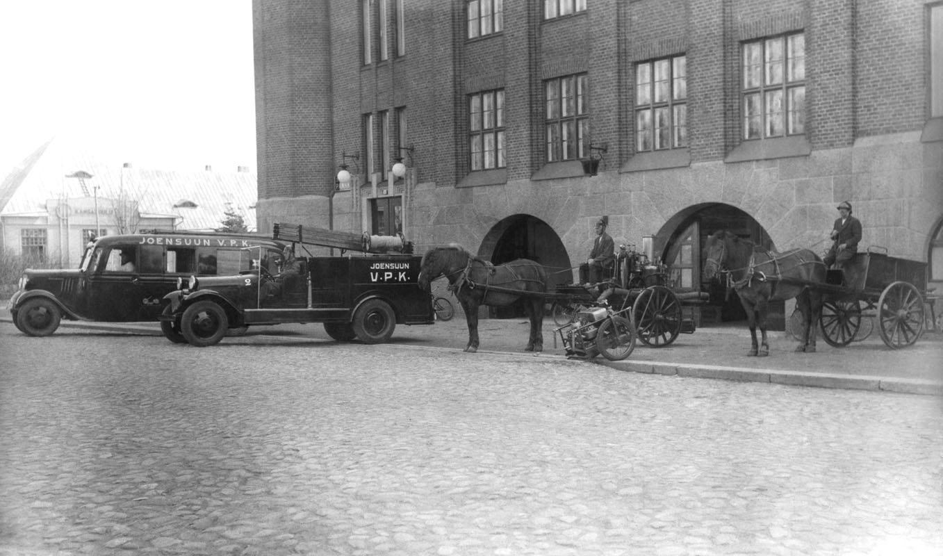 Palolaitos sai toimitilat talon kivijalasta. Torni tarvittiin letkujen kuivatuksessa, mutta se oli myös maamerkki. Tornissa näkyvät edelleen palon jäljet. Taustalla Lars Sonckin suunnittelema Joensuun vanha kansakoulu, joka purettiin Piimälinnan alta.
