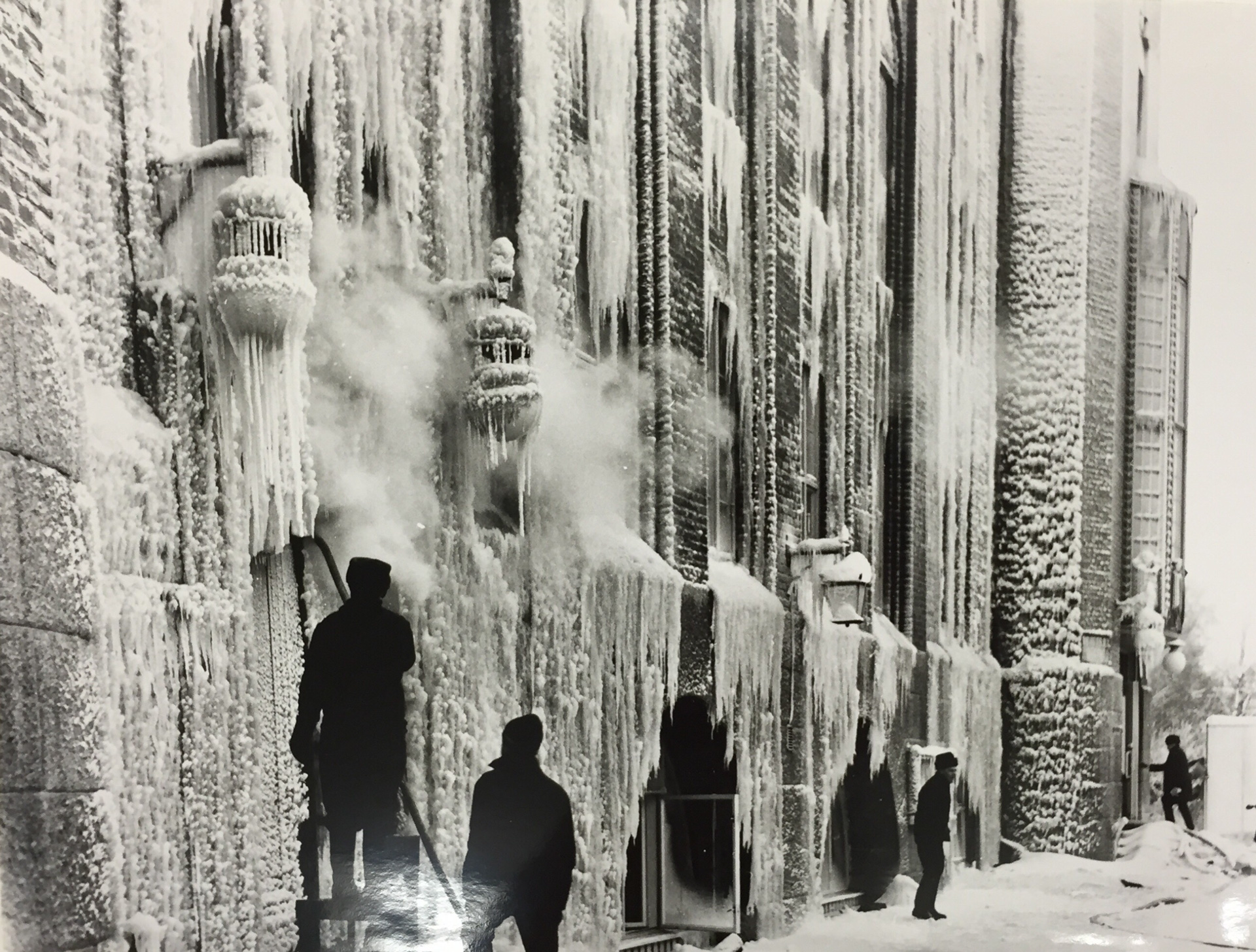 Sammutusvesi jäätyi julkisivujen pinnoille. Kuva Karjalaisen arkisto.