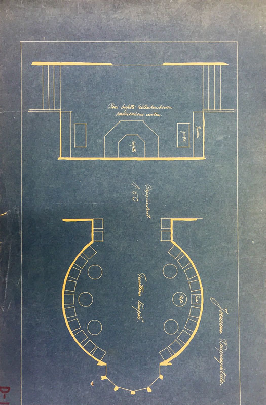 Lämpiön pohjapiirustus ja kolmannen kerroksen lehterin "buffettipöytä". Piirustuksissa lukee, että buffetti on koululaisia varten.