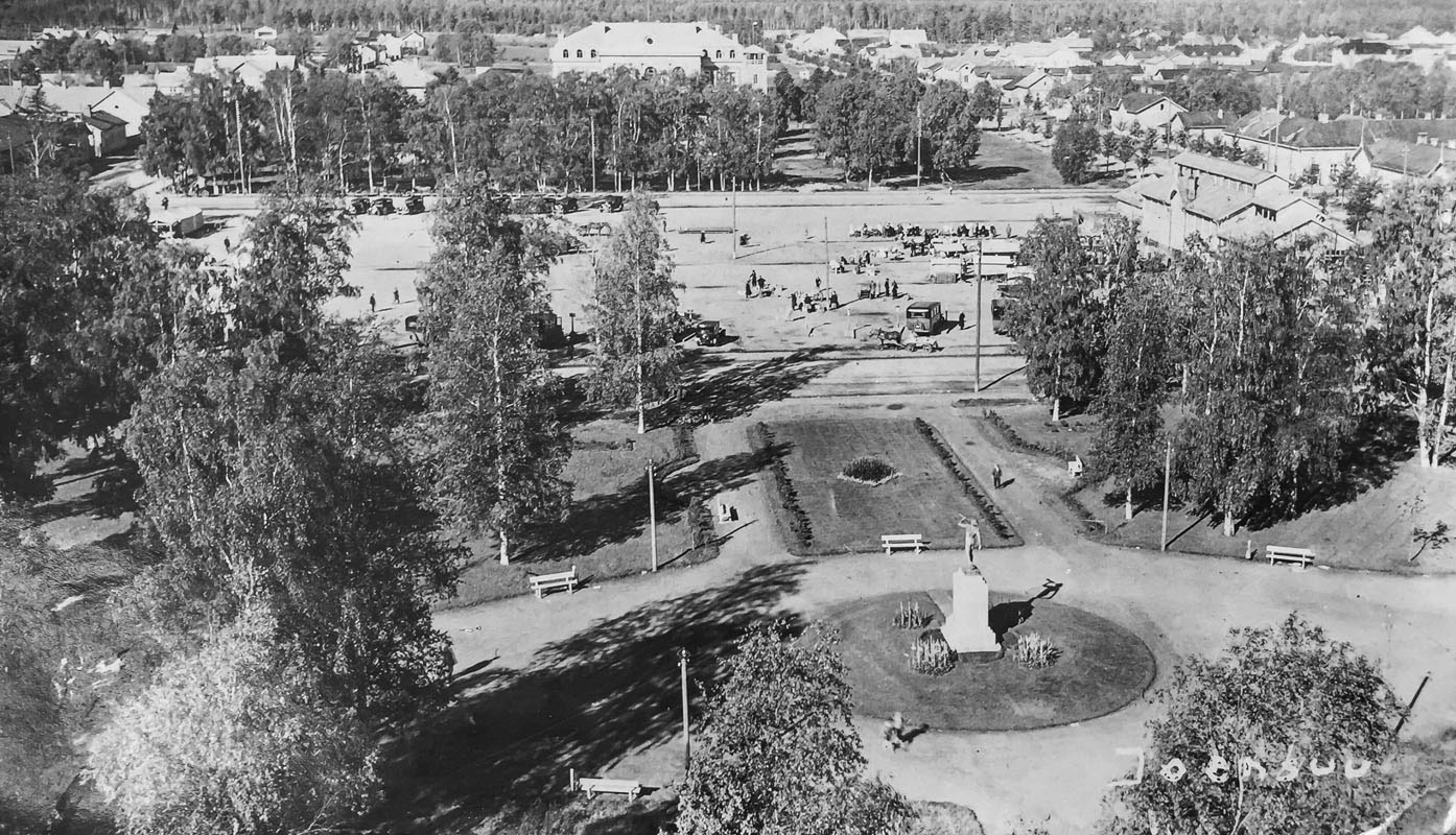Näkymä kaupungintalon tornista pohjoiseen. Kuva 1940-luvun alusta. Kuva Pasi Tuunaisen postikorttikokoelma.